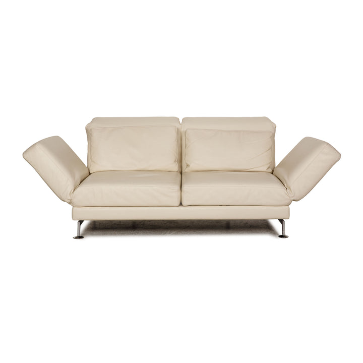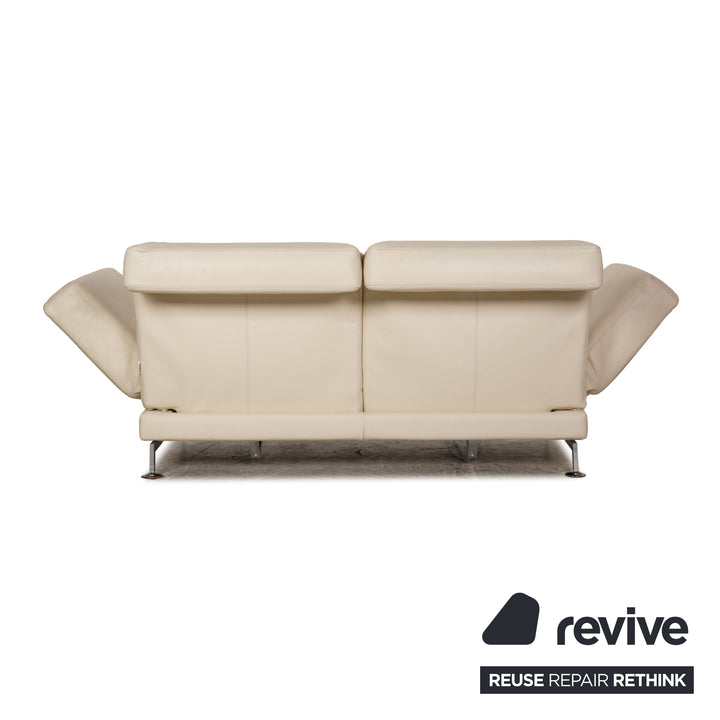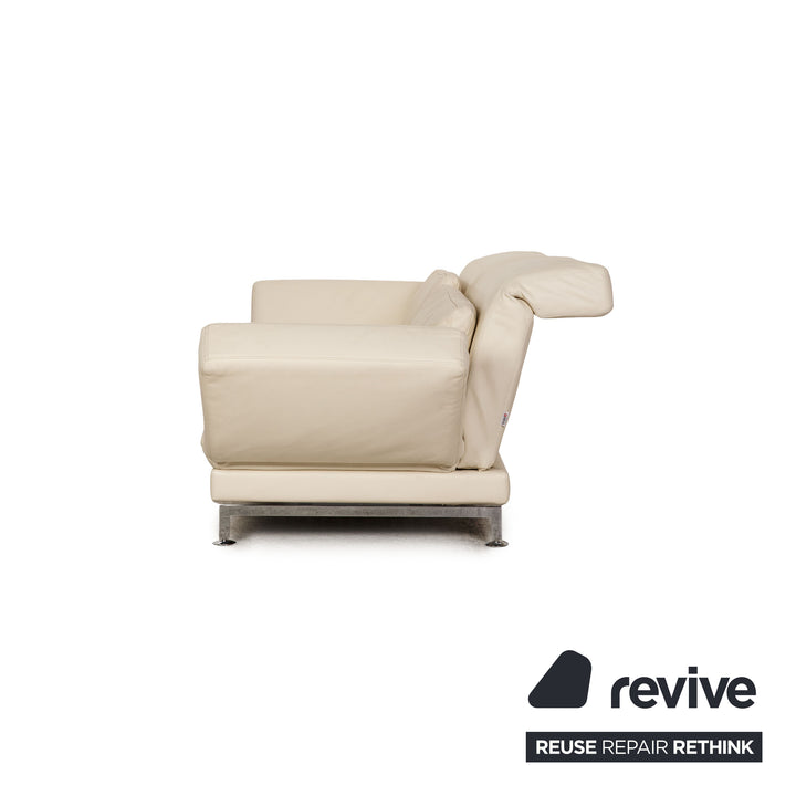 Le canapé Brühl et Sippold Moule repose sur des pieds chromés et est recouvert de cuir véritable de couleur crème. Les dossiers sont mobiles, les dossiers peuvent être rabattus pour former un plan de couchage, ce qui permet de placer le canapé en position de relaxation.