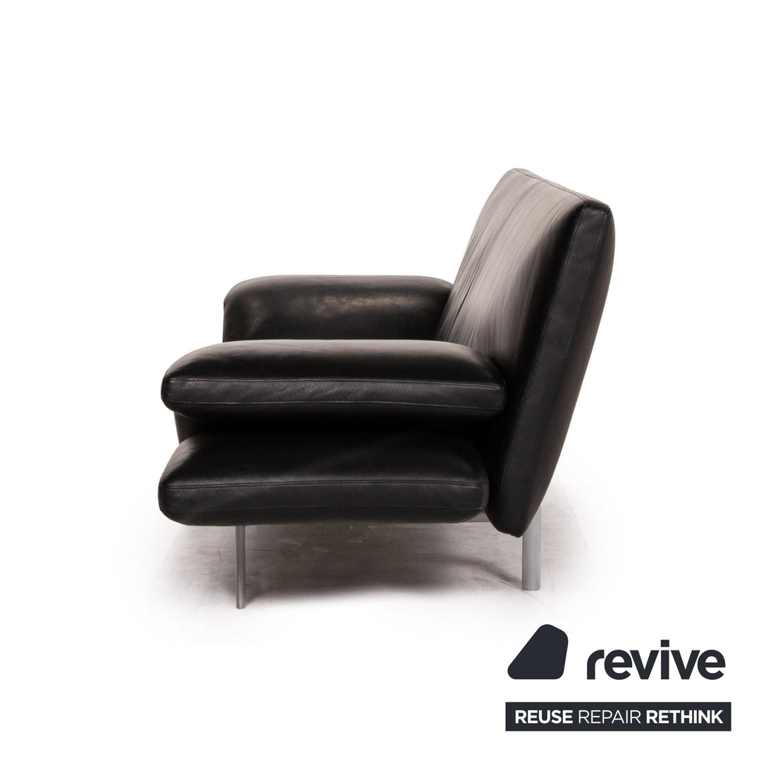 Le canapé Flyer de Designo est recouvert de cuir véritable noir et repose sur une structure en métal mat. La forme particulière est caractérisée par les ailes sous les accoudoirs. Ceux-ci peuvent être transformés en sections de pieds pour plus de confort.