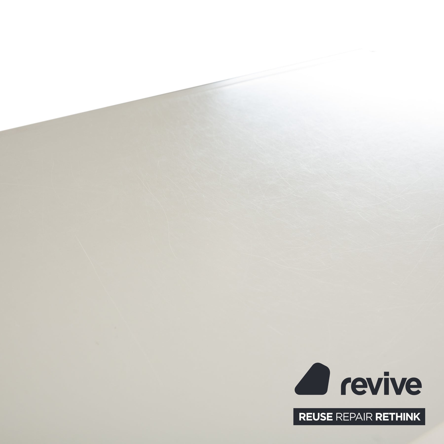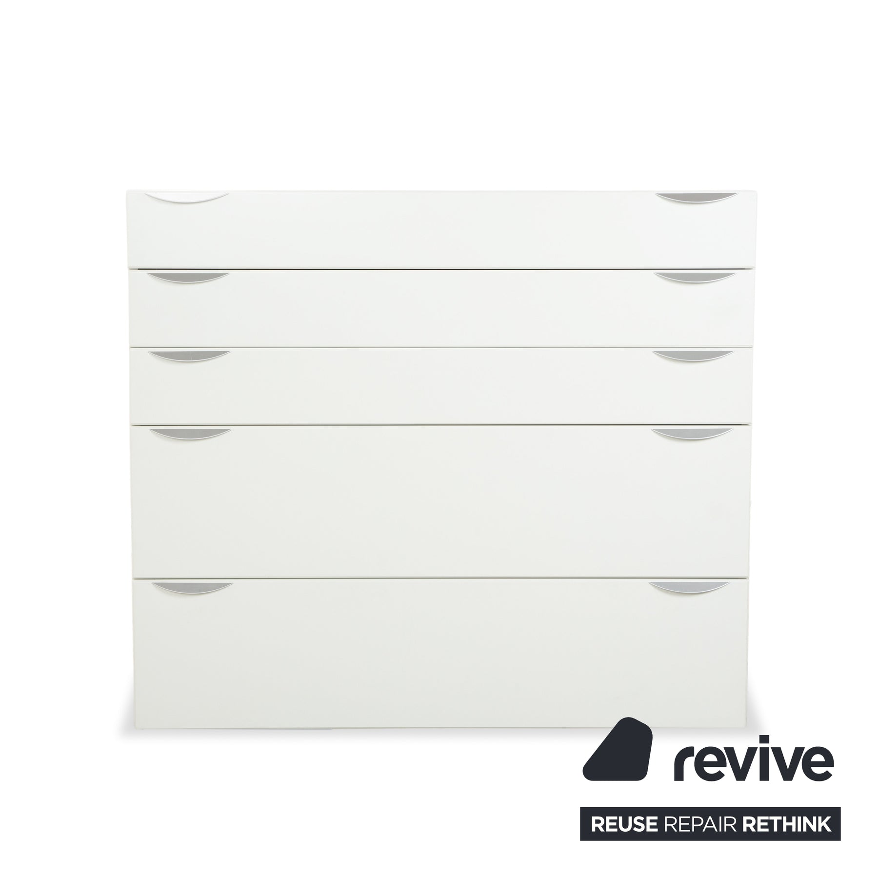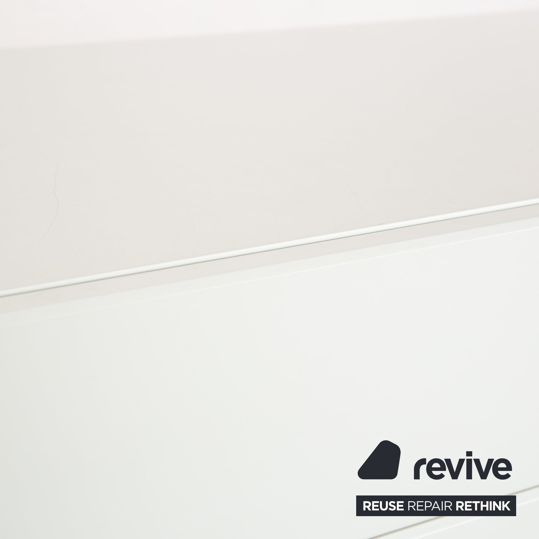 Das Interlübke Cube Sideboard ist ein kompaktes Stauraummöbel mit klarer, reduzierter Formensprache. Der Korpus ist in mattem Weiß ausgeführt. Zudem verfügt er über einige Schubladen, die mit silbernen Griffen versehen sind.