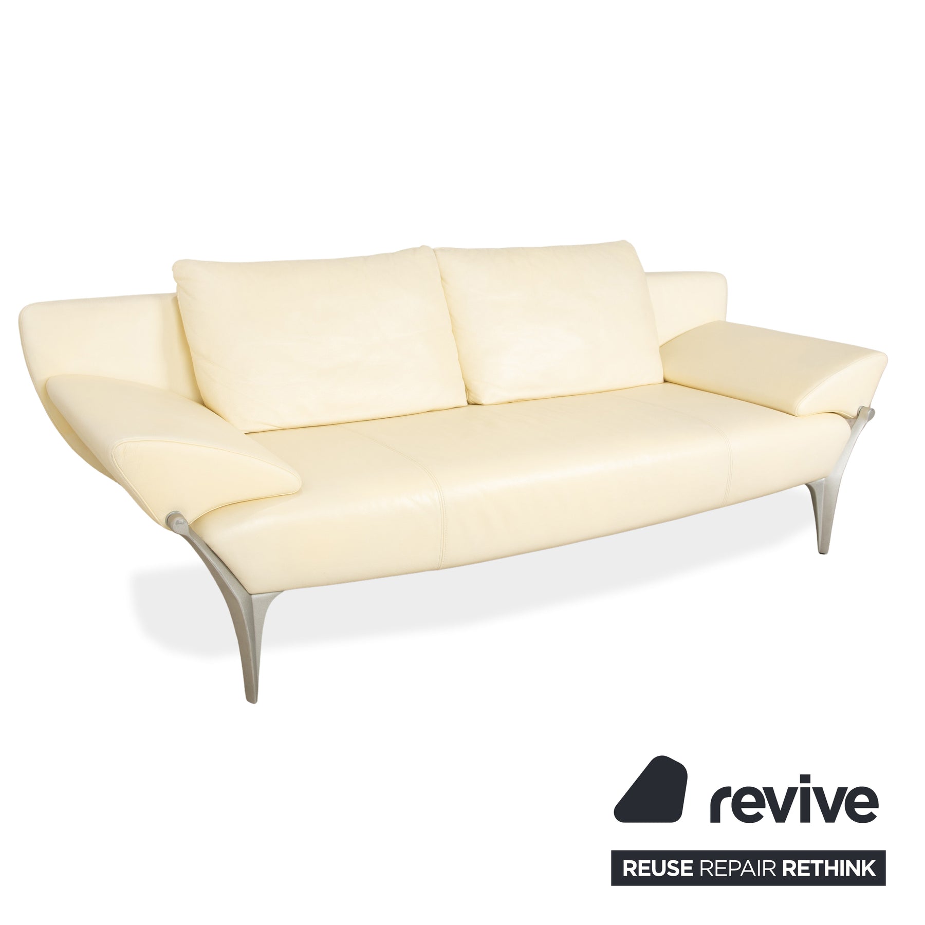 Das Dreisitzer Sofa Modell 1600 von Rolf Benz ist mit einem cremefarbenen Echtleder bezogen und steht auf dynamisch geformten, matten Metallfüßen. Das Sofa zeichnet sich besonders durch sein futuristisches Design aus. Die Armlehnen können manuell verstell werden, was zusätzlichen Komfort bietet.