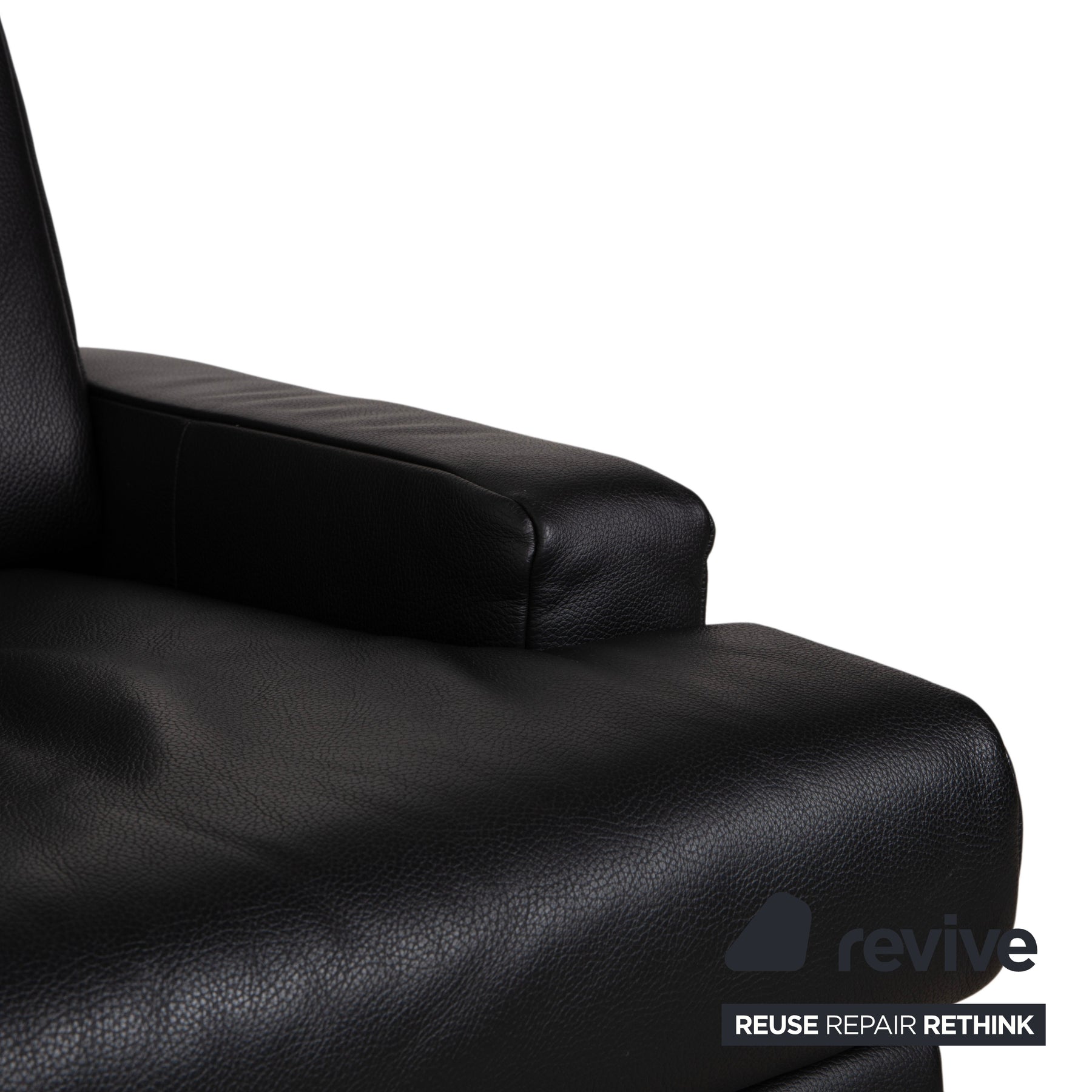 Der Sessel ist rundum in hochwertiges, schwarzes Leder gehüllt. Die Oberfläche wirkt dick und widerstandsfähig, typisch für die langlebige Qualität von Rolf Benz aus dieser Ära. Das Design ist streng geometrisch und maskulin: