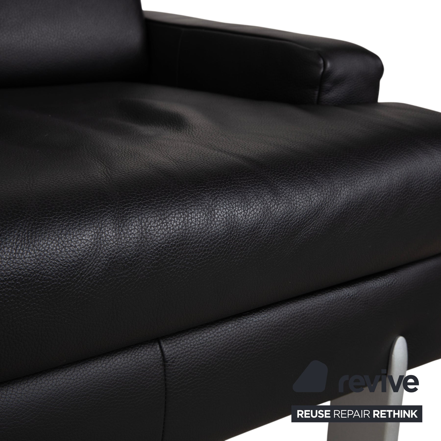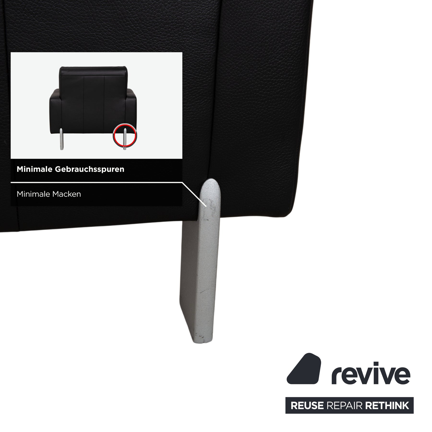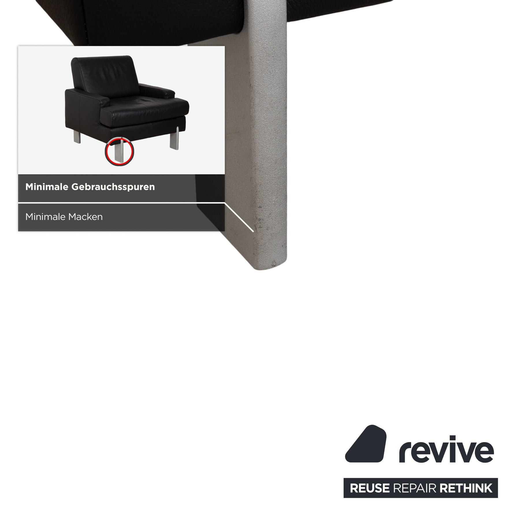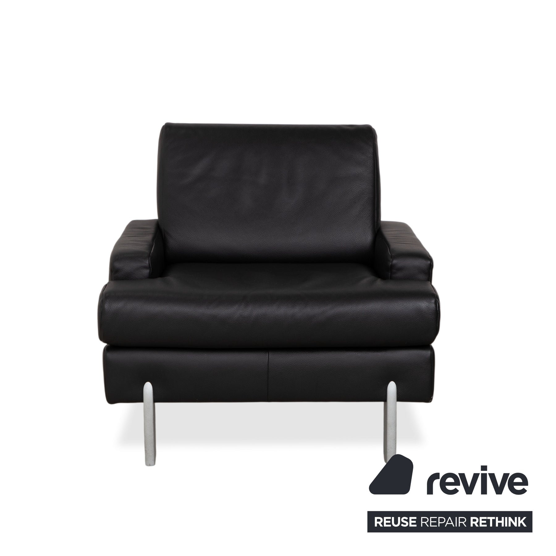 • Die Basis: Getragen wird der Sessel von silbernen Metallfüßen, die an den Ecken platziert sind. Sie bilden einen kühlen Kontrast zum schwarzen Leder und sorgen für einen festen Stand.