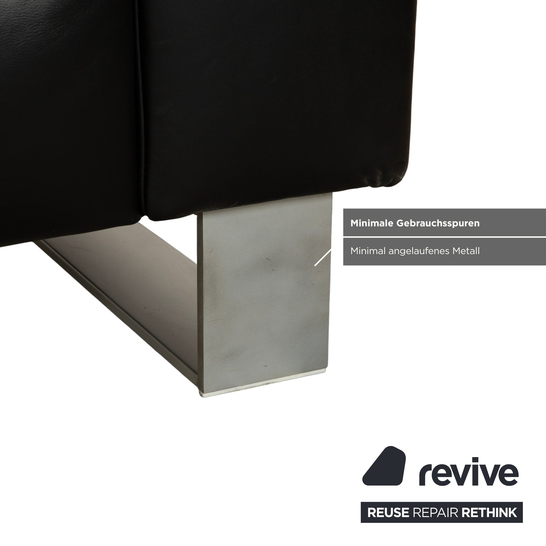 Das unverwechselbare Design-Element sind die massiven silbernen Metallwangen an den Seiten. Sie ersetzen klassische Füße und lassen den schweren Lederkorpus wie eine architektonische Platte im Raum stehen.