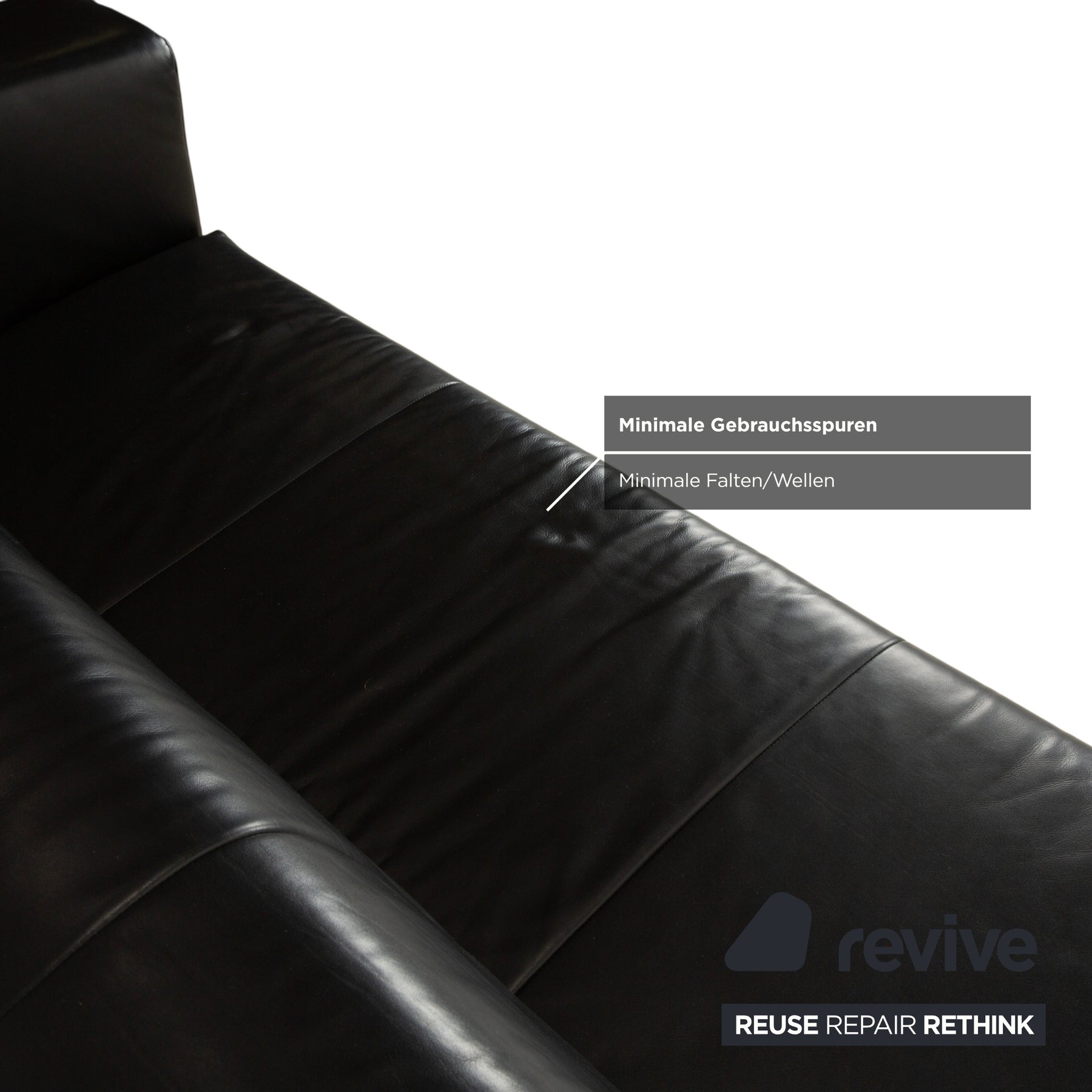 Das schwarze, robuste Leder bestimmt den Charakter: Es wirkt maskulin, kühl und absolut zeitlos. Die Formsprache bleibt kompromisslos kubisch, mit breiten Armlehnen und einer klaren Gliederung der Polster in drei Segmente, die dem Möbelstück Struktur geben.