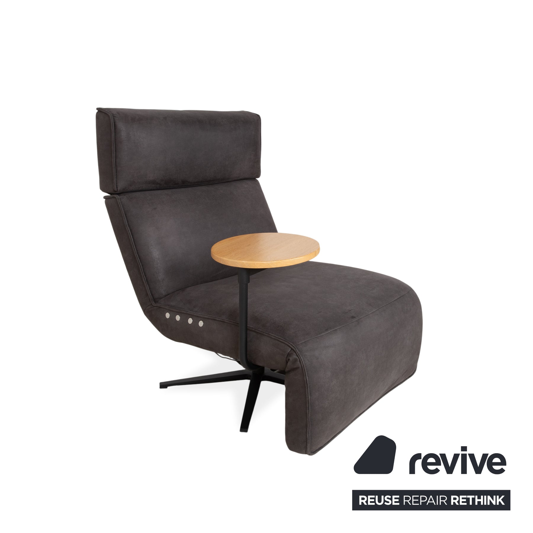 Autre atout : la tablette latérale pivotante intégrée, en bois élégant, fixée à un bras métallique noir discret. Son plateau pivote avec souplesse, offrant ainsi une surface pratique face à l’utilisateur ou pouvant être facilement tourné sur le côté d’un seul geste.