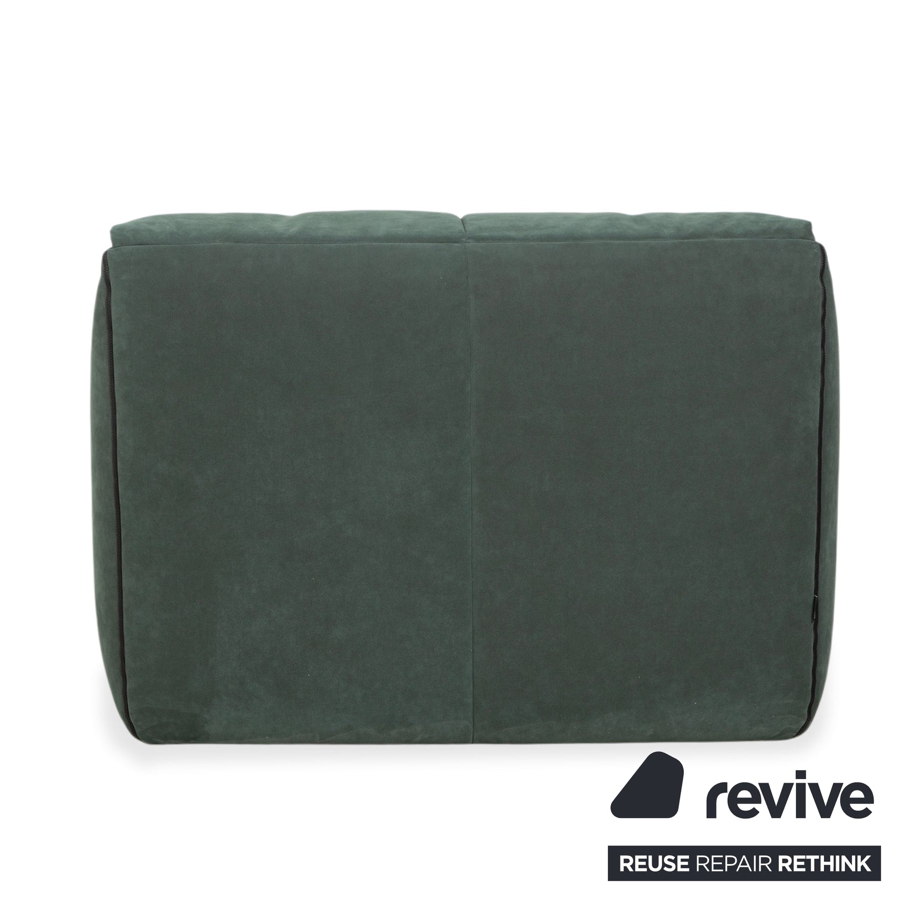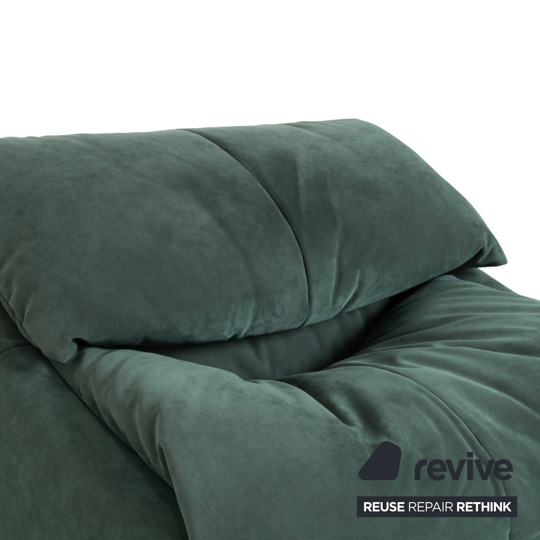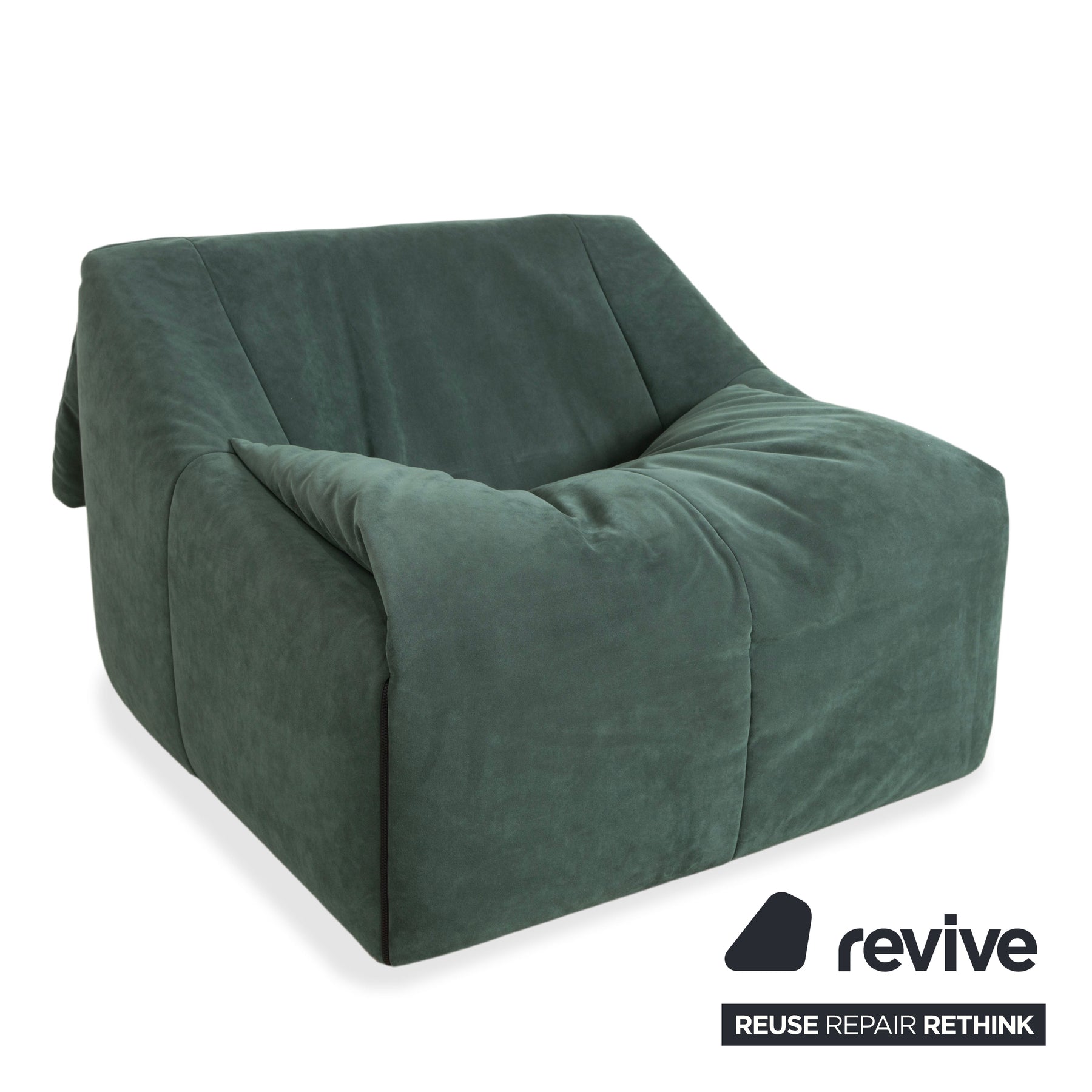 Der Sessel ist in einen hochwertigen Stoff in einem gedämpften Grün (ein Salbei- oder Tannen-Ton) gehüllt. Der Stoff wirkt weich, fast samtig, was die einladende Optik des Möbels perfekt unterstreicht. Das Design ist unverwechselbar: Der Sessel besteht optisch aus übereinander gefalteten, riesigen Kissen. Diese Schichtbauweise nimmt dem kubischen Block die Strenge und verspricht ein wolkenweiches Sitzgefühl.