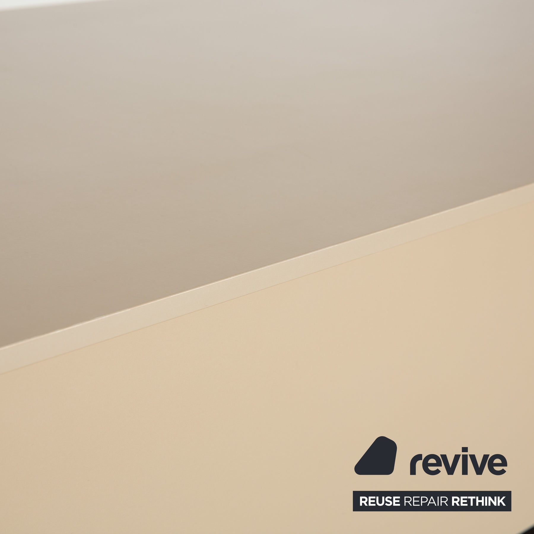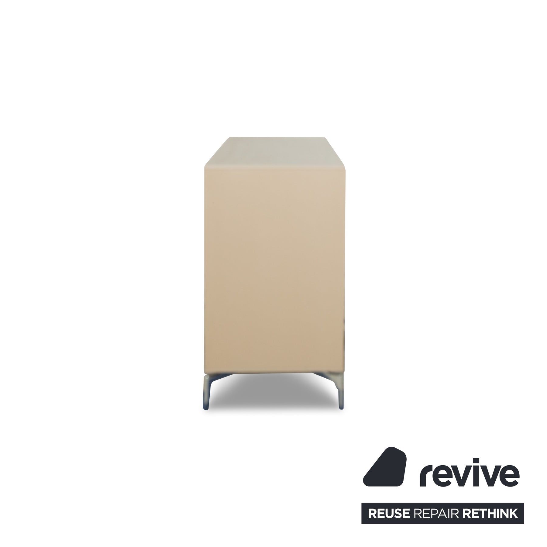 Le buffet Slot de Christine Kröncke est un véritable atout dans le salon moderne, le bureau ou même dans le couloir comme premier accroche-regard en entrant dans l'appartement. Fabriqué en bois beige avec une finition mate, le corps de ce buffet haut est monté sur des pieds métalliques étroits et inclinés et offre non seulement beaucoup d'espace de rangement à l'intérieur (deux grands tiroirs et un élément d'armoire avec un séparateur), mais dispose également d'un éclairage indirect qui met en valeur avec élégance le compartiment ouvert.