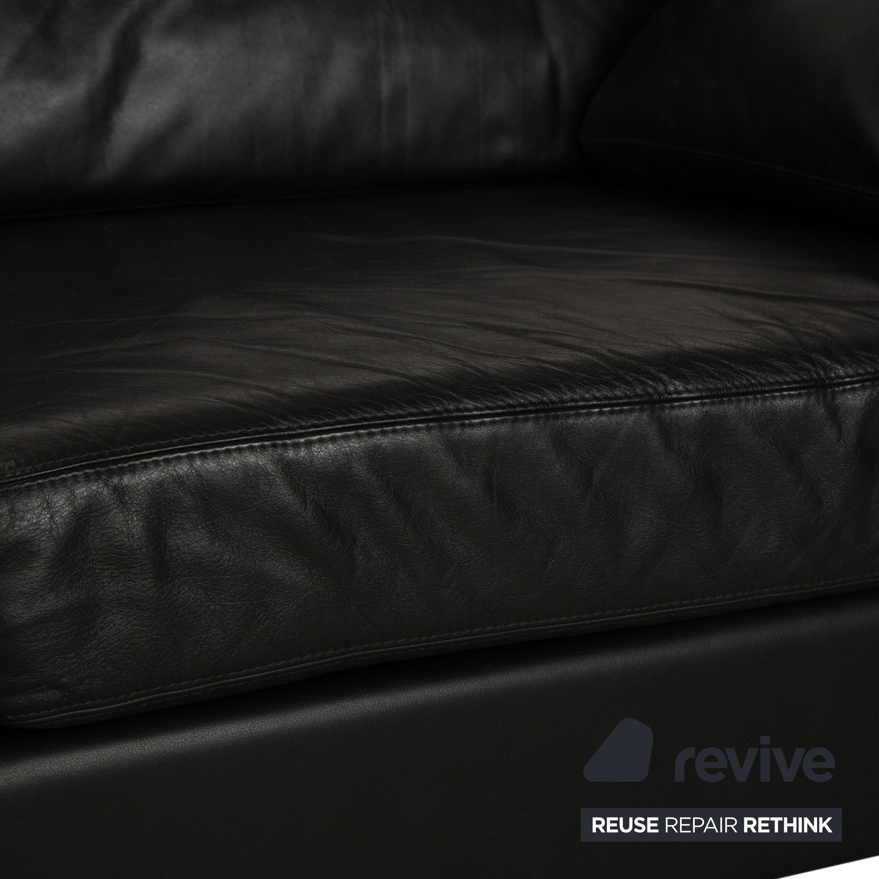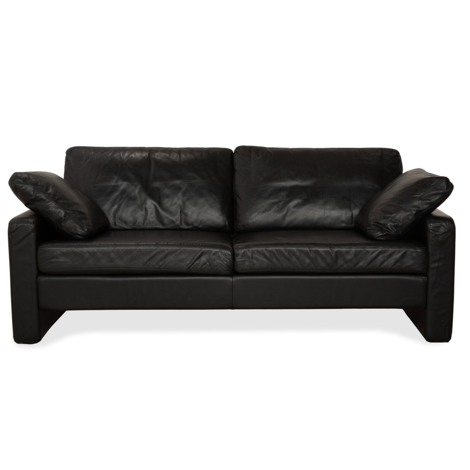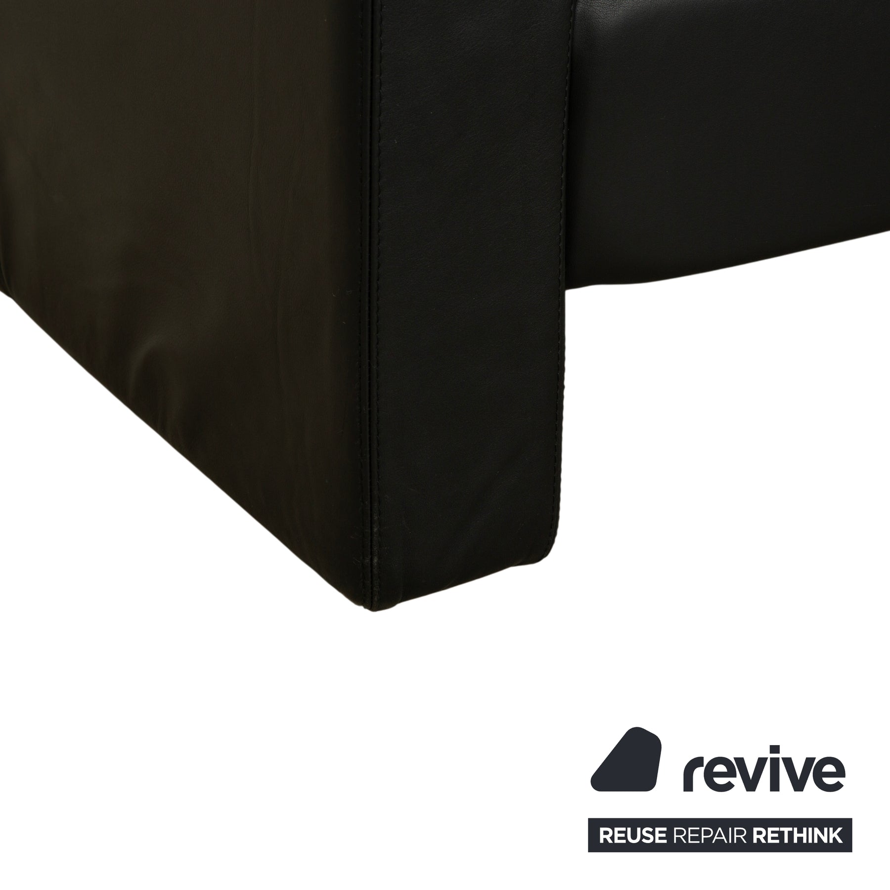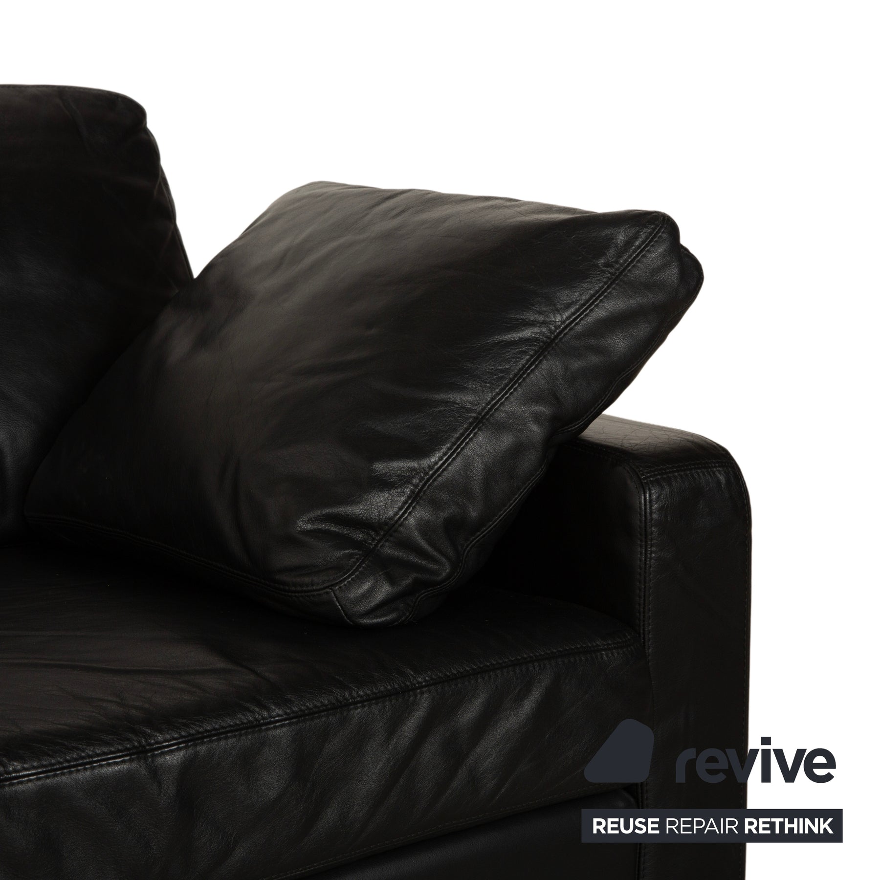 Ce canapé compact deux places est présenté ici en cuir noir, lui conférant une allure élégante et résolument sophistiquée. Malgré sa forme épurée, presque cubique, il n'a rien d'austère : les coussins de dossier amovibles et surtout les coussins d'accoudoirs moelleux adoucissent ses lignes géométriques. Ils créent une allure décontractée qui inspire immédiatement le confort et adoucit la structure par ailleurs stricte.
