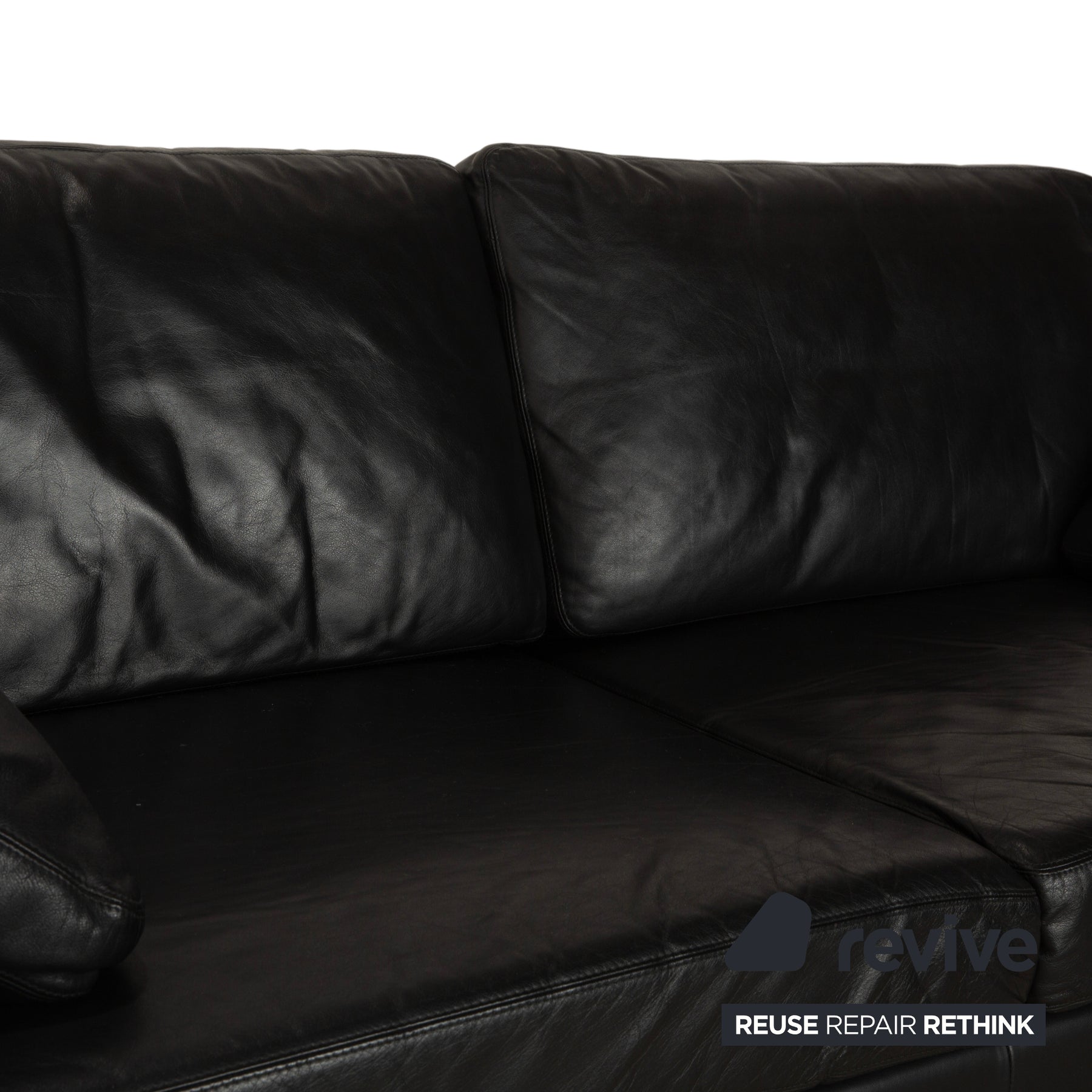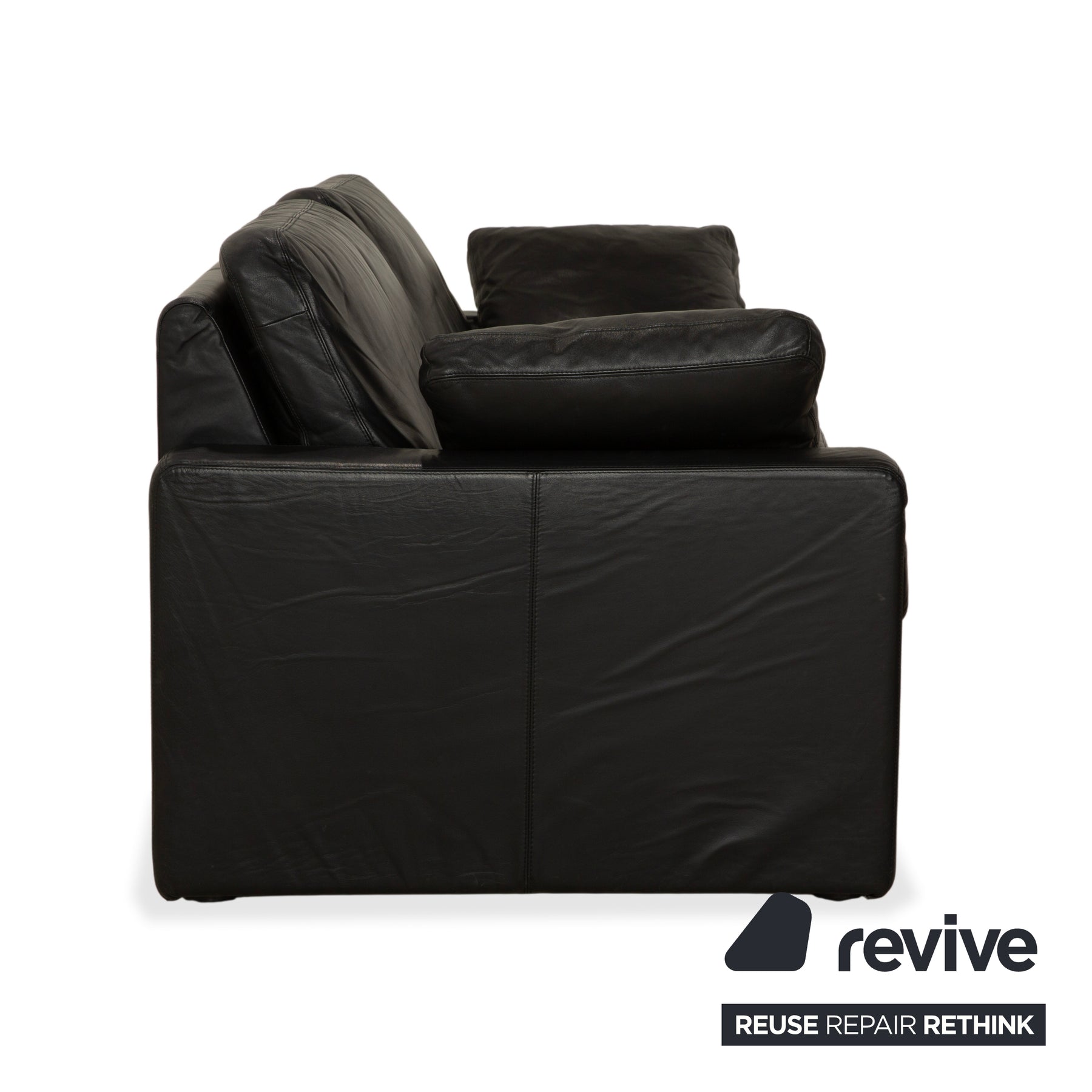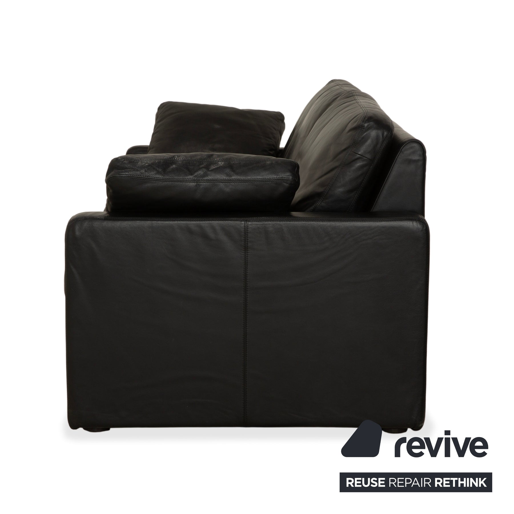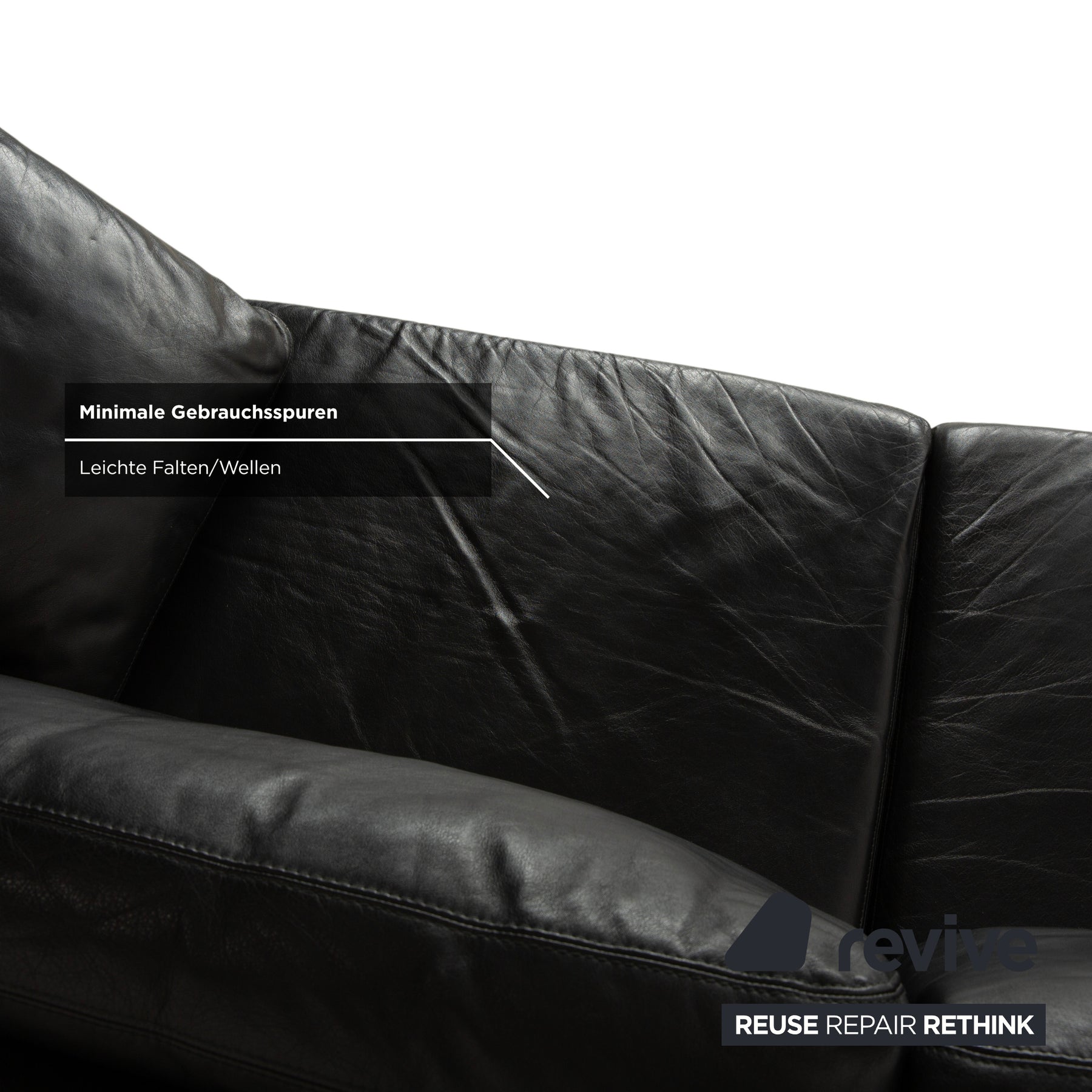 Ce canapé compact deux places est présenté ici en cuir noir, lui conférant une allure élégante et résolument sophistiquée. Malgré sa forme épurée, presque cubique, il n'a rien d'austère : les coussins de dossier amovibles et surtout les coussins d'accoudoirs moelleux adoucissent ses lignes géométriques. Ils créent une allure décontractée qui inspire immédiatement le confort et adoucit la structure par ailleurs stricte.
