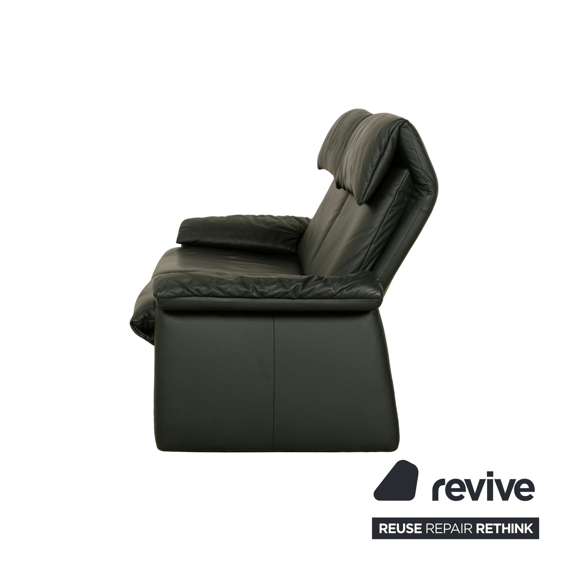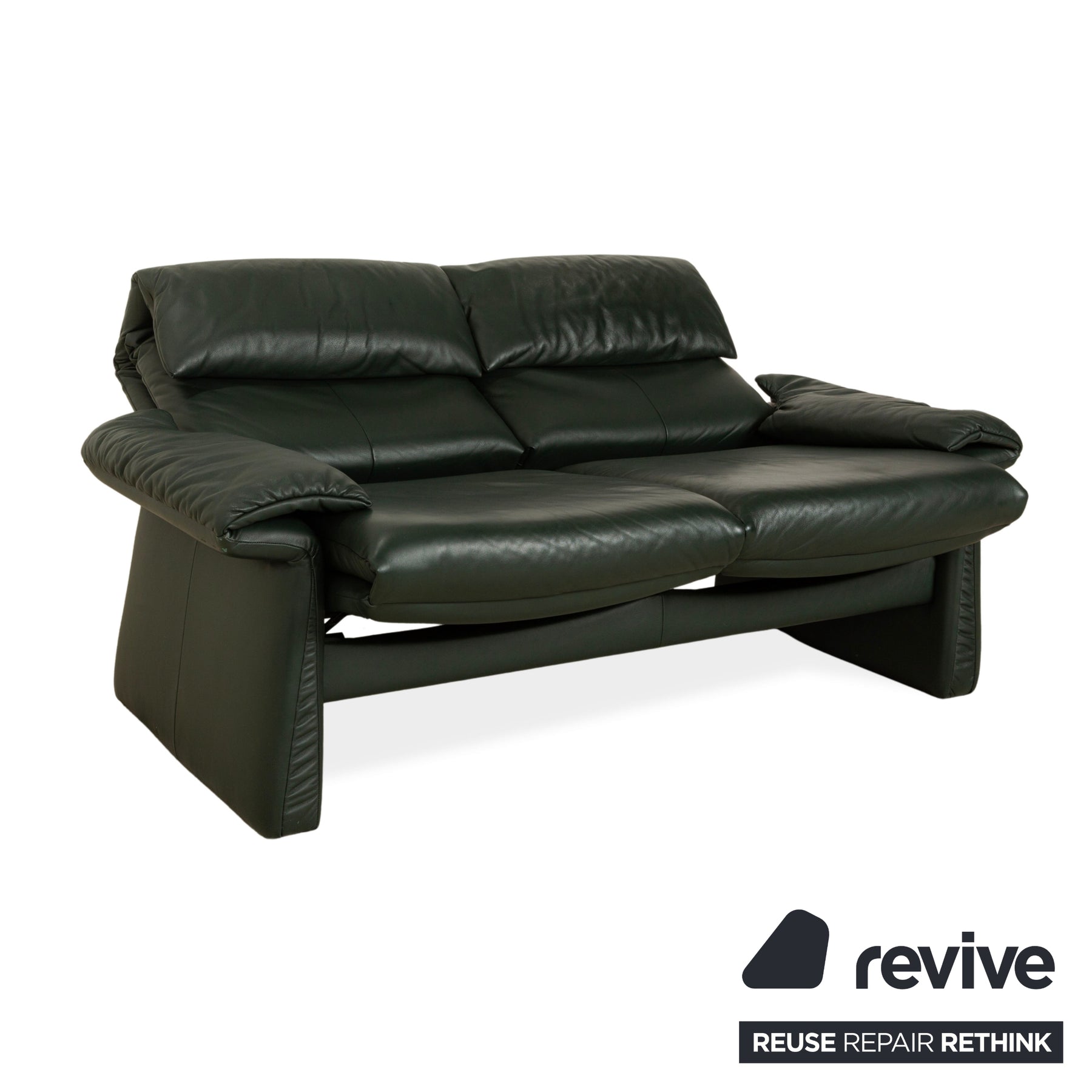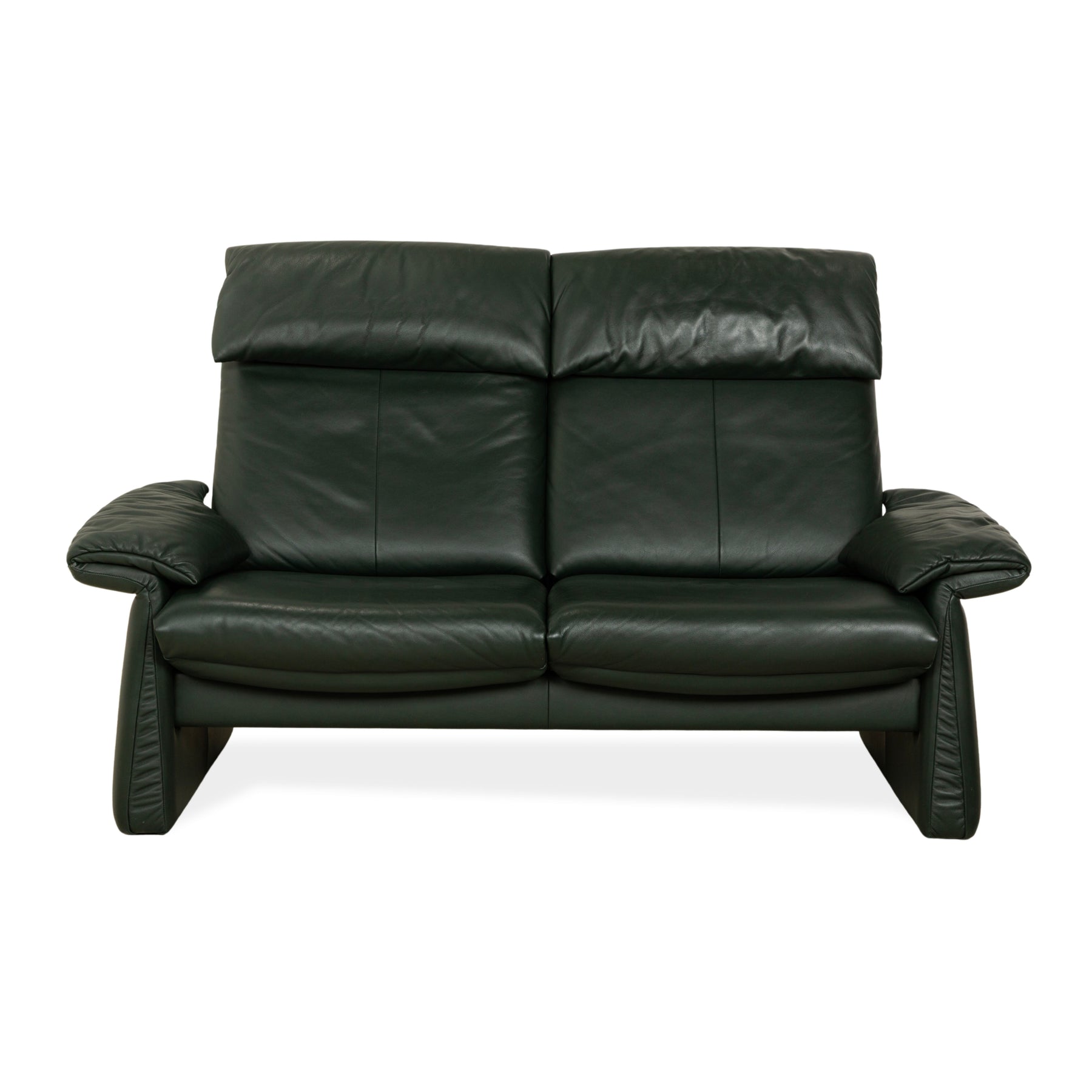 Le canapé deux places Lugano d'Erpo est revêtu de cuir véritable vert foncé et repose sur des côtés longitudinaux. Il se distingue par son design classique et sa fonction inclinable pratique.