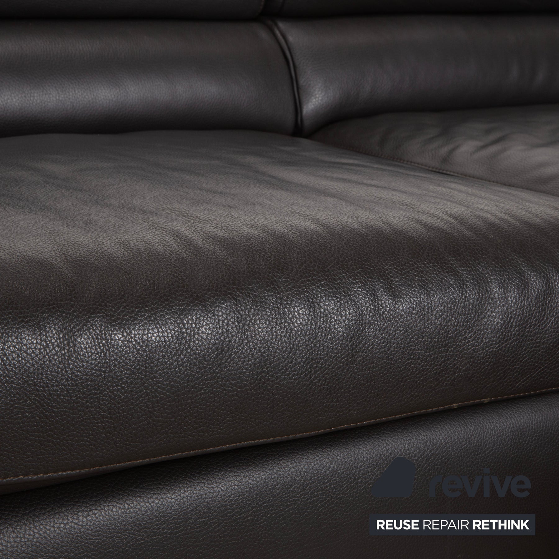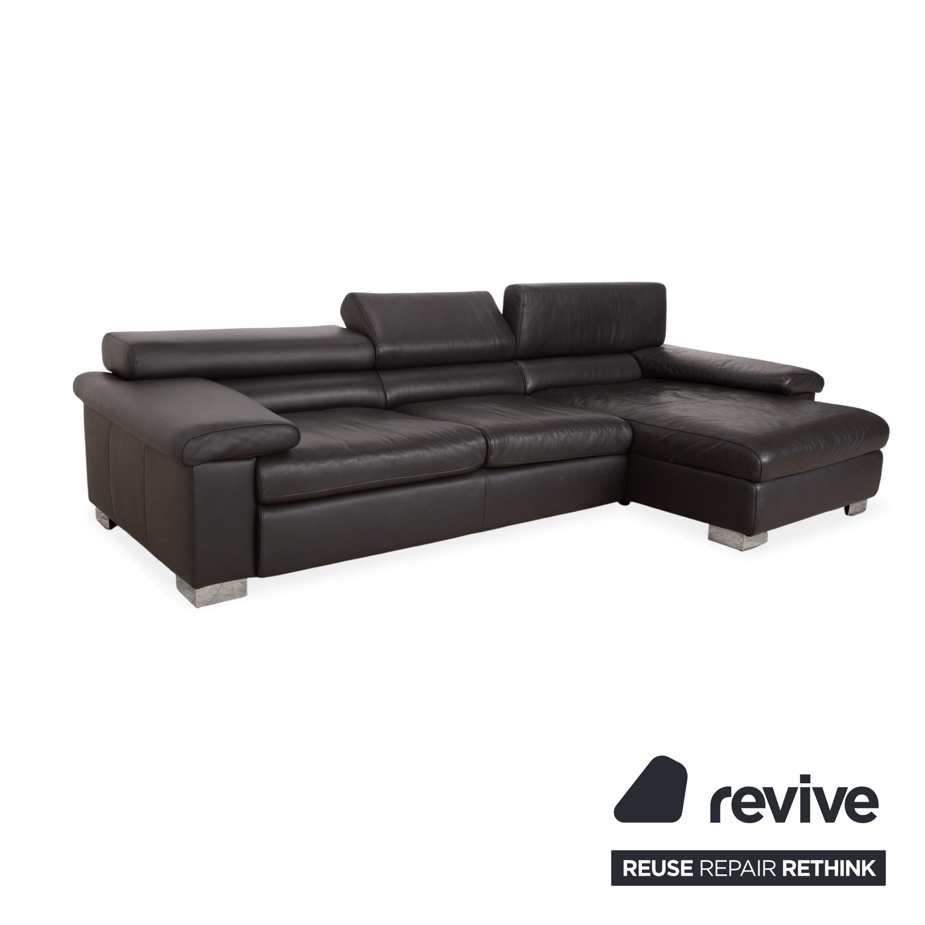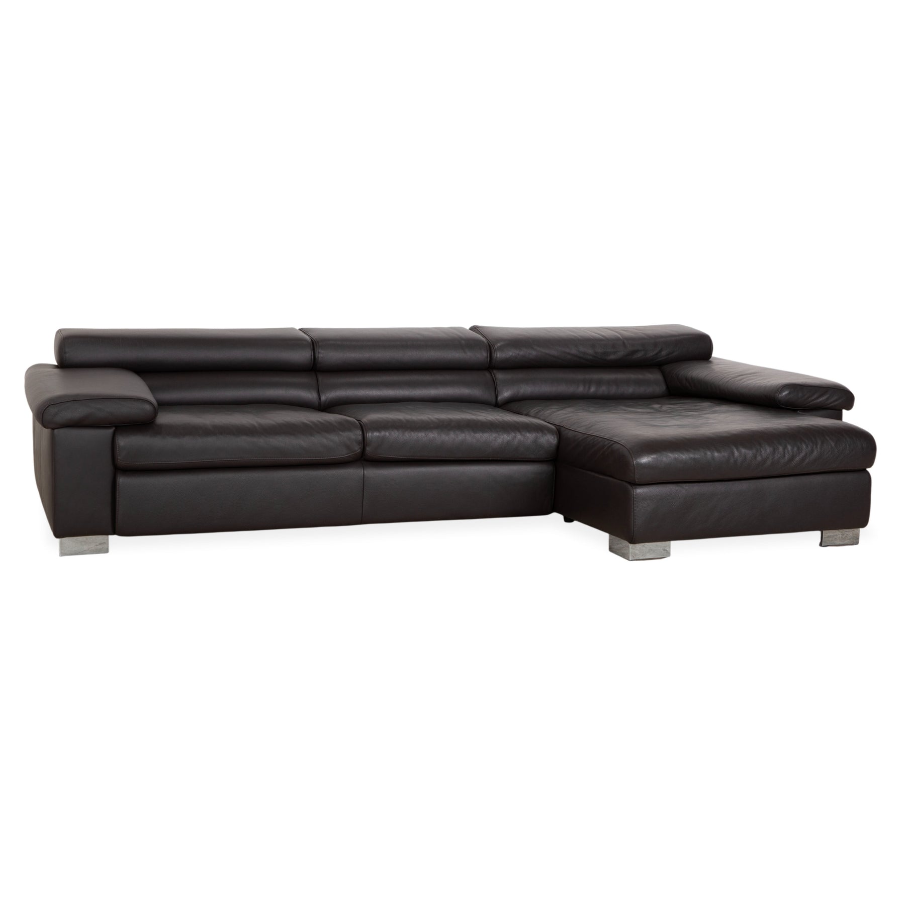 Le canapé est revêtu d'un cuir véritable de haute qualité, d'un brun foncé profond et riche. Cette couleur dégage une chaleur et un confort exceptionnels, et se révèle plus douce et accueillante que le noir austère. Le toucher naturel du cuir garantit sa durabilité et une température agréable en toute saison. Les pieds massifs chromés offrent un contraste moderne et épuré : ils assurent la stabilité du canapé tout en conférant à son design volumineux une allure à la fois élégante et aérienne.