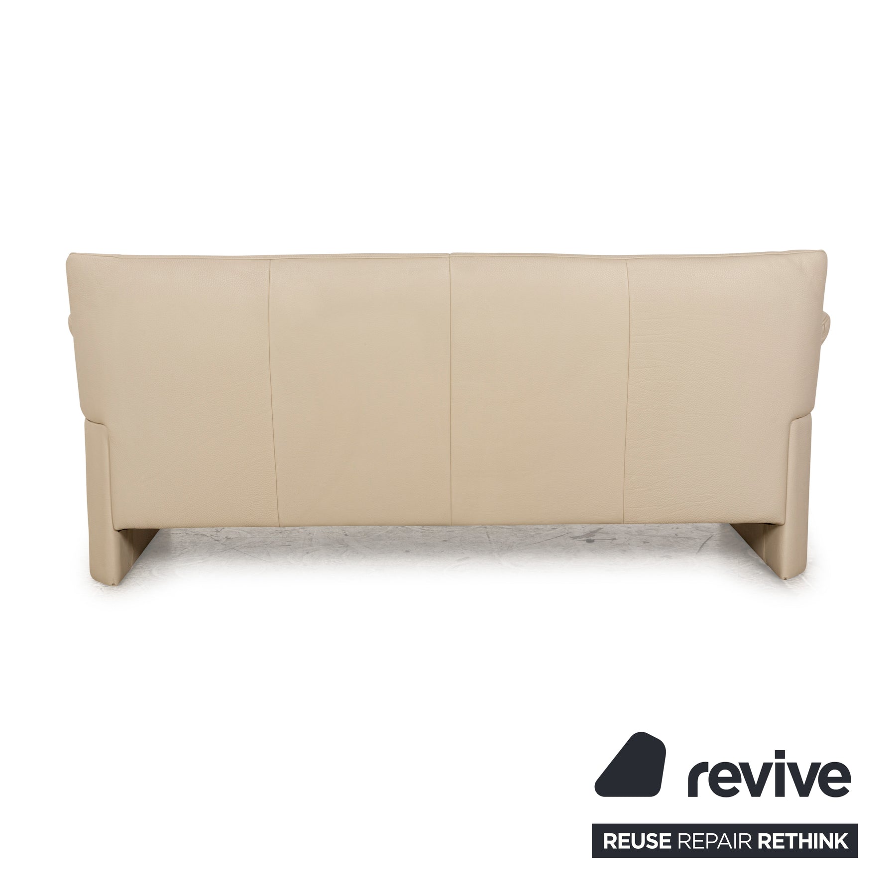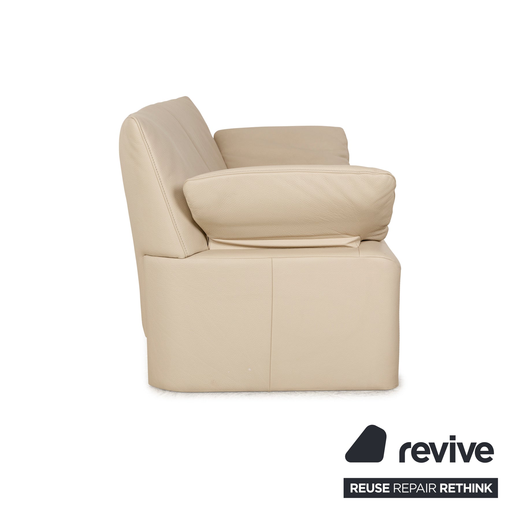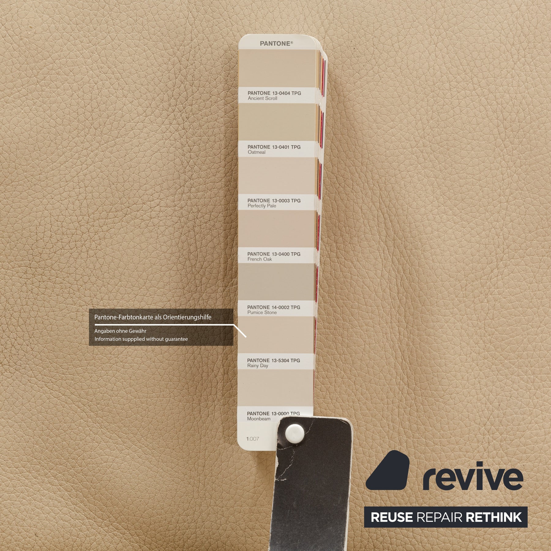 Le canapé Linea de Jori est recouvert de cuir beige crème et repose sur des côtés allant jusqu'au sol. Le design minimaliste et les accoudoirs réglables caractérisent le biplace.