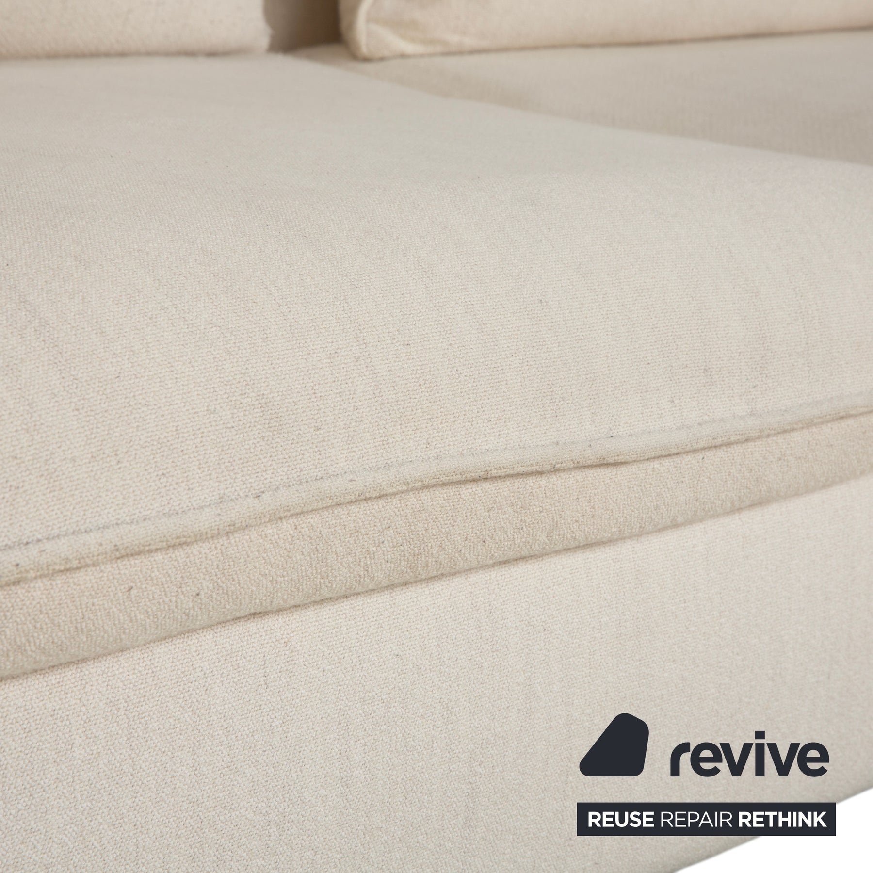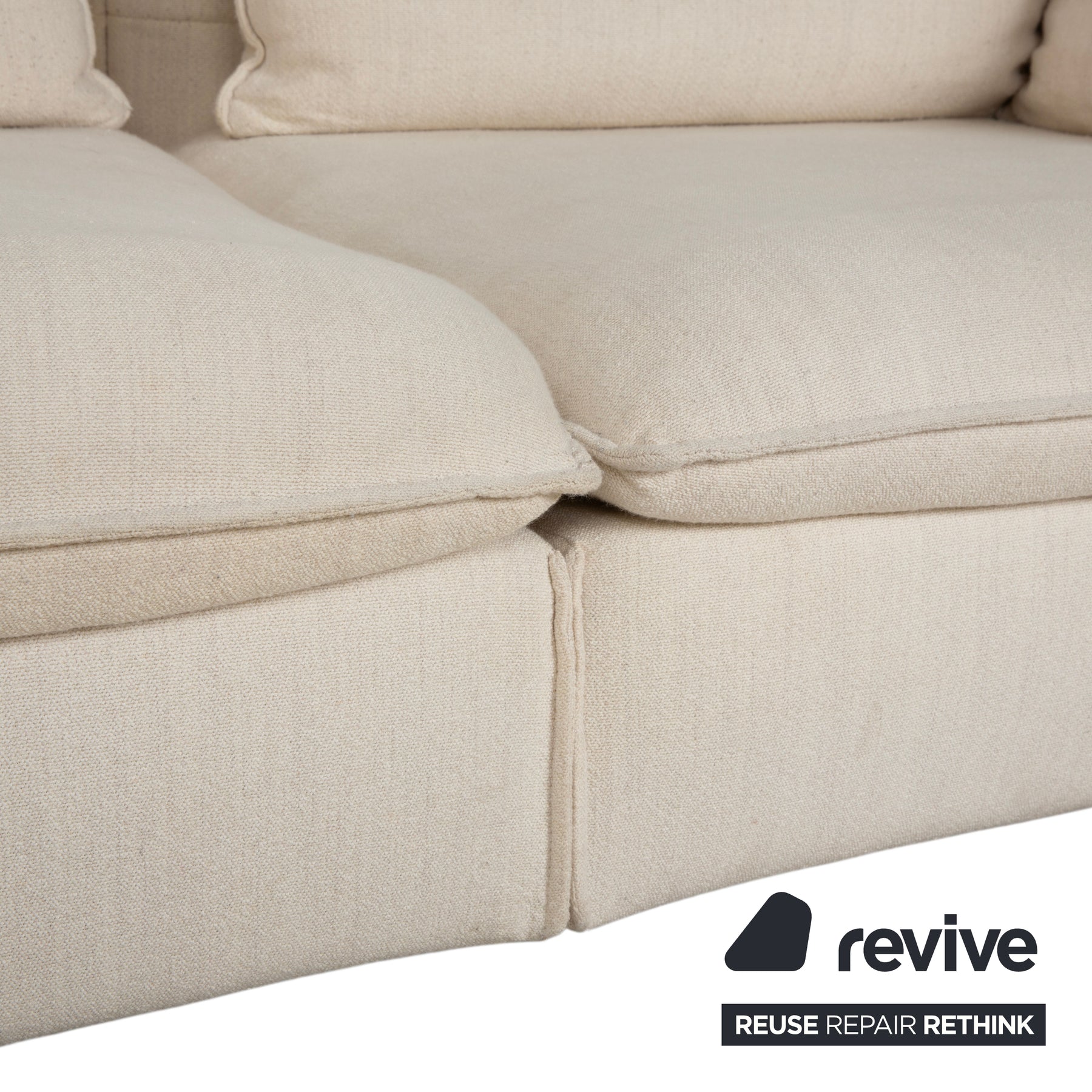 Der Bezug in einem hellen, freundlichen Beige (fast Creme) strahlt pure Gemütlichkeit und Eleganz aus. Das Sofa wirkt nicht starr, sondern durch die weiche Polsterung und die vielen losen Kissen wie ein einladendes Nest.