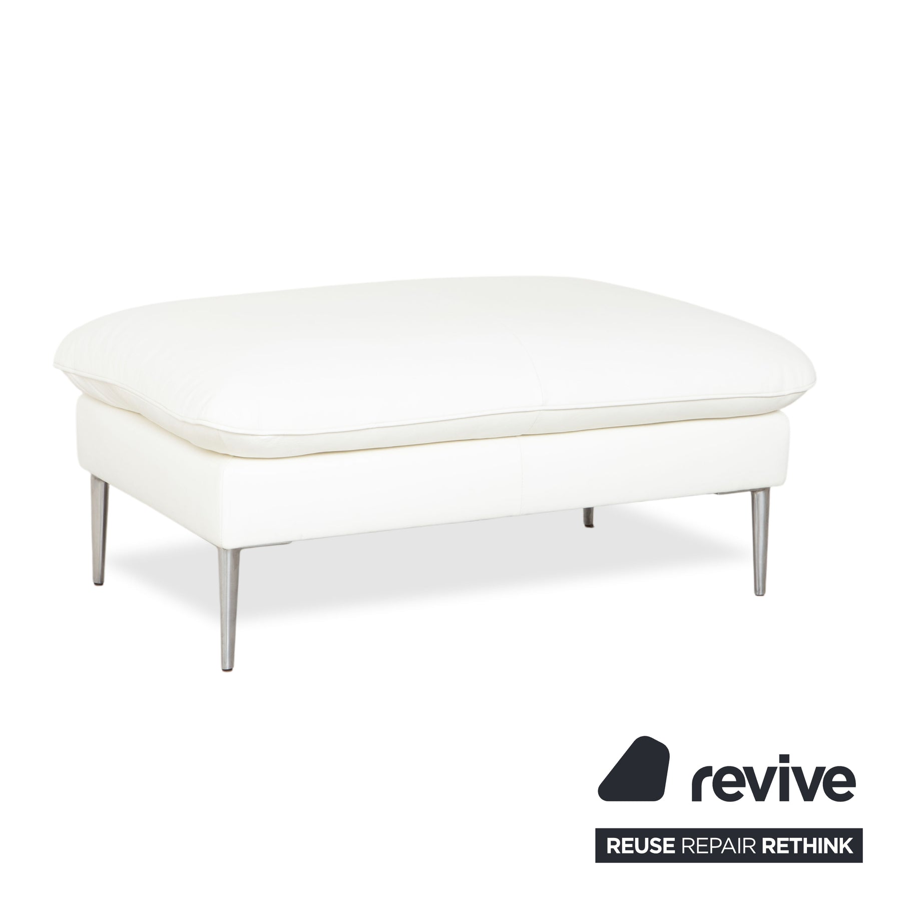 Les deux pièces sont revêtues d'un cuir blanc pur de haute qualité. Cette couleur agrandit visuellement la pièce, lui conférant une allure luxueuse et une fraîcheur incomparable. Le design séduit par son aspect moelleux et confortable : le revêtement, souple et décontracté, invite à la détente. Les fines surpiqûres, présentes aussi bien sur l'assise du canapé qu'au centre du pouf, constituent un détail raffiné.