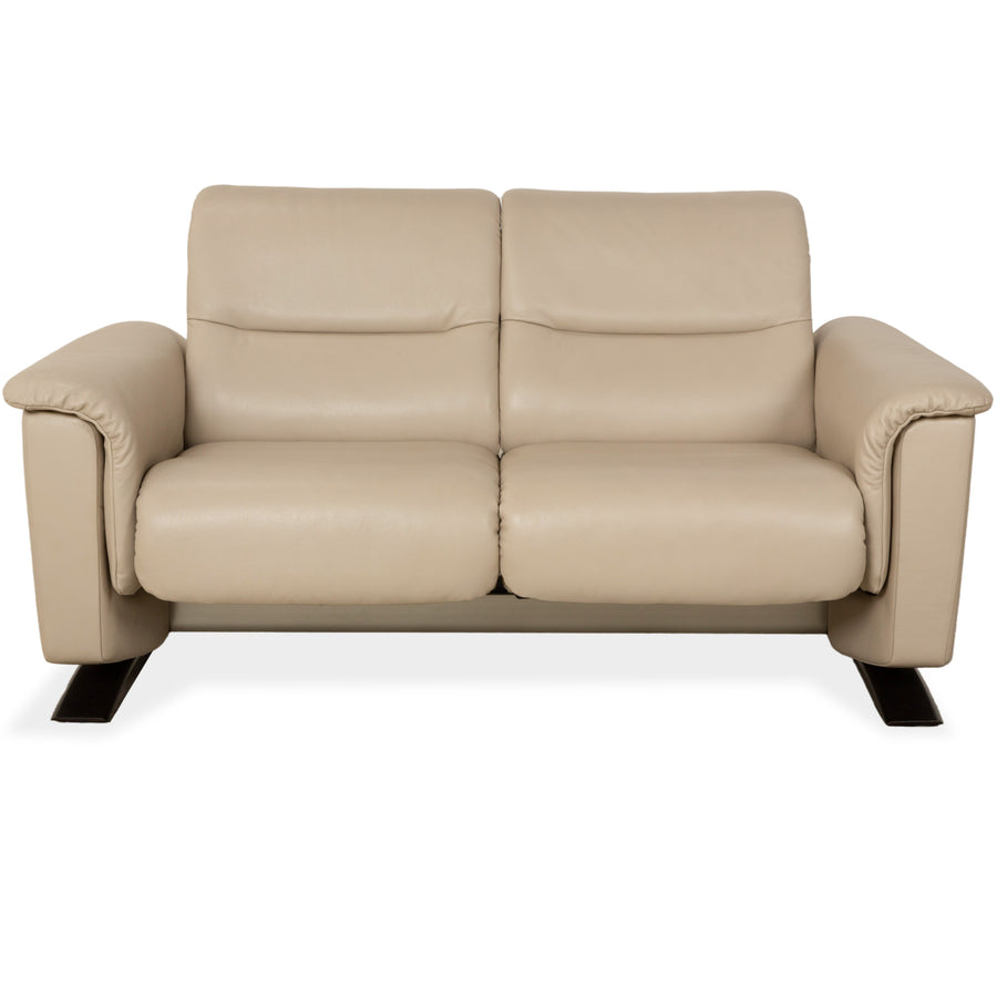 Le canapé deux places Panorama de Stressless est revêtu de cuir crème et repose sur des côtés allant du sol au plafond, reposant sur de robustes pieds noirs. L'assise et le dossier forment une seule coque continue qui s'adapte facilement aux mouvements du corps et permet un léger balancement en position assise. Cela crée une assise particulièrement confortable. Ce canapé allie style moderne et confort exceptionnel. Le revêtement en cuir véritable beige clair/crème lui confère une allure sophistiquée.
