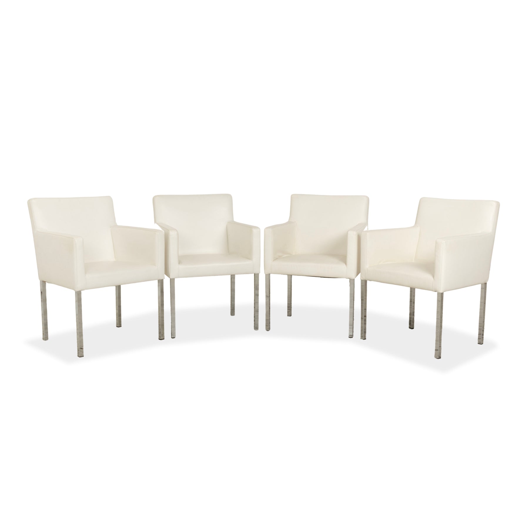 L'ensemble de quatre fauteuils Tommy M by Machalke s'intègre avec élégance dans les espaces de vie modernes. Revêtus de cuir crème, ils reposent sur de fins pieds en métal, créant un style intemporel et sobre.