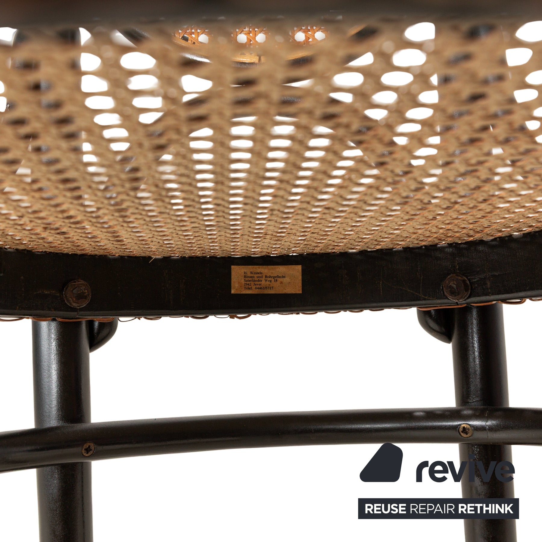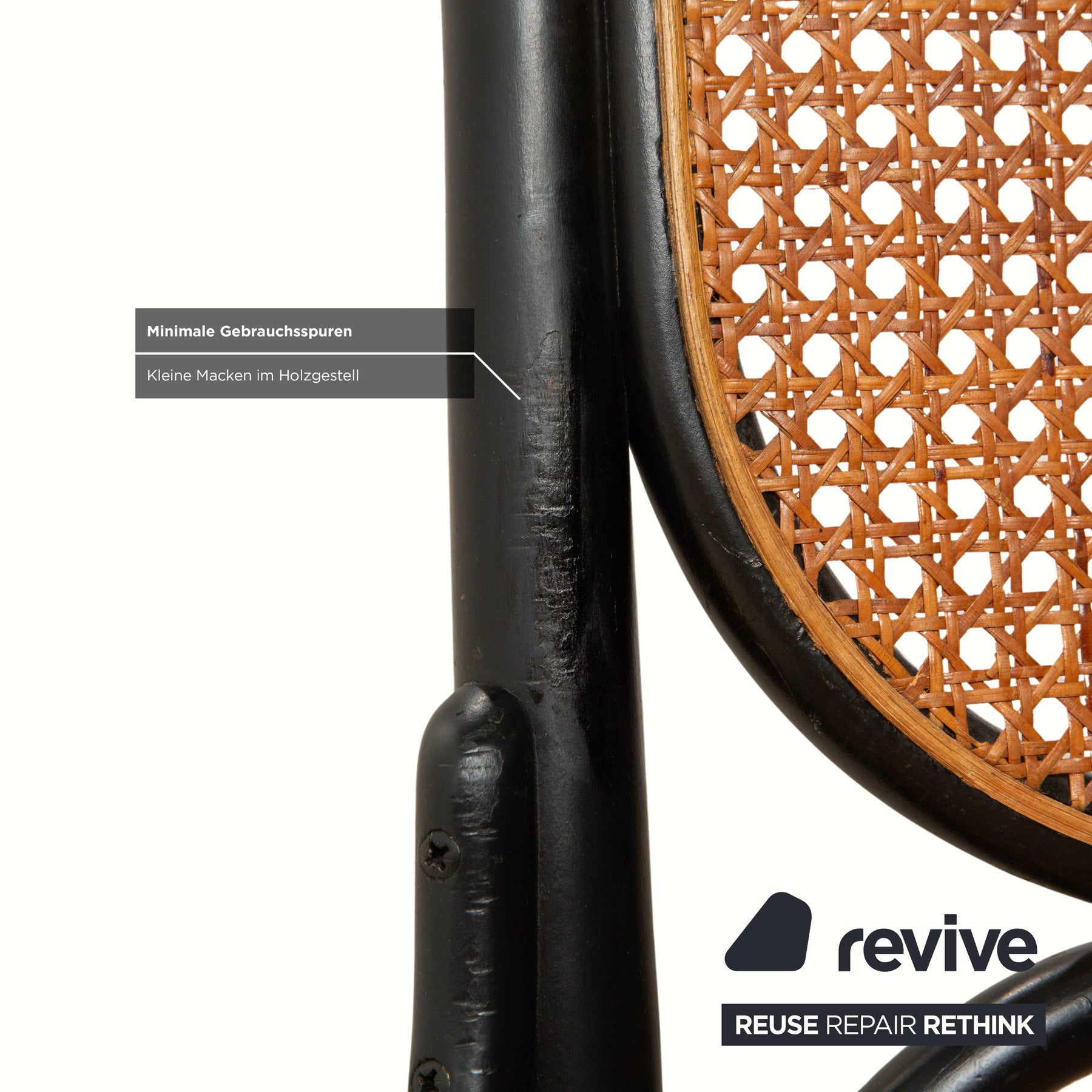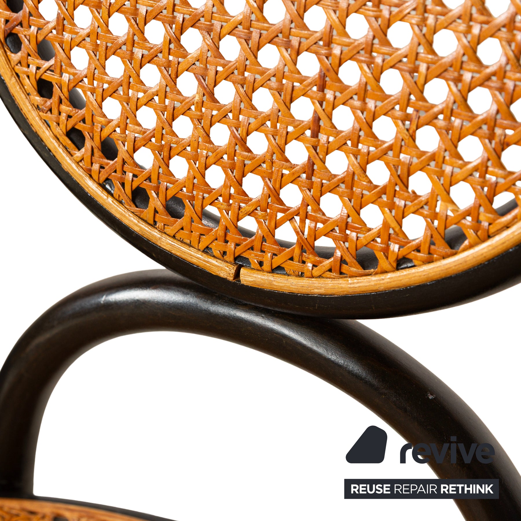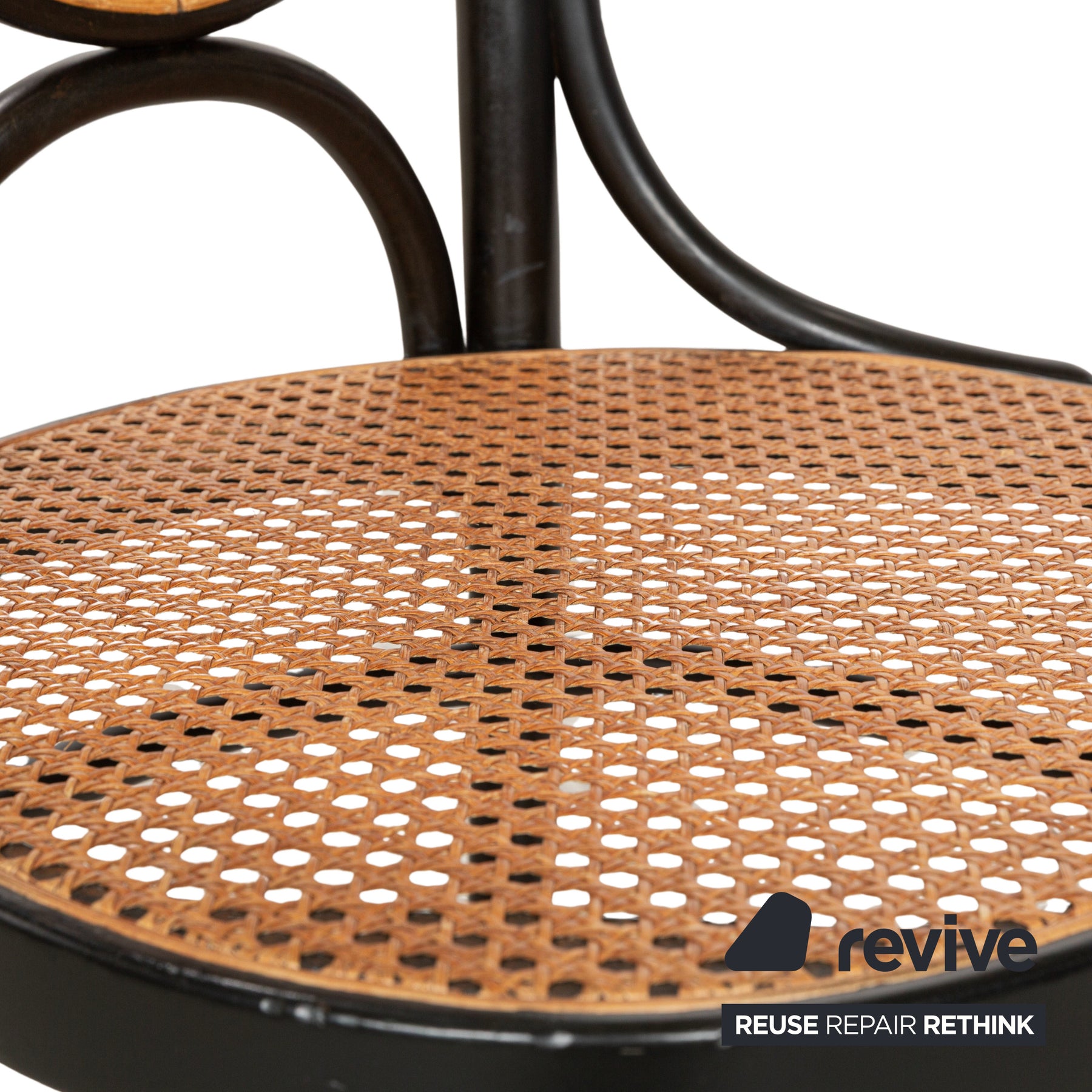 L'ensemble de chaises Thonet n° 207, composé de quatre pièces identiques, est recouvert de rotin brun et fabriqué en bois courbé traditionnel. Il allie un design classique, presque emblématique, à un savoir-faire de haute qualité.