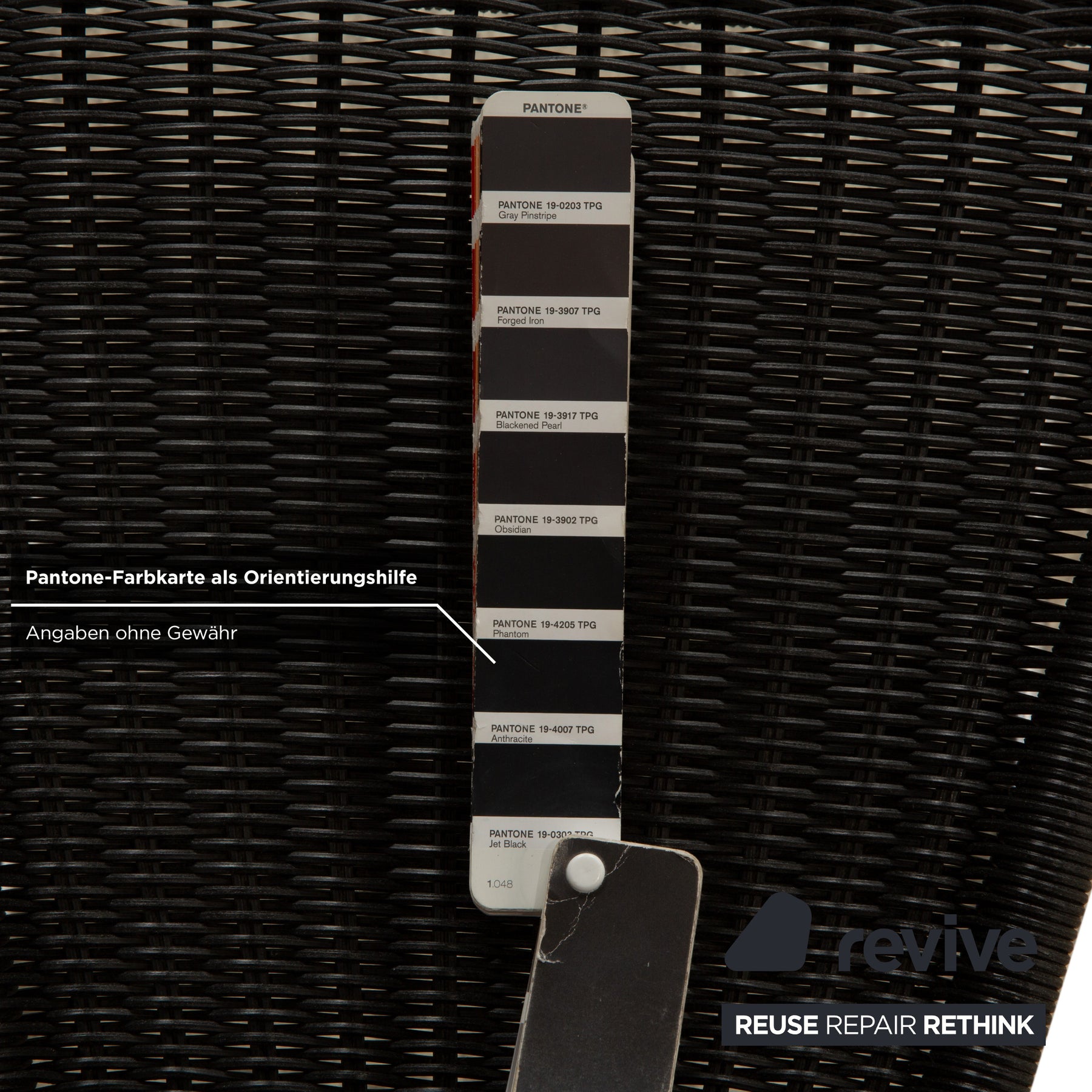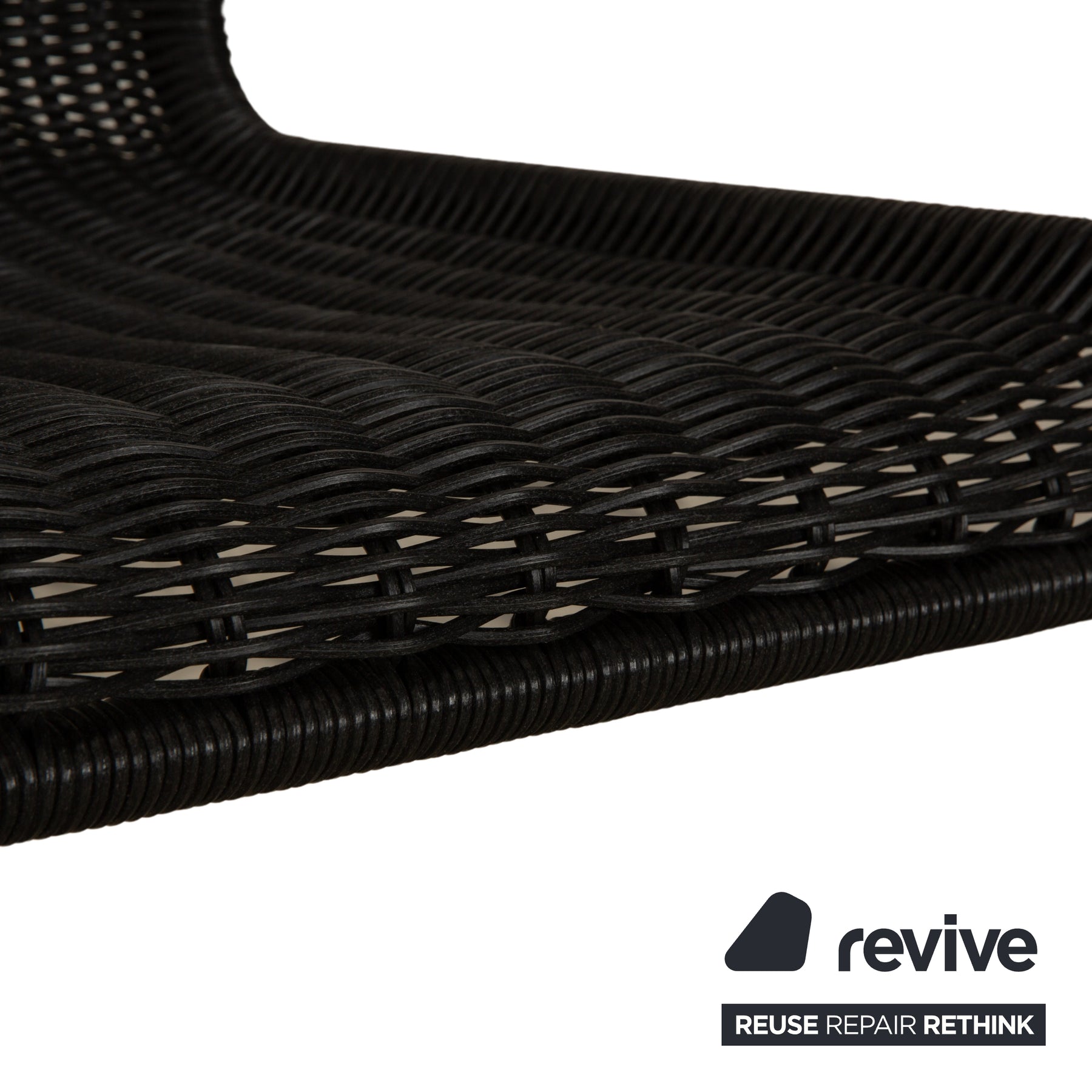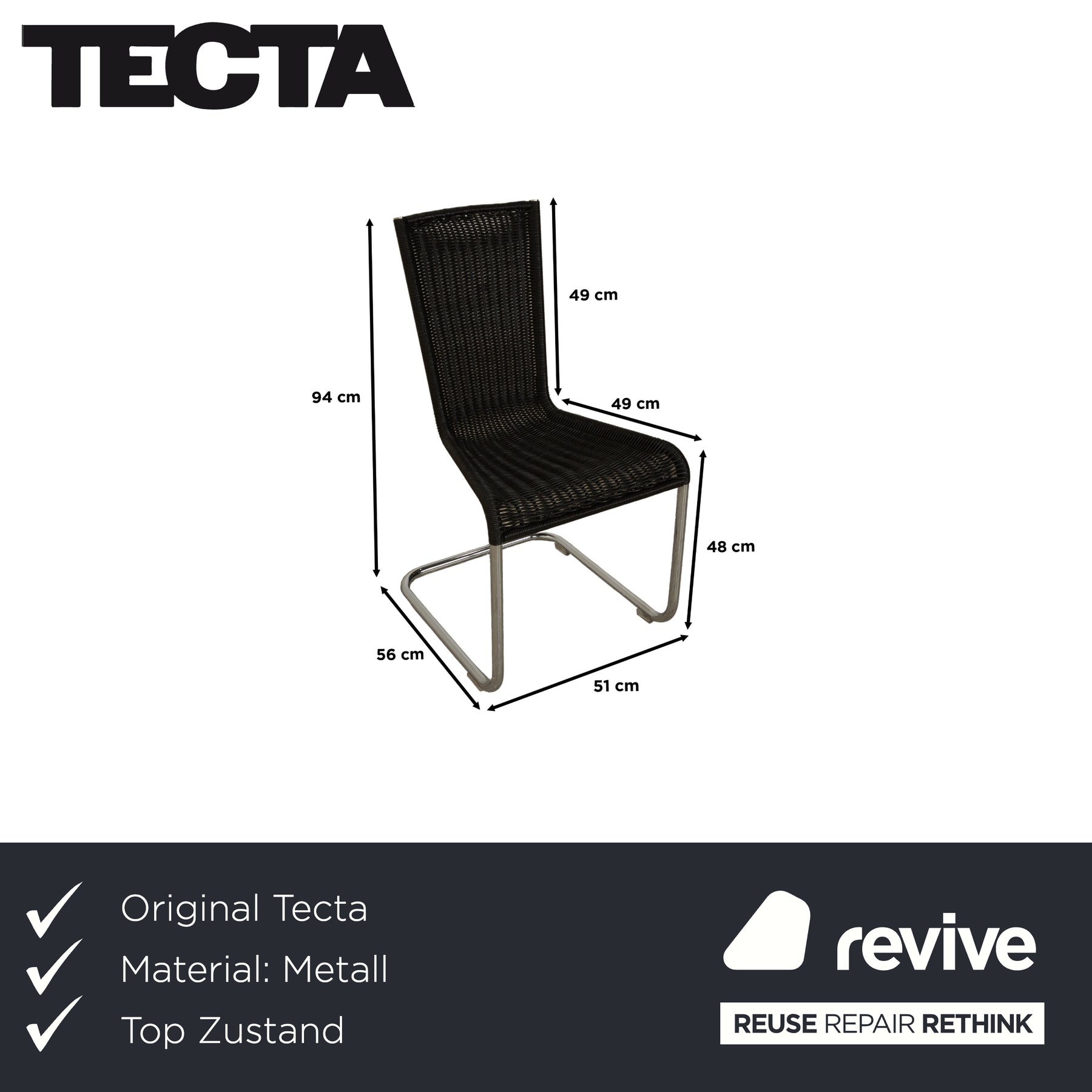 L'ensemble Tecta 6 places se compose de six chaises identiques (avec des variations de hauteur minimes). Toutes sont fabriquées en osier gris foncé et dotées d'une structure en métal, gage de stabilité et de durabilité. Cependant, l'osier ne constitue en aucun cas un obstacle au confort. Au contraire, les chaises sont extrêmement confortables.