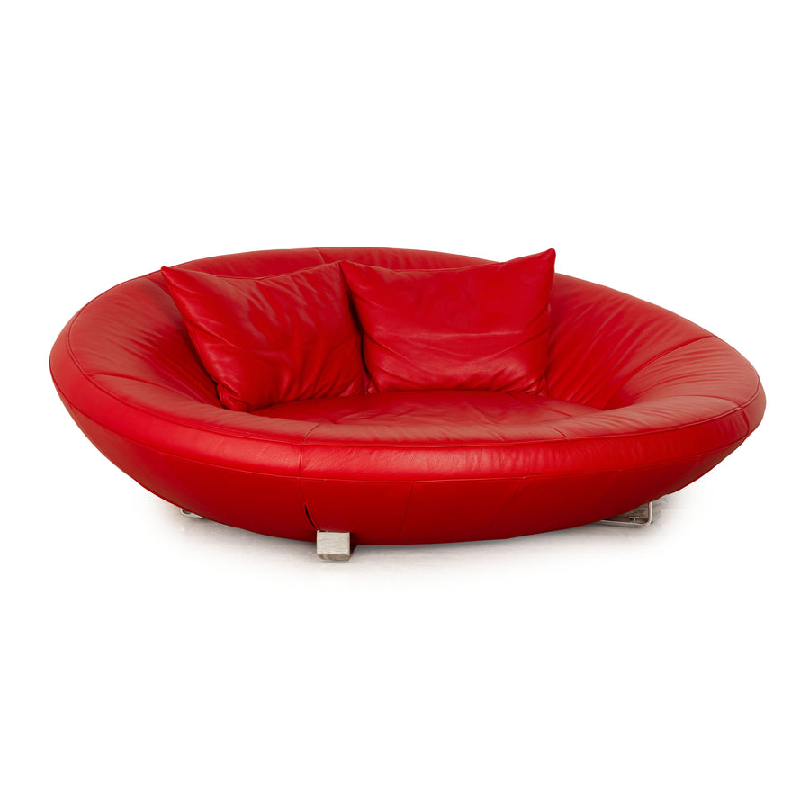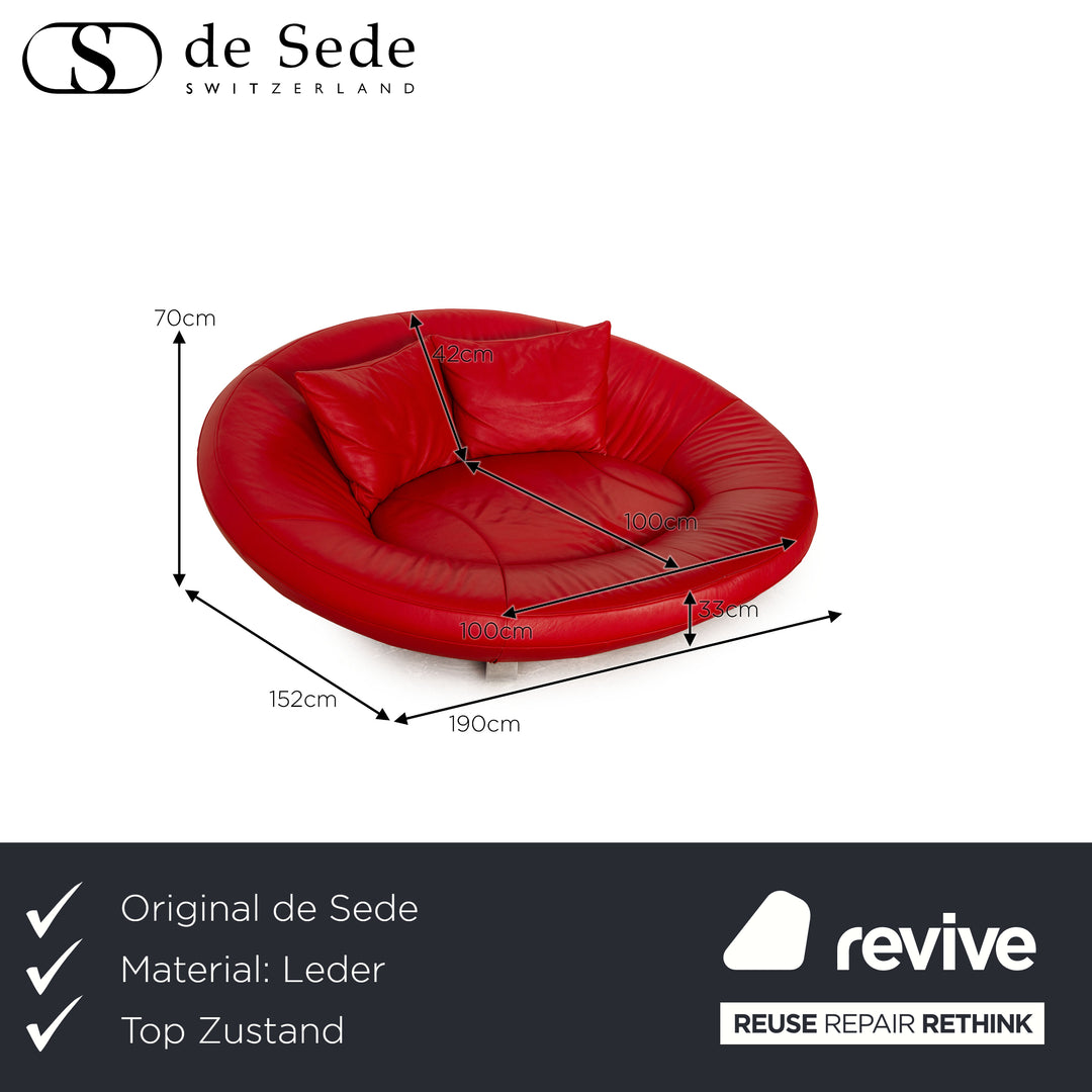 Le canapé DS 152 de de Sede est recouvert de cuir véritable rouge et va du sol au plafond. La forme ronde et le design minimaliste caractérisent le biplace.