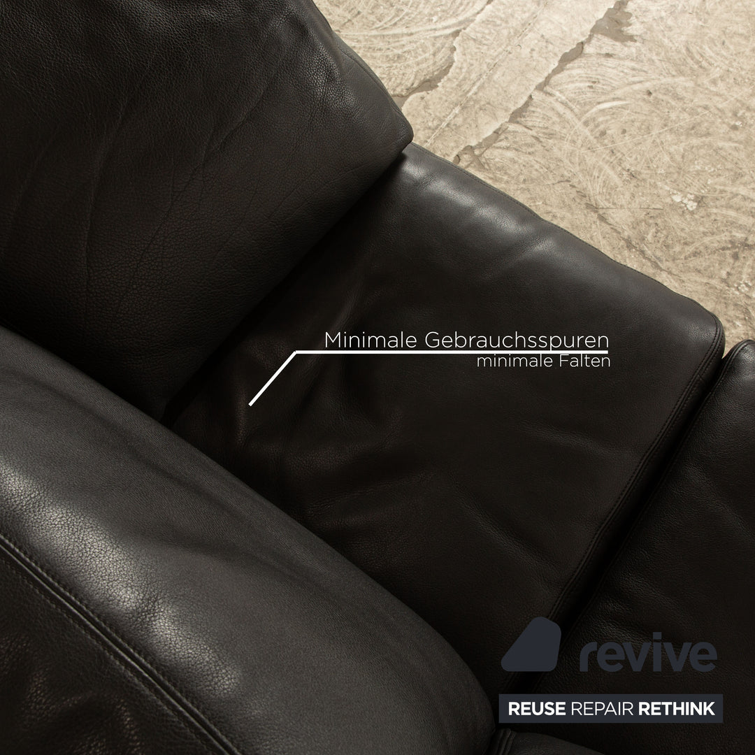 Le DS 17 biplace de de Sede est recouvert de cuir véritable noir et repose sur des pieds noirs. Il se caractérise par son design classique et son look simple et intemporel.
