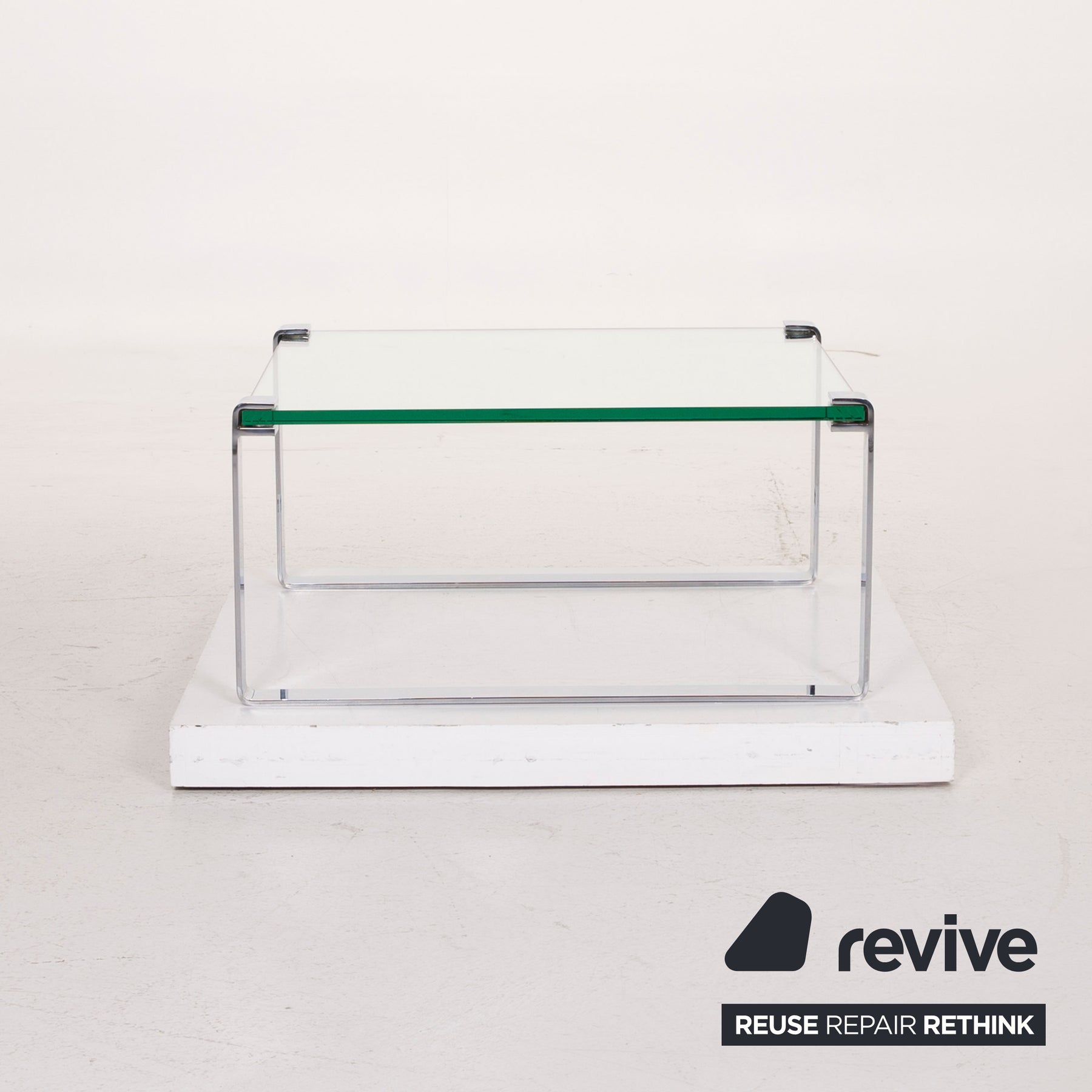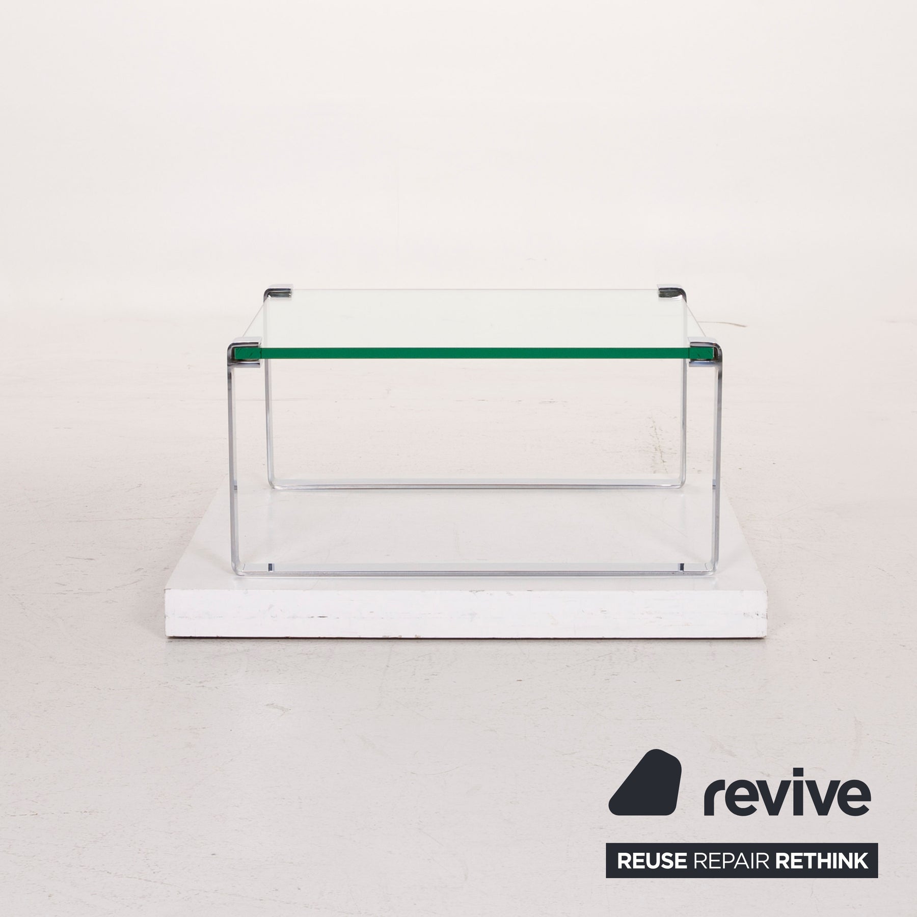 La table basse 1022 de Draenert impressionne par son mélange de verre et de métal. Les deux éléments de cadre en forme de U soutiennent le plateau en verre presque carré. Un coin vitré a été réparé.
