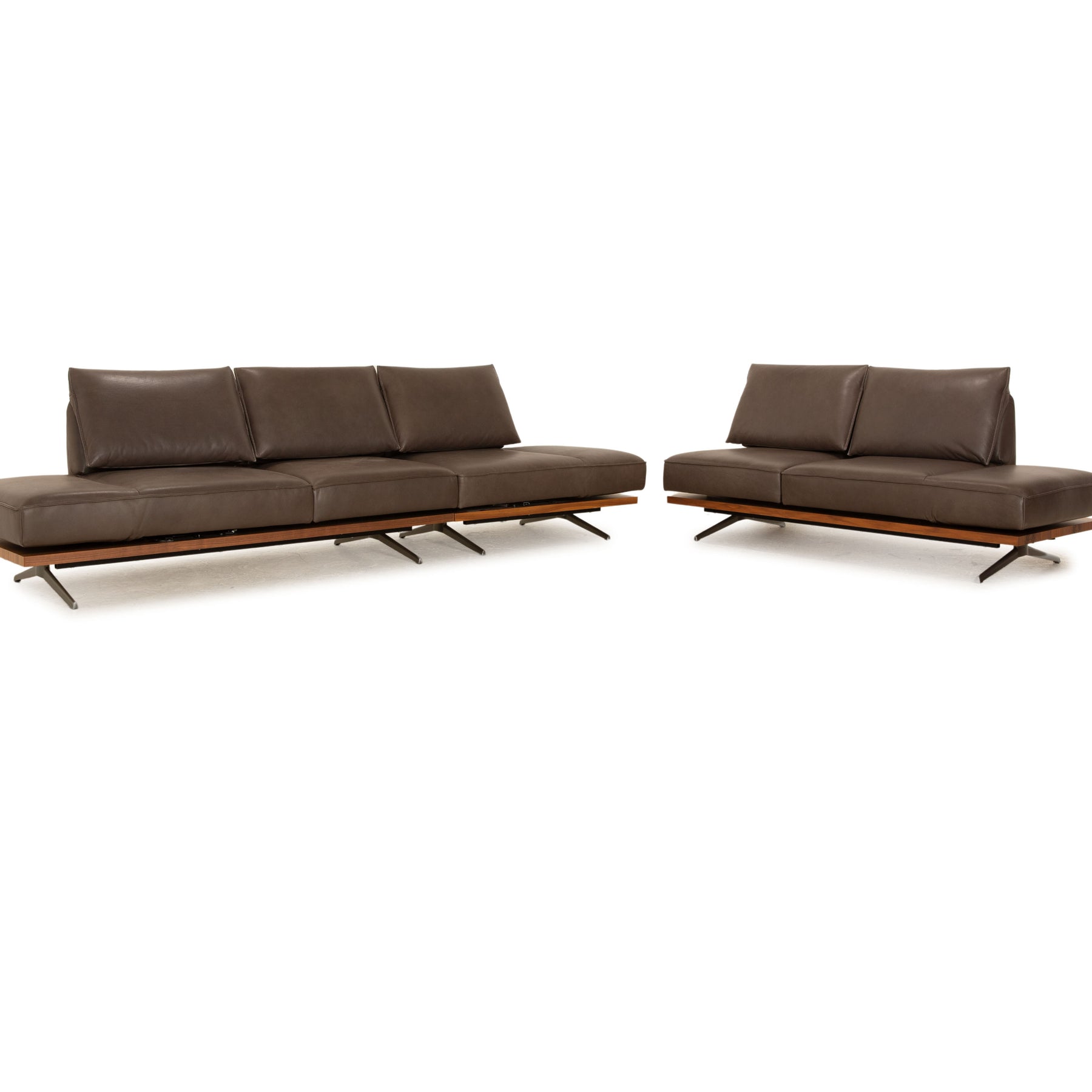 Le canapé Phoenix de Koinor est recouvert de cuir véritable marron et repose sur des pieds en métal. L'élégante plateforme en bois et le design moderne caractérisent le canapé d'angle.