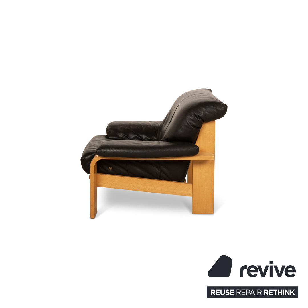 Le fauteuil de Musterring est un exemple de design classique. Le bois marron clair et le cuir véritable noir créent un contraste passionnant sans toutefois paraître trop intrusifs. Le dossier généreux et les larges accoudoirs assurent un haut niveau de confort.