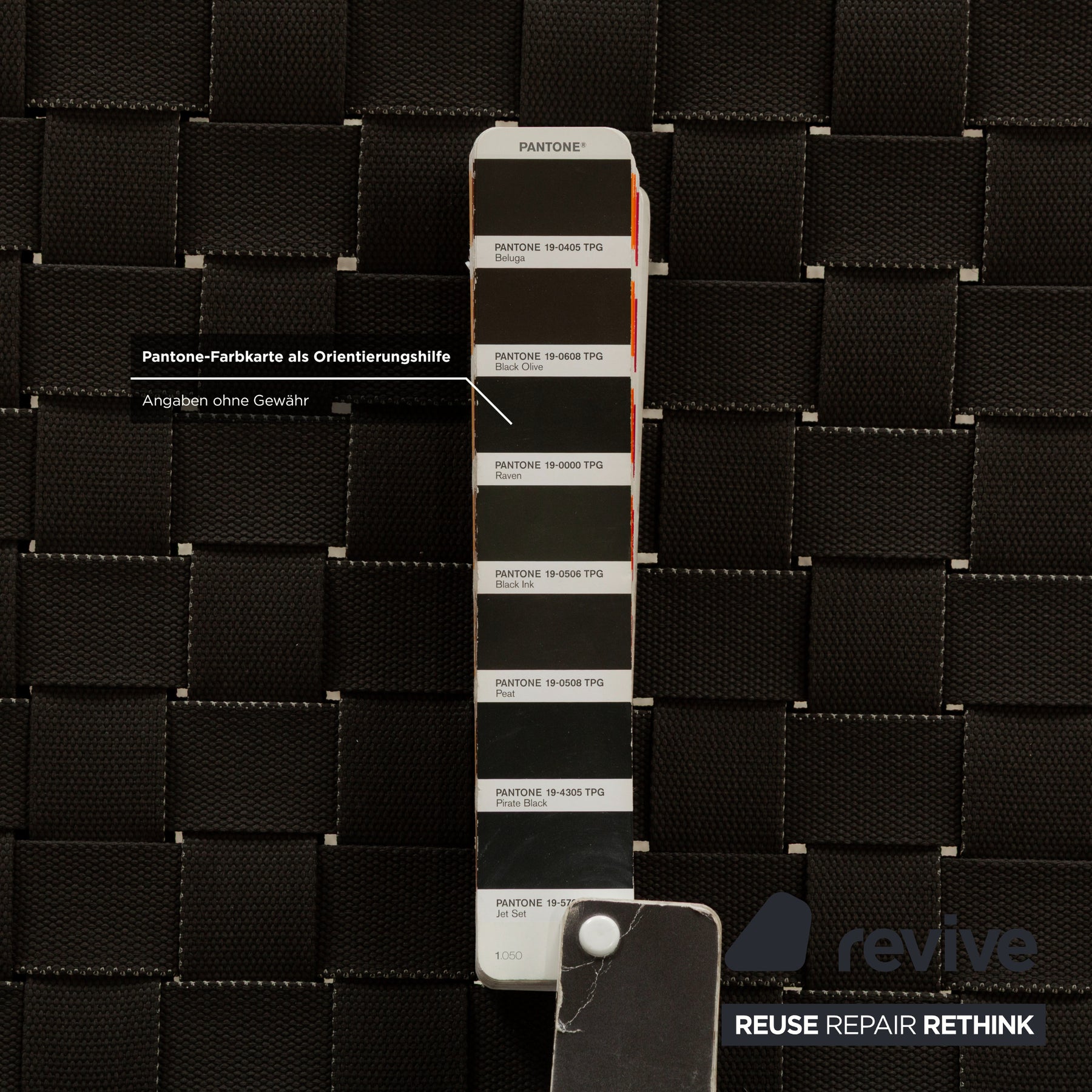 Die Garnitur besteht aus zwei Andreu World Trenza Sesseln. Der Sessel vereint minimalistisches Design mit hohem Sitzkomfort. Die Sitz- und Rückenfläche besteht aus robustem, schwarzem Bandgeflecht.