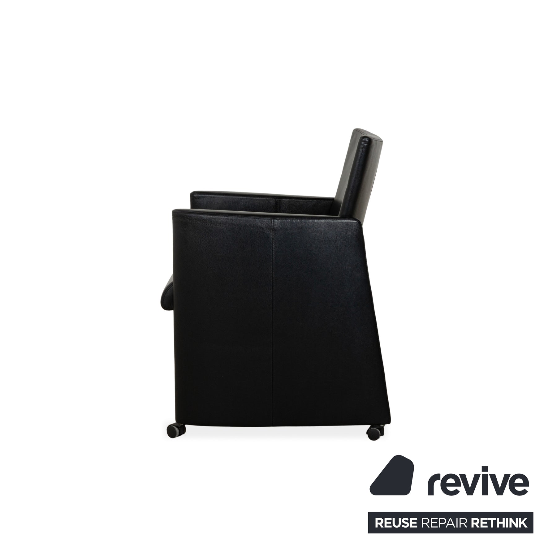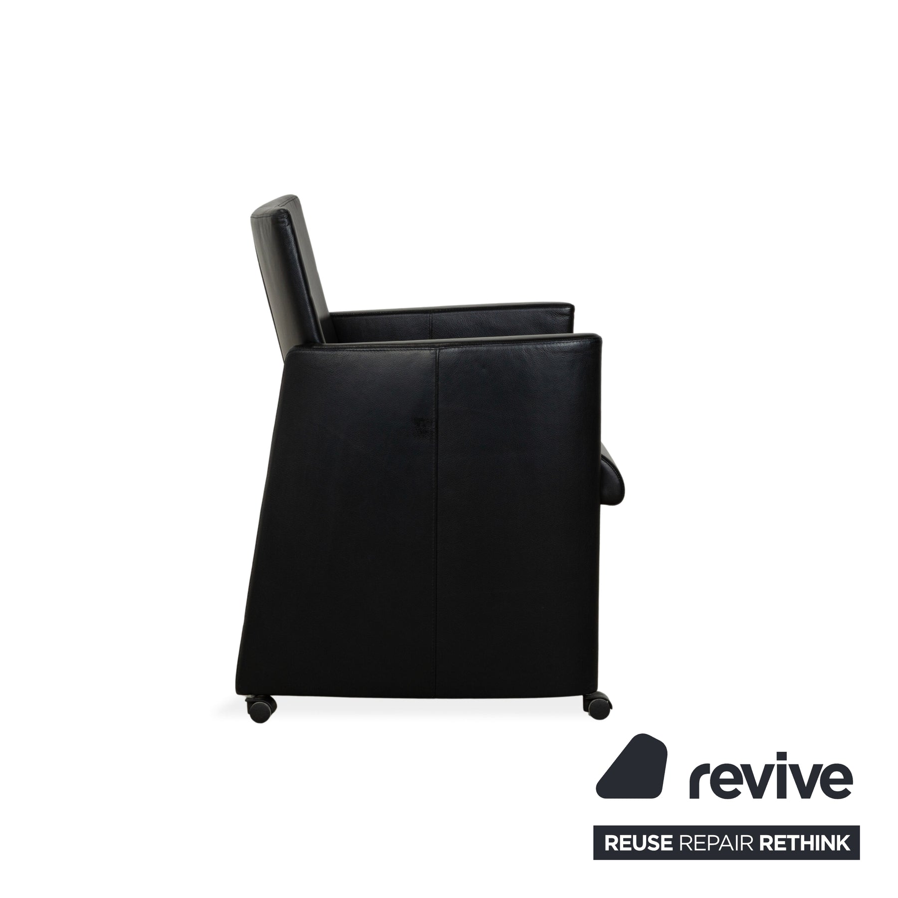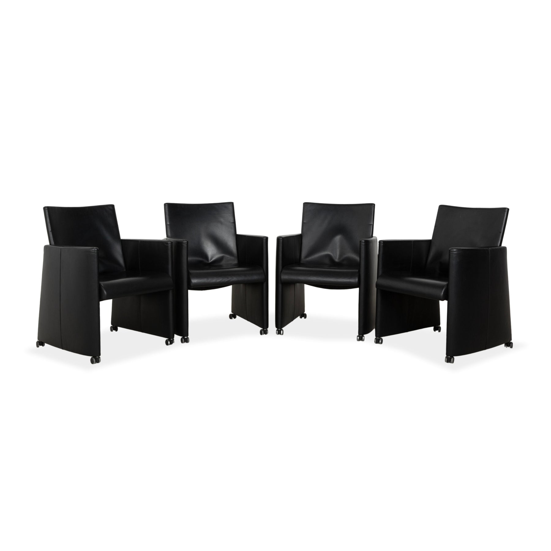 Die Artanova Stuhl Garnitur besteht aus insgesamt vier Stühlen. Sie sind mit einem schwarzen Echtleder bezogen und stehen auf schwarzen Rollen. Die praktischen Armlehnen und das zeitlose Design zeichnen sie aus.
