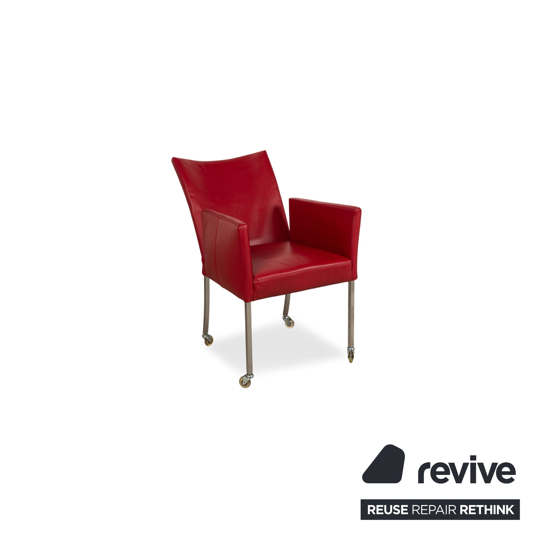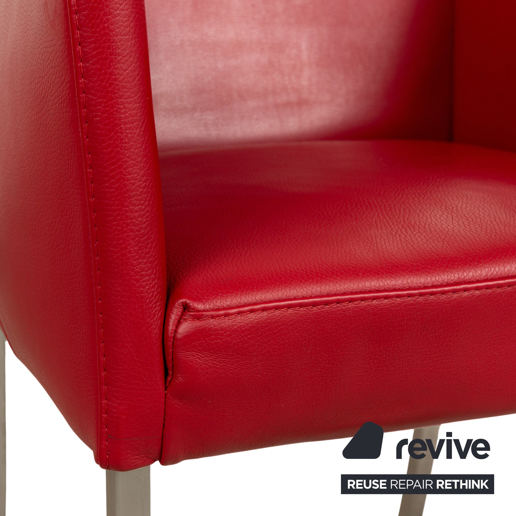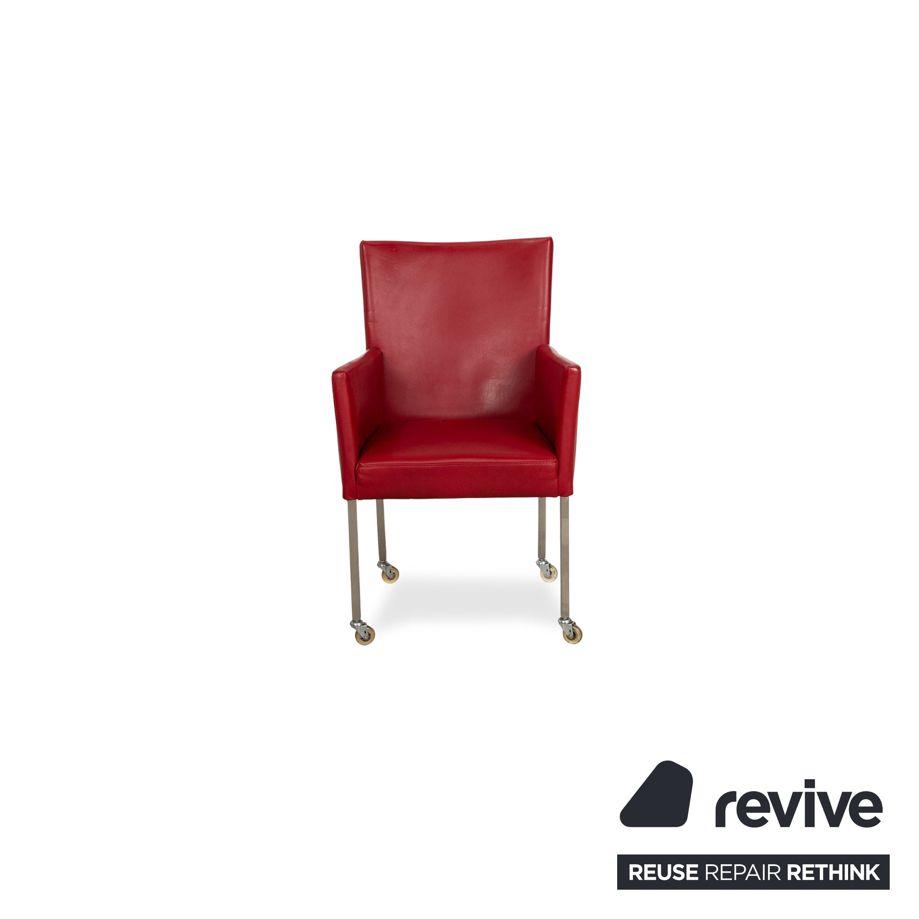 Die ARC-E Stuhl Garnitur von bert plantagie ist mit einem roten Echtleder bezogen und steht auf Metallfüßen. Das schlichte Design und die praktischen Armlehnen zeichnen sie aus. Bei einem Stuhl lässt sich die Rückenlehne verstellen.