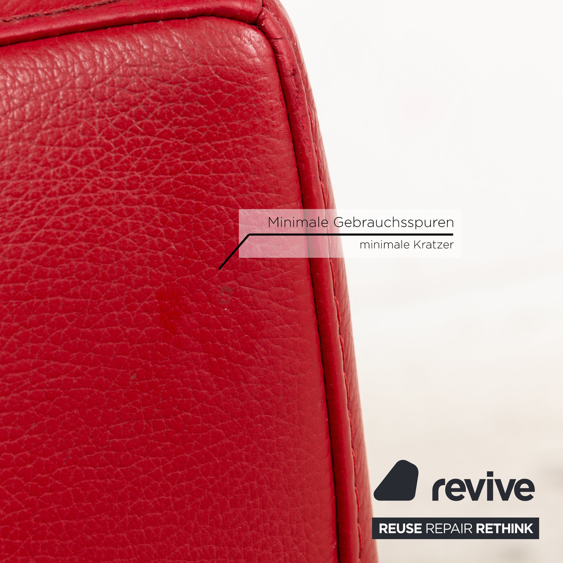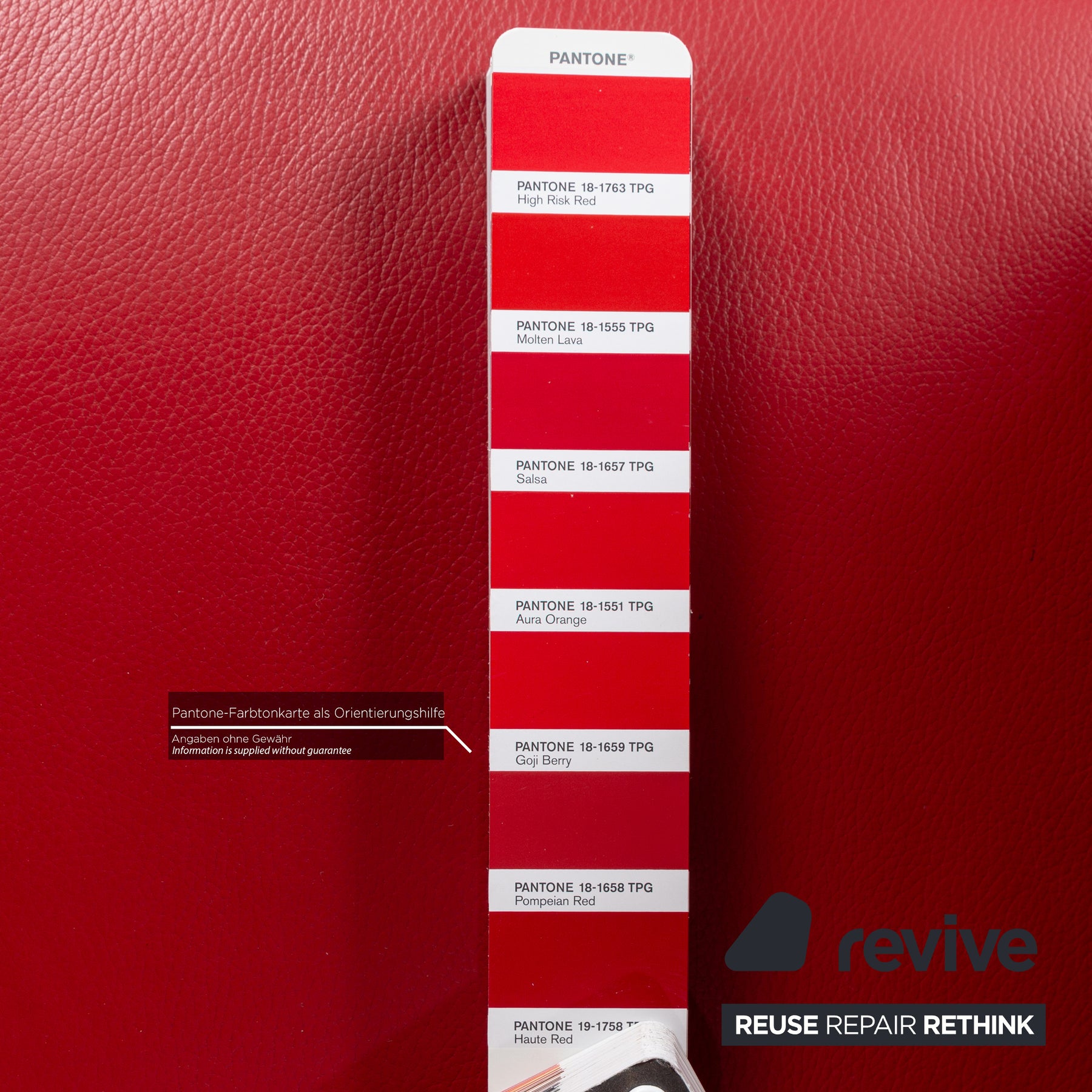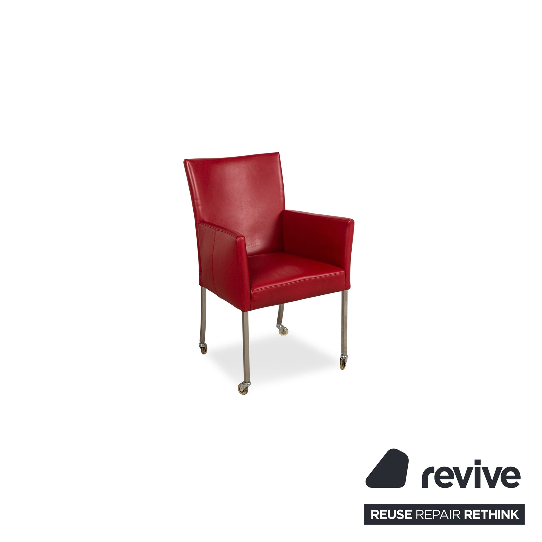 Die ARC-E Stuhl Garnitur von bert plantagie ist mit einem roten Echtleder bezogen und steht auf Metallfüßen. Das schlichte Design und die praktischen Armlehnen zeichnen sie aus. Bei einem Stuhl lässt sich die Rückenlehne verstellen.