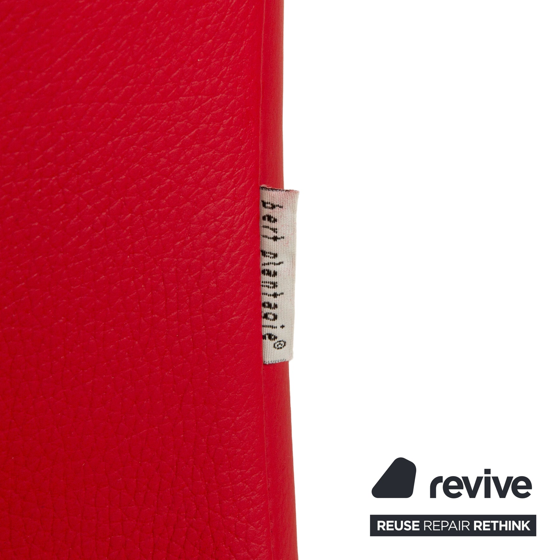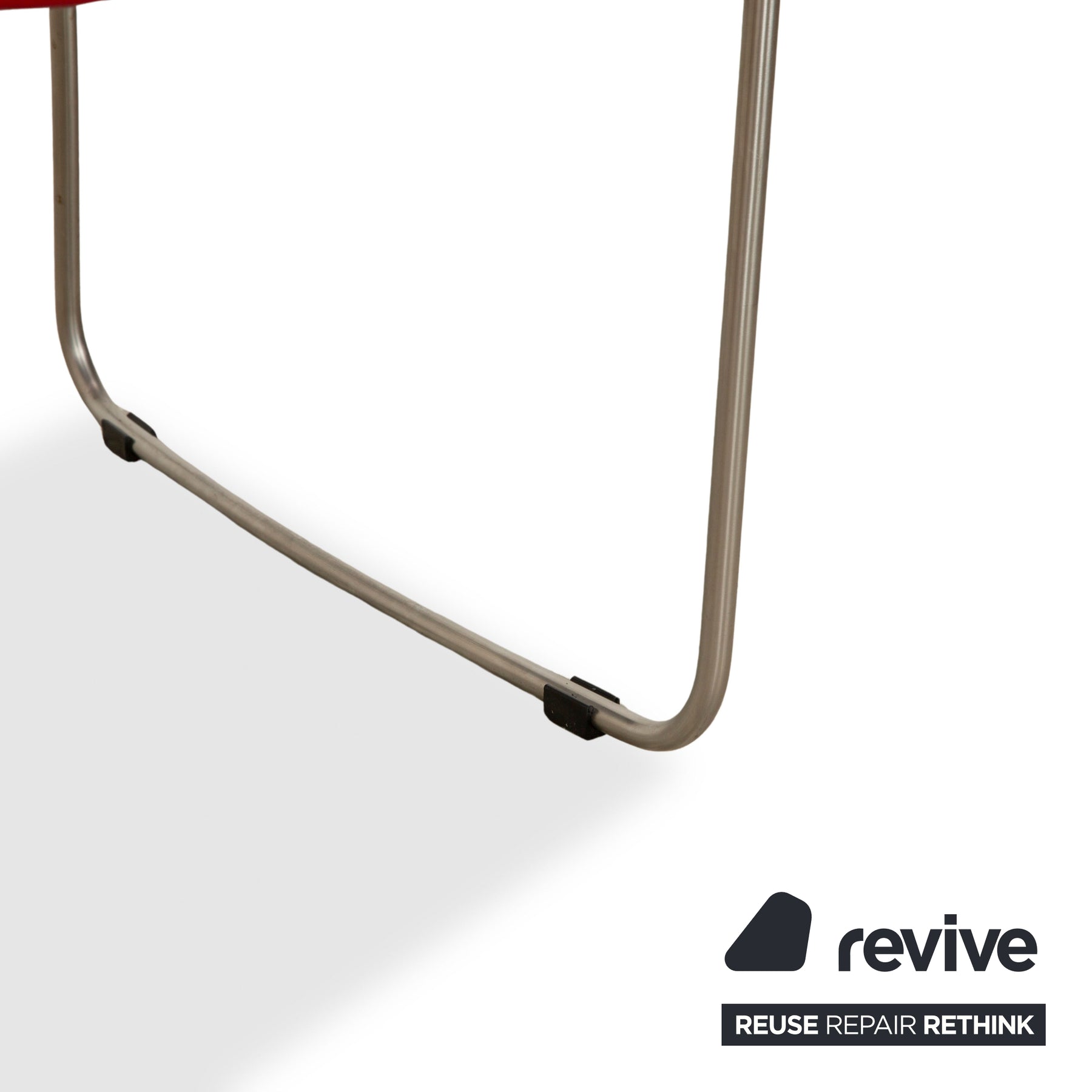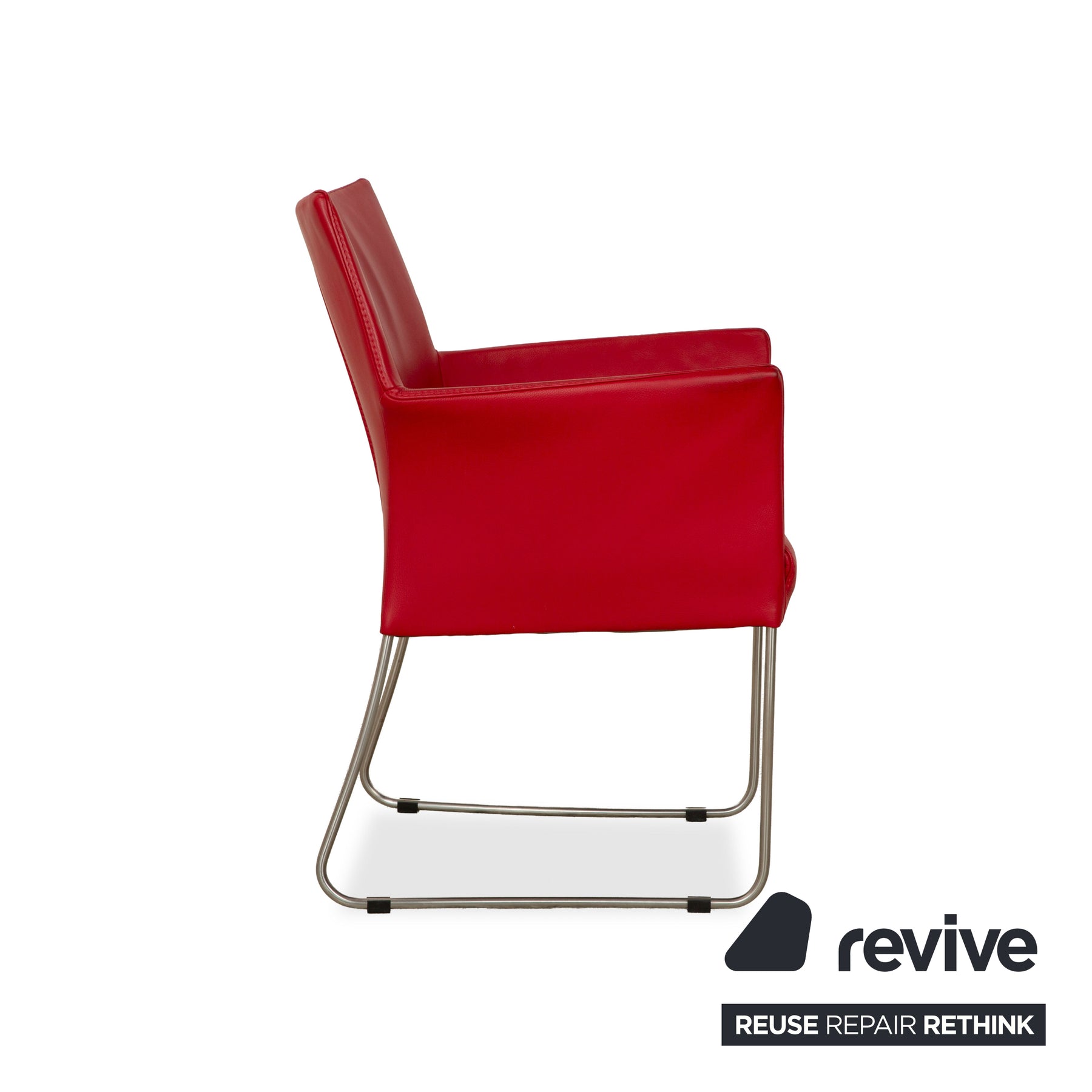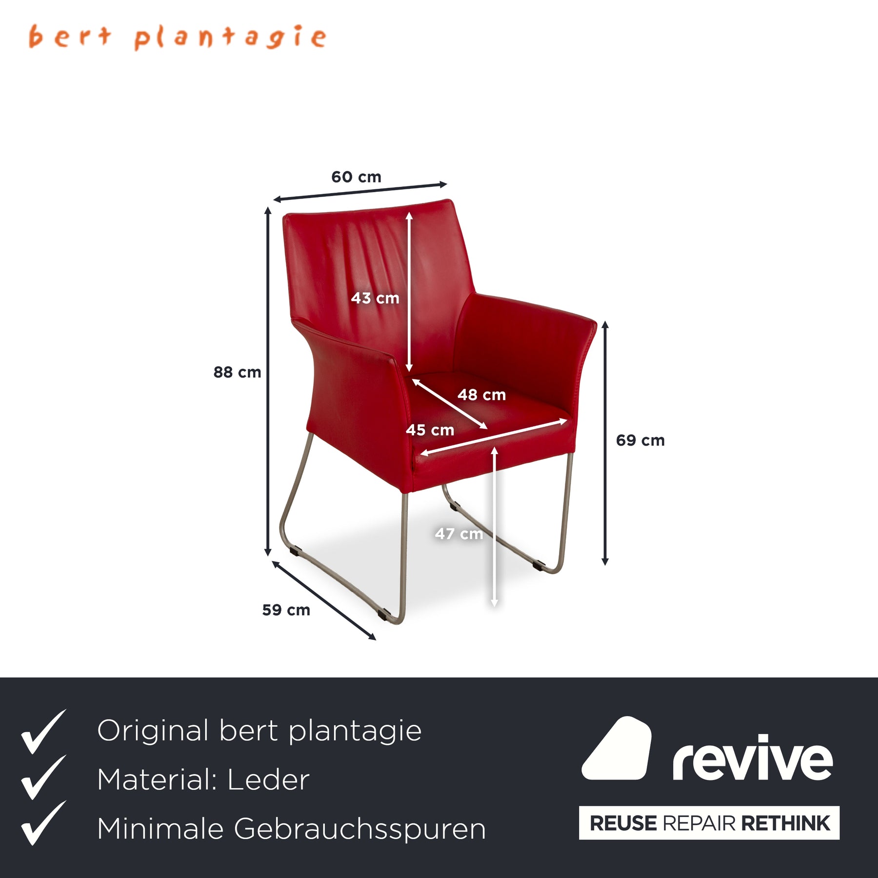Diese Stuhl-Garnitur von bert plantagie bestehend aus vier baugleichen Exemplaren. Die Garnitur ist eine elegante Ergänzung für das moderne Wohn- und Esszimmer. Die Armlehnstühle sind mit einem roten Echtleder bezogen und zeichnen sich durch ihr reduziertes, geradliniges Design aus.