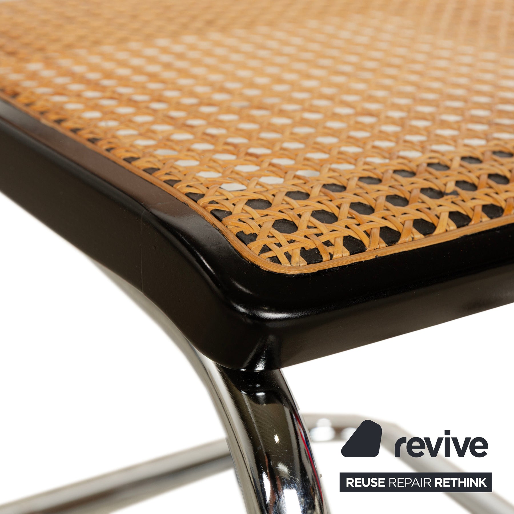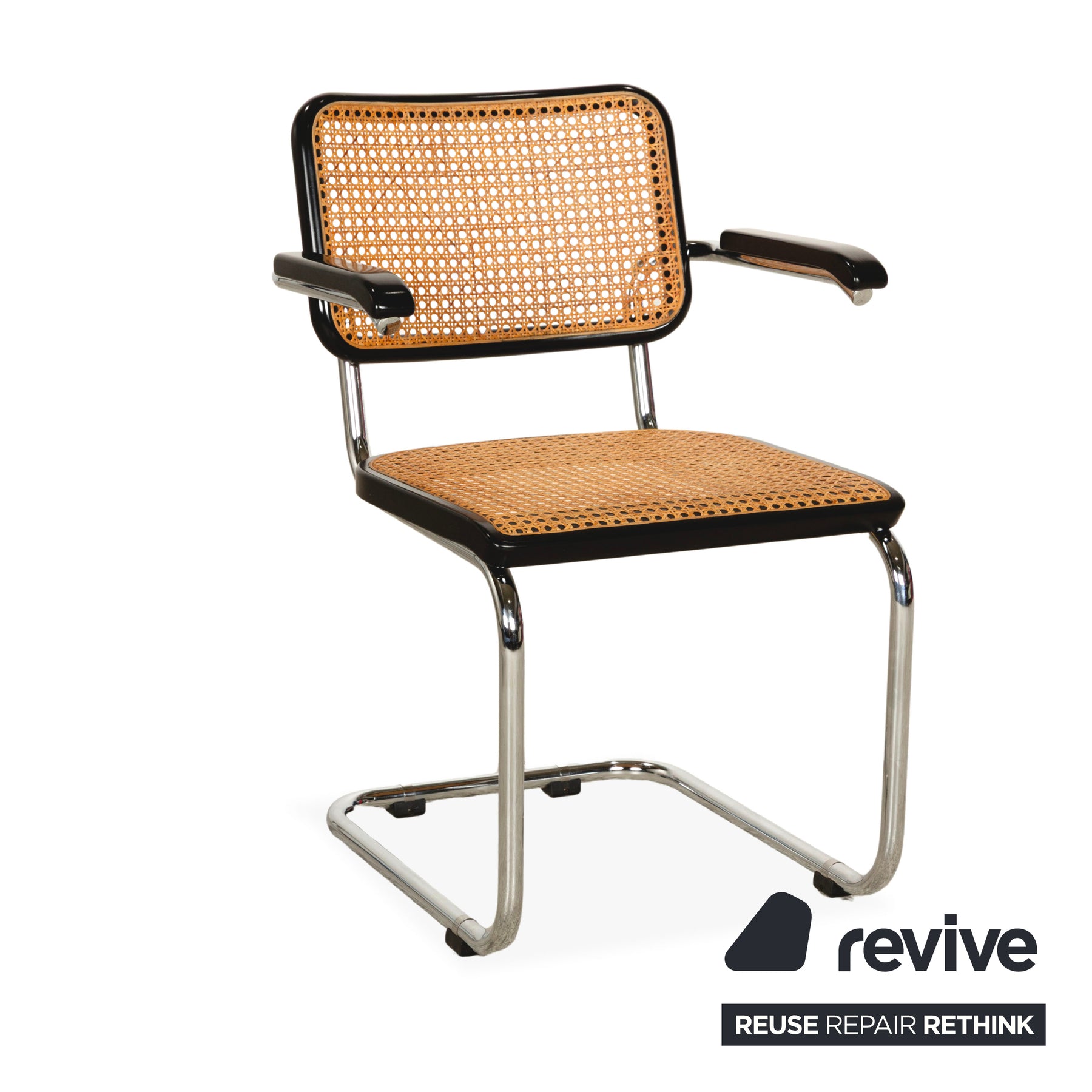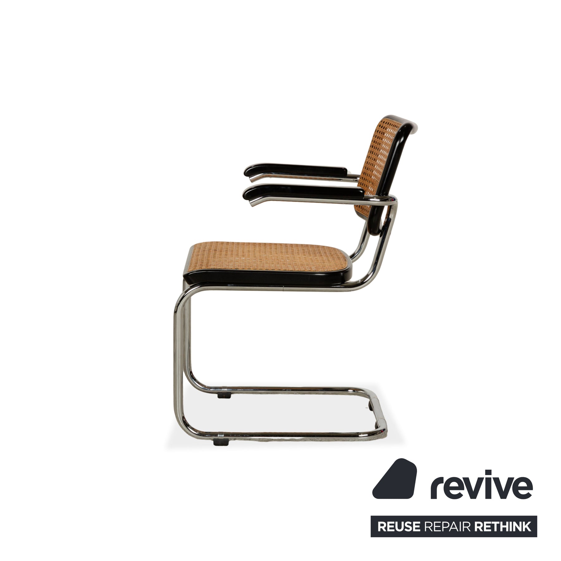 Die S 64 Stuhl Garnitur von Thonet besteht aus vier Freischwingern. Sie sind mit einem beige-braunen Wiener Geflecht ausgestattet und stehen auf einem silbernen Metallgestell. Die Holzrahmen der Stühle sind schwarz und die praktischen Armlehnen zeichnen sie aus.
