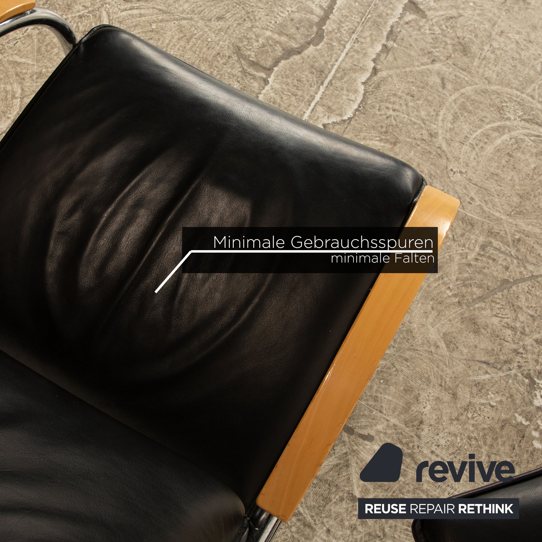 Die Stuhl Garnitur S 74 von Thonet ist mit einem schwarzen Echtleder bezogen und steht auf  einem schmalen Metallgestell. Sie zeichnet sich durch das Vintage Design und die luftige Optik aus.