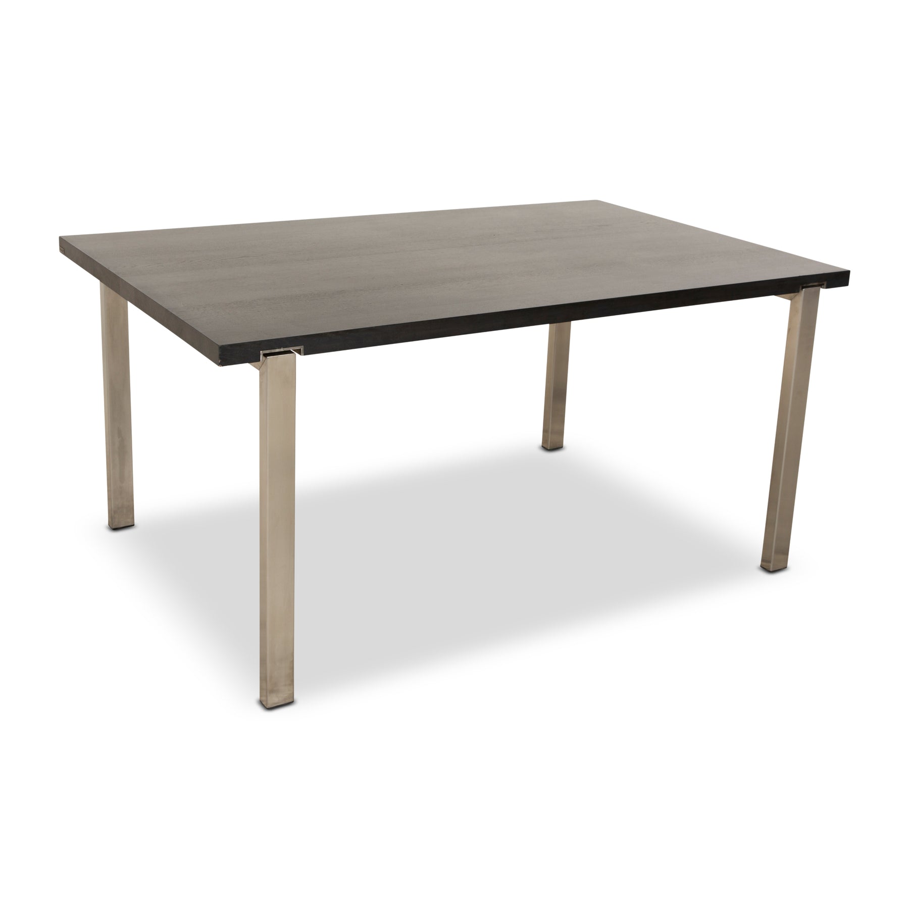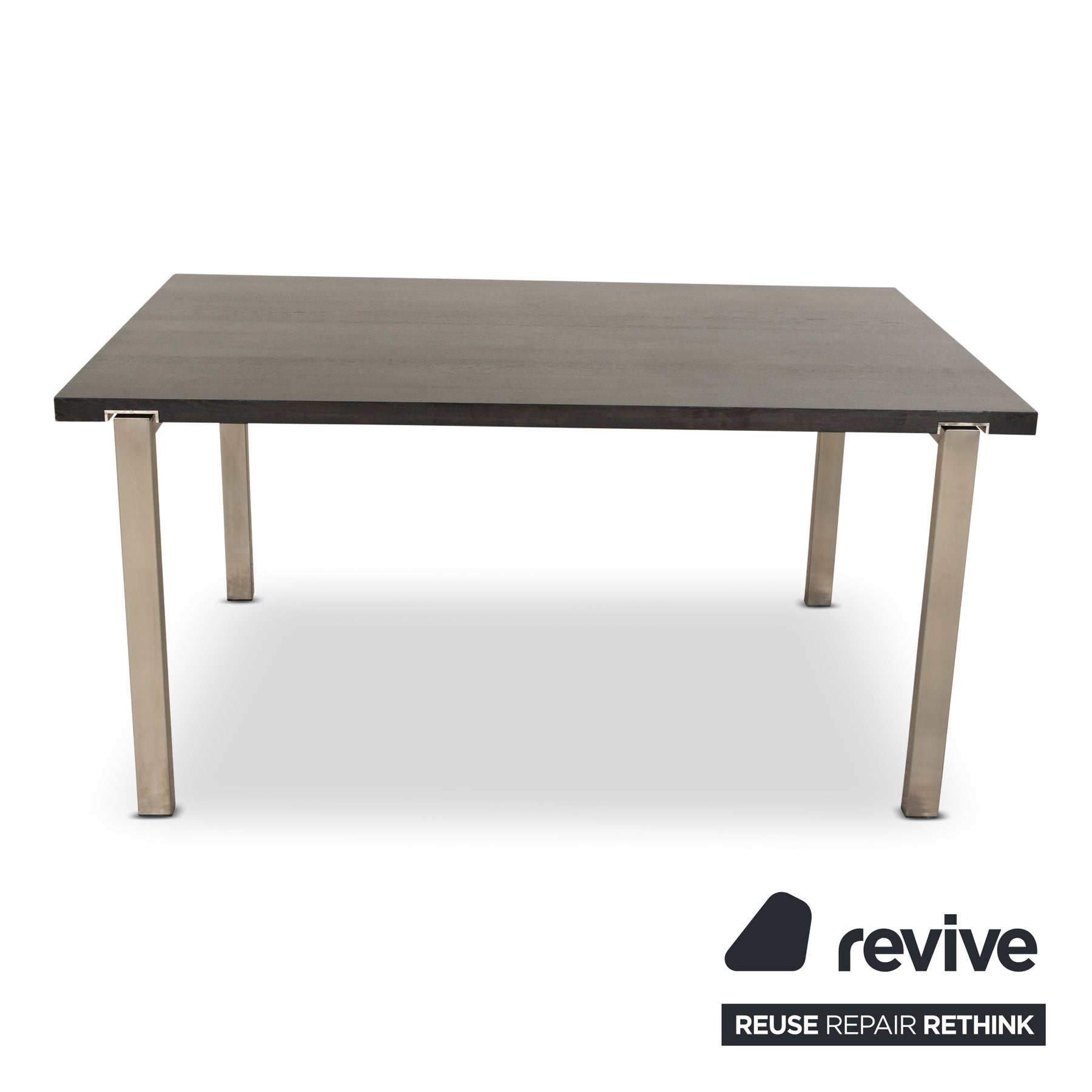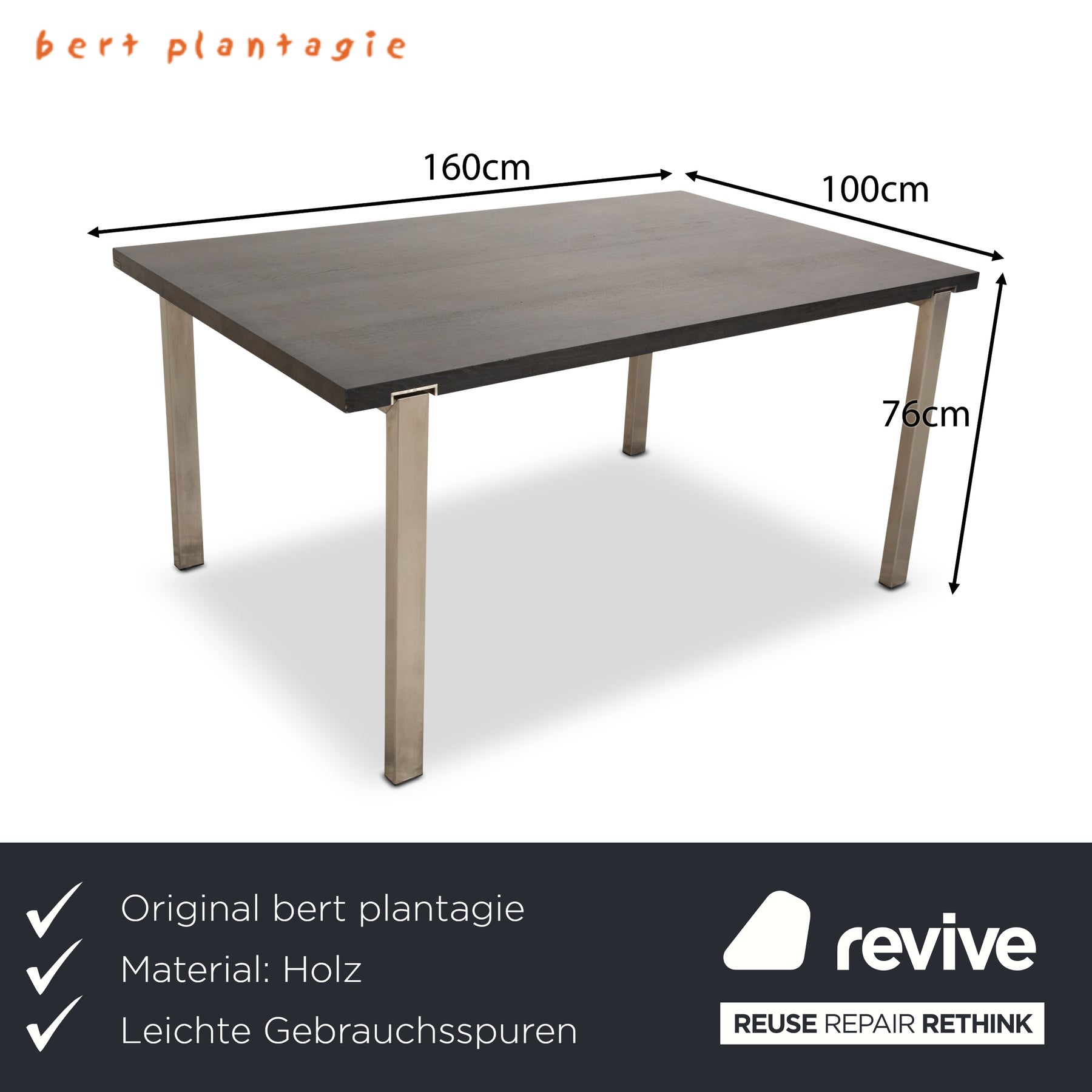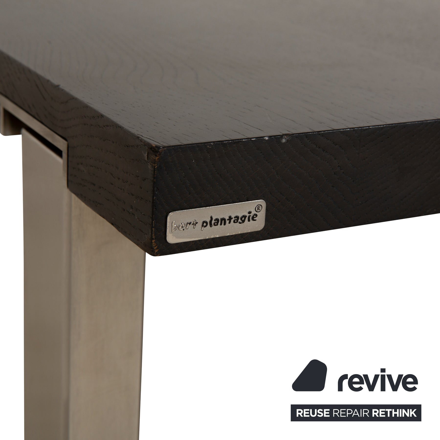 Der Tisch von bert plantagie ist aus einer dunkelbraunen Tischplatte aus Holz sowie zwei u-förmigen Metallgestellen gefertigt. Er zeichnet sich durch sein industrielles, modernes Design aus.