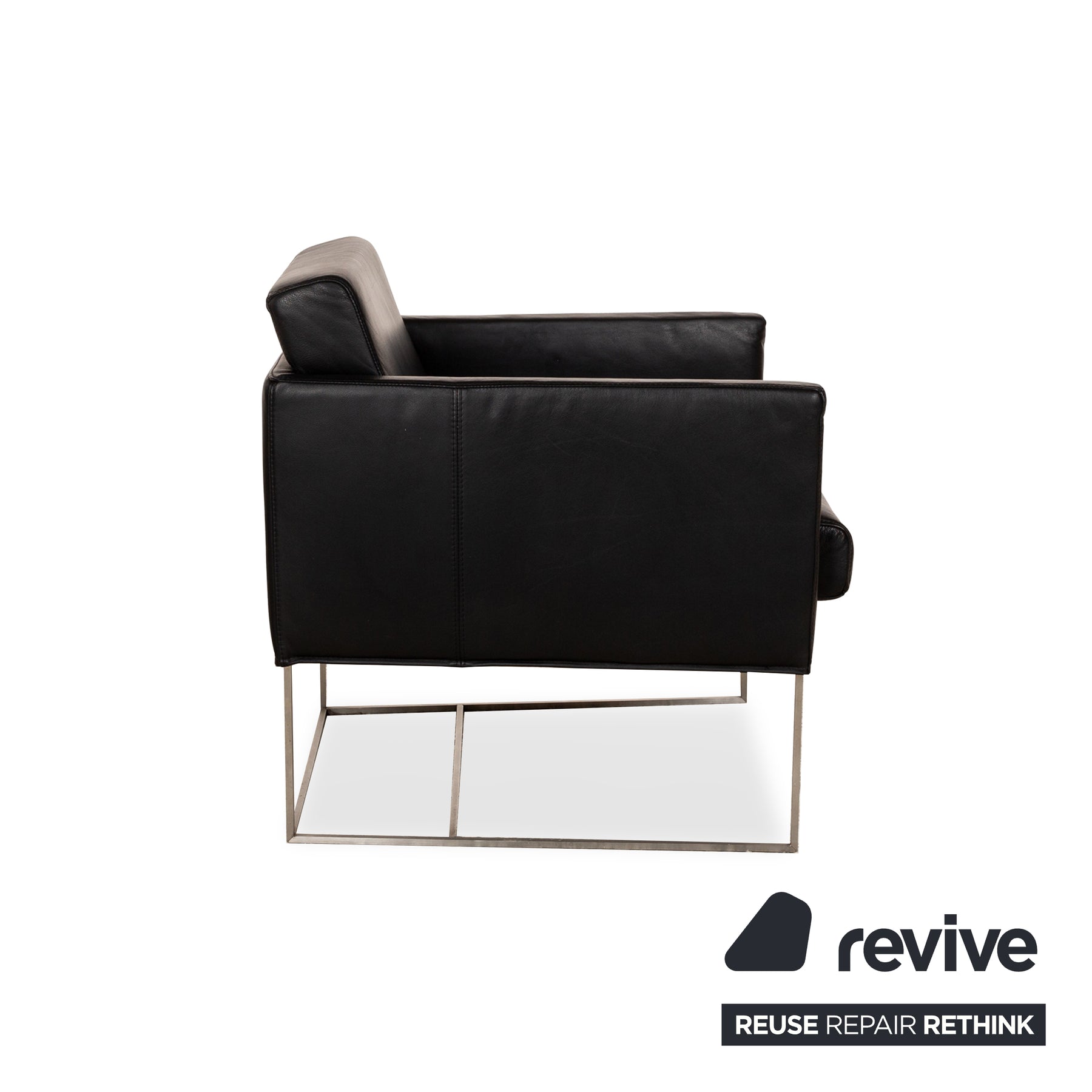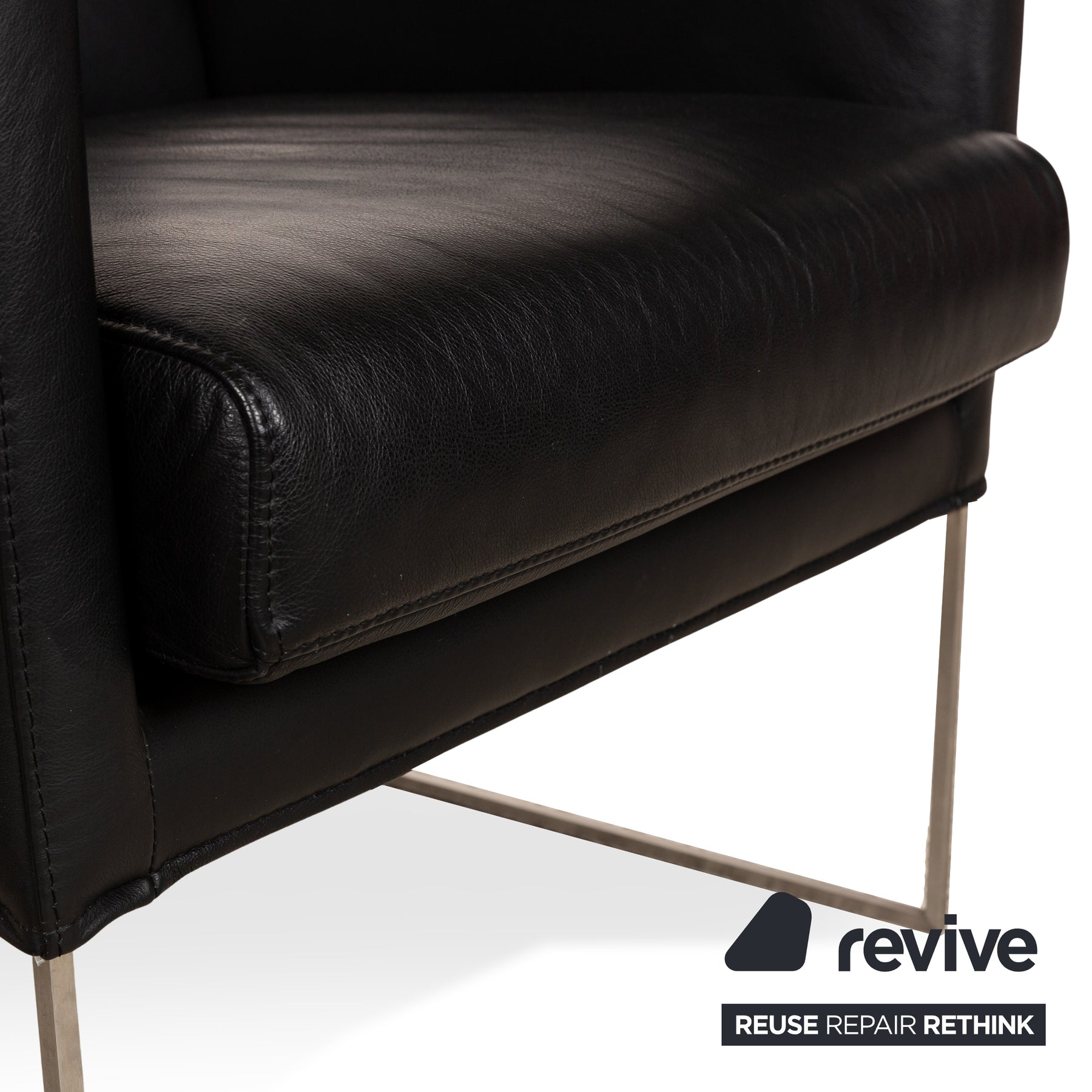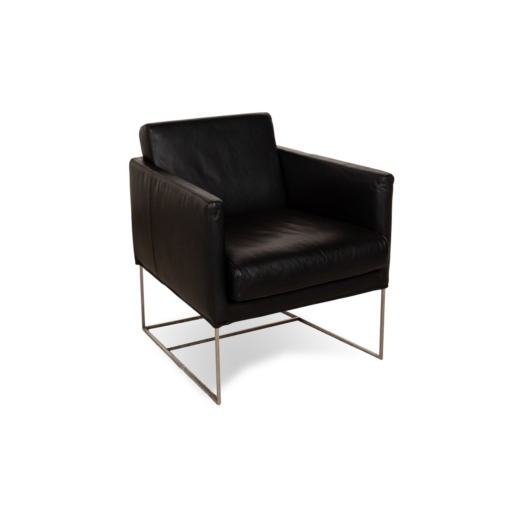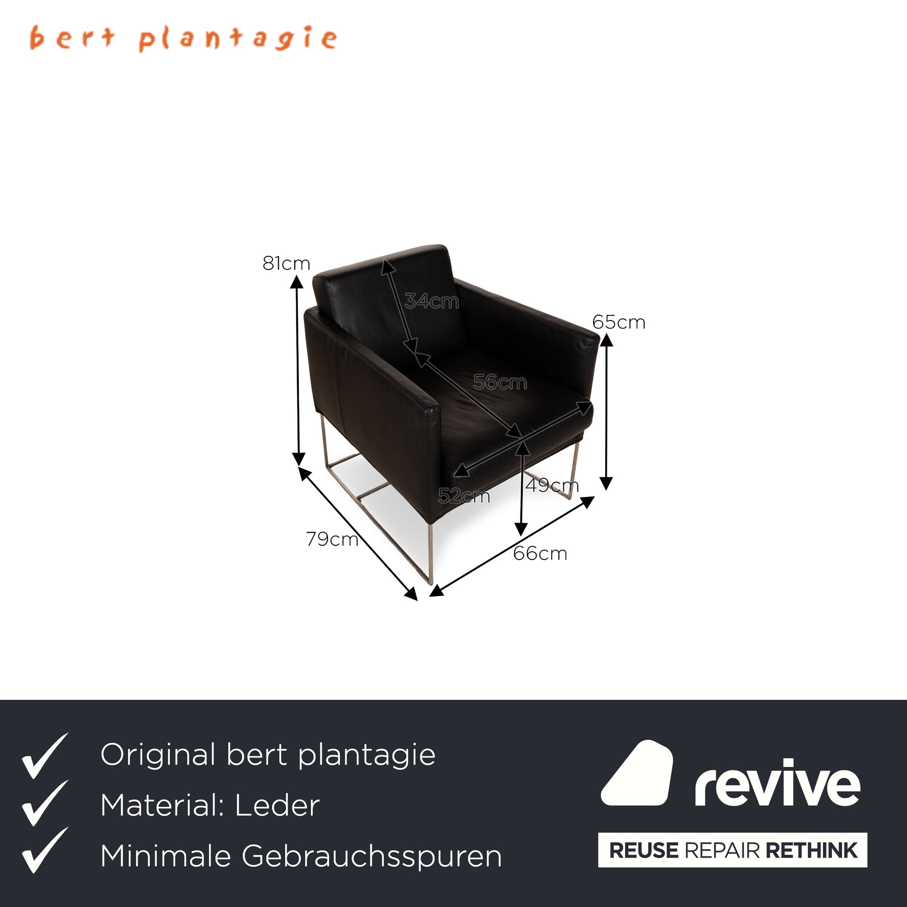 Der Sessel von bert plantagie ist mit einem schwarzen Echtleder bezogen und steht auf einem schmalen Metallgestell. Er zeichnet sich durch das stilvolle Design und die moderne Optik aus.