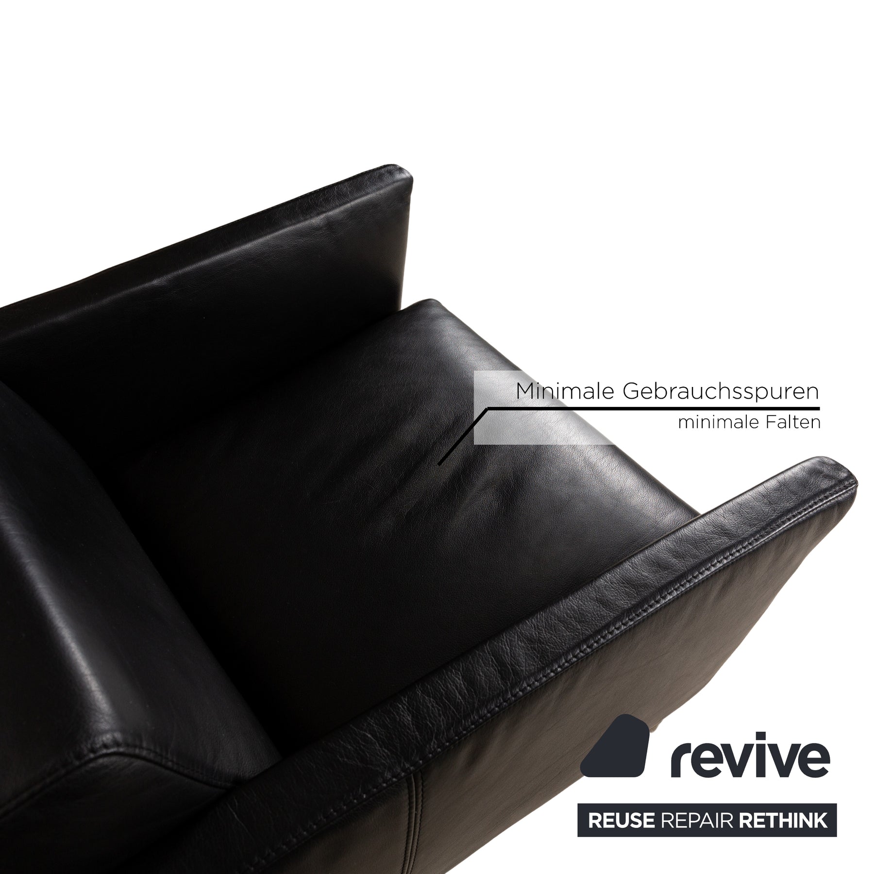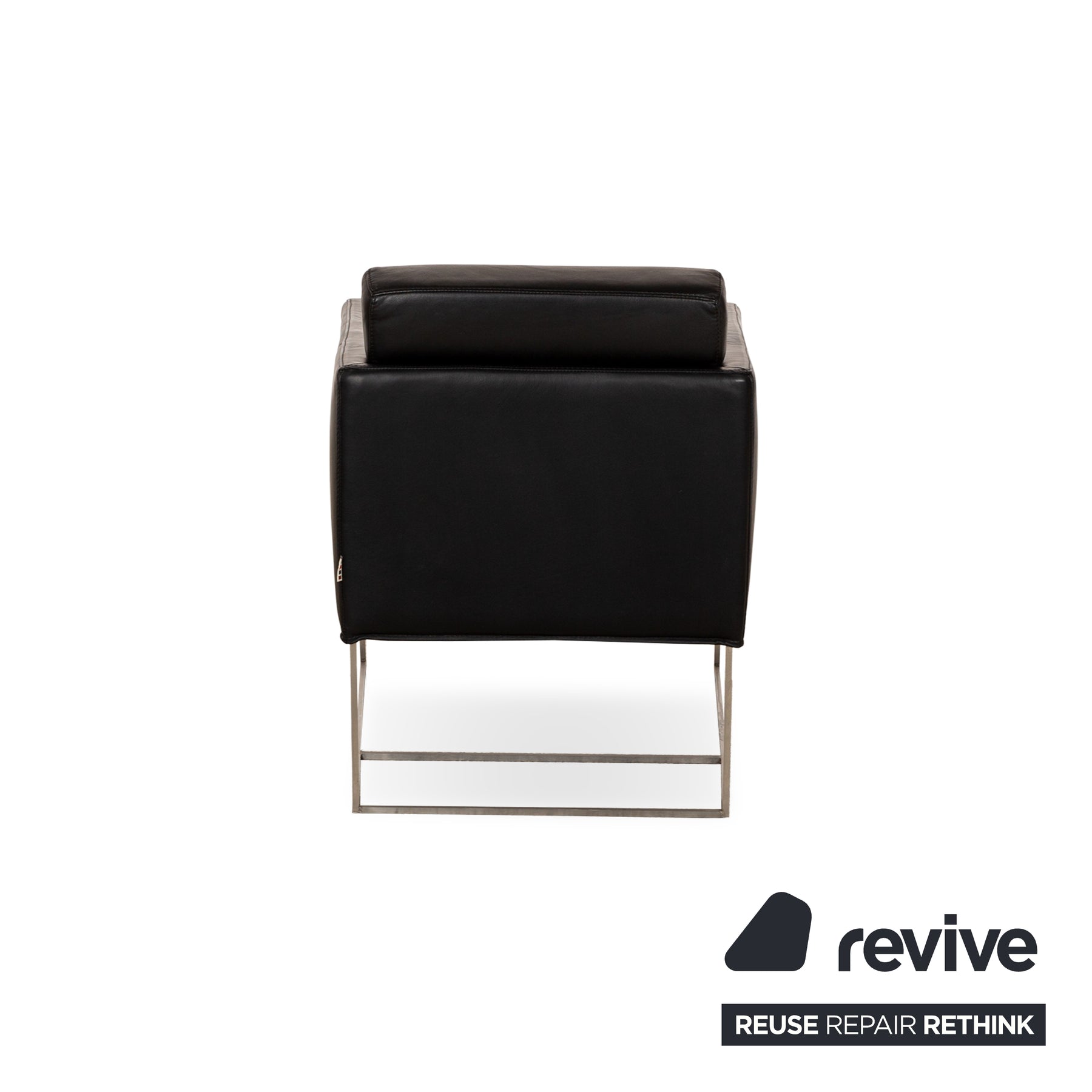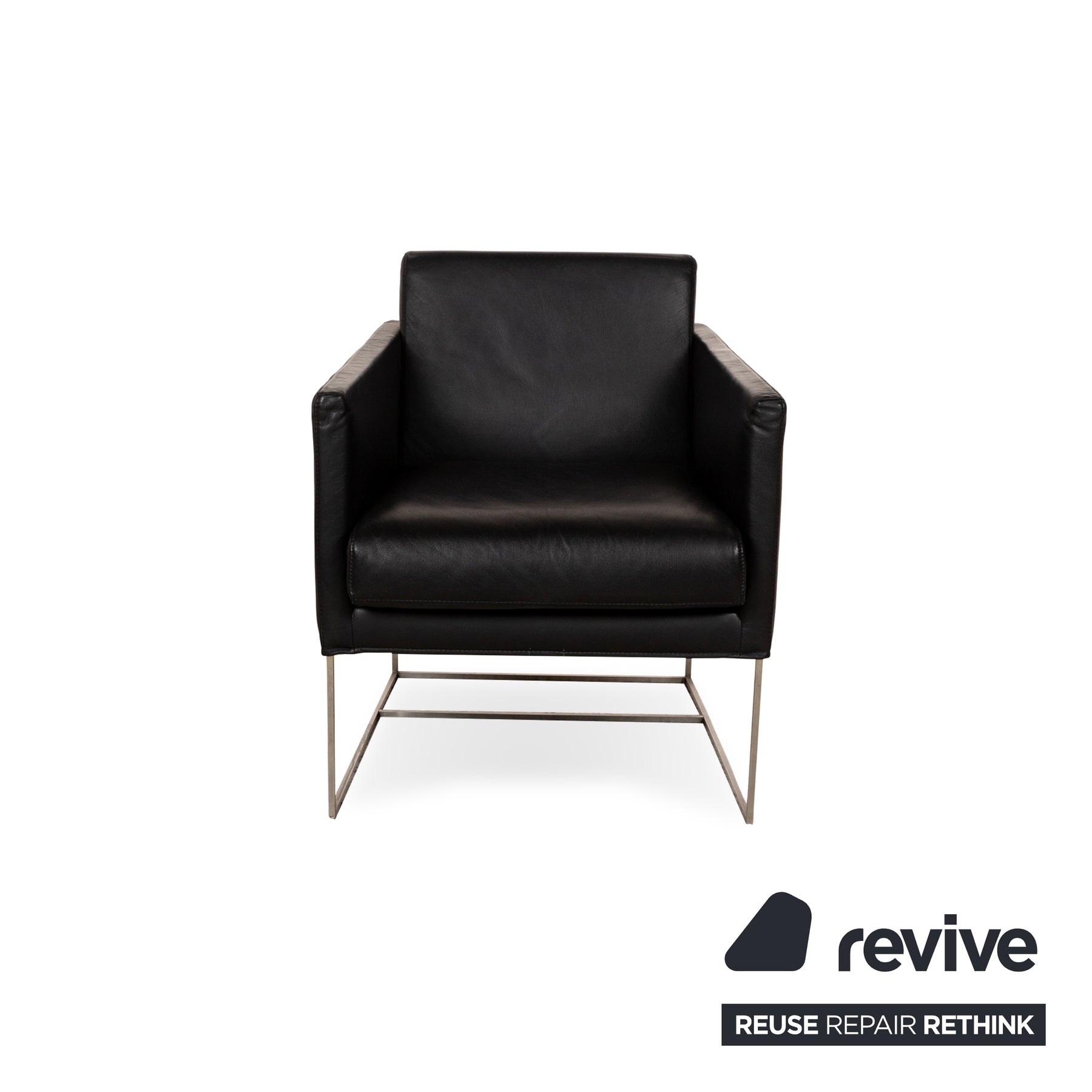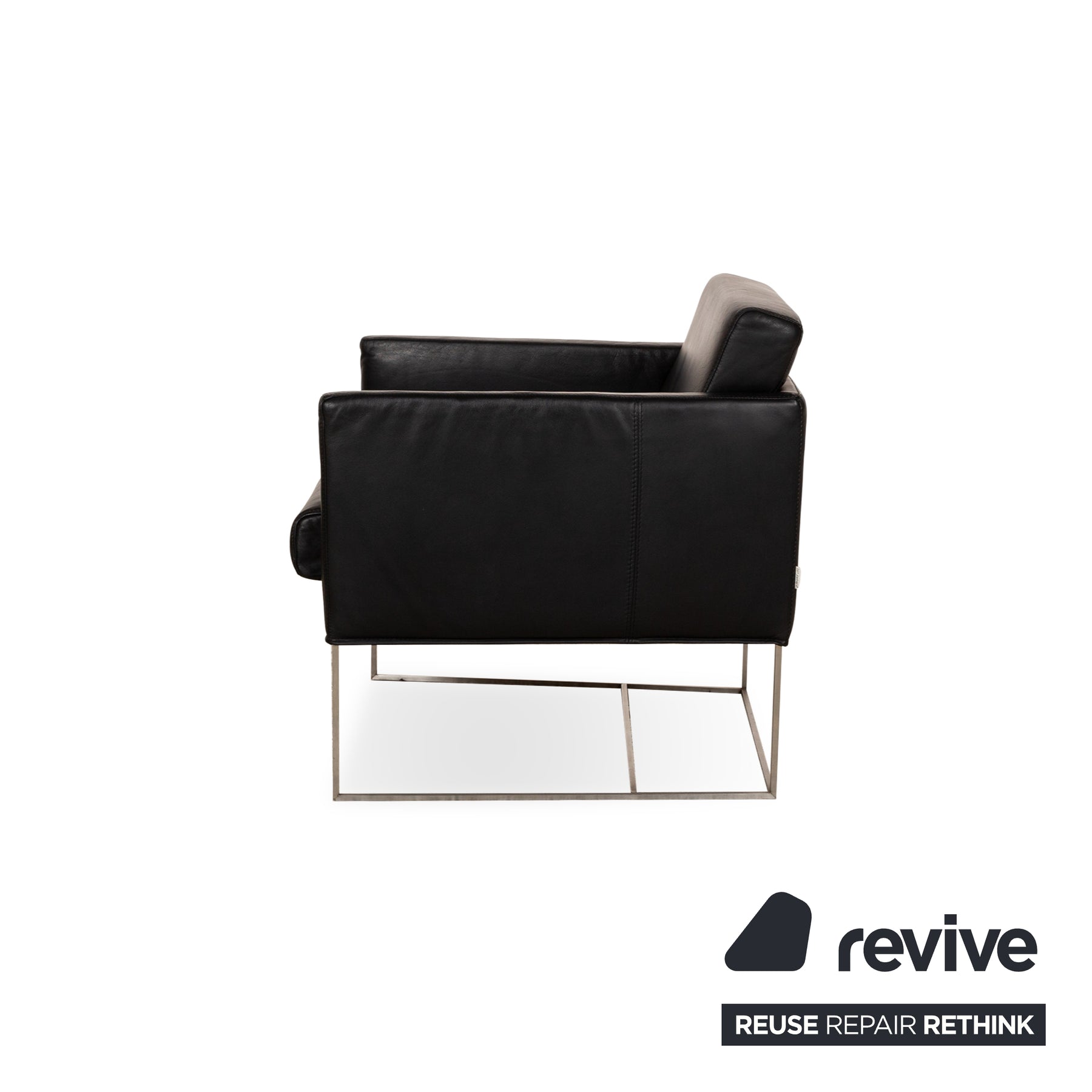 Der Sessel von bert plantagie ist mit einem schwarzen Echtleder bezogen und steht auf einem schmalen Metallgestell. Er zeichnet sich durch das stilvolle Design und die moderne Optik aus.
