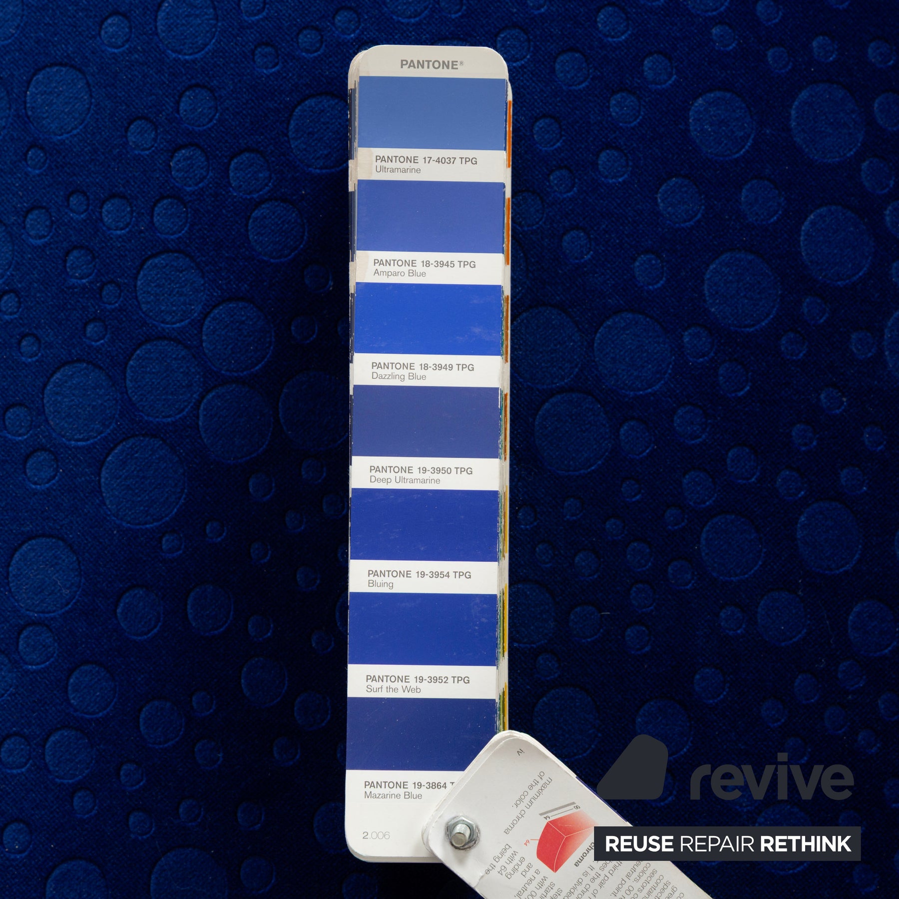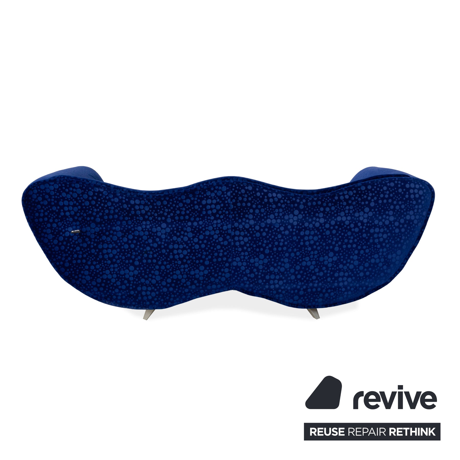 Der Zweisitzer Laola Hookipa ist mit einem blauen Stoff bezogen und steht auf schlichten Füßen. Er zeichnet sich durch das extravagante Design, die geschwungenen Formen und die auffällige Farbe aus.