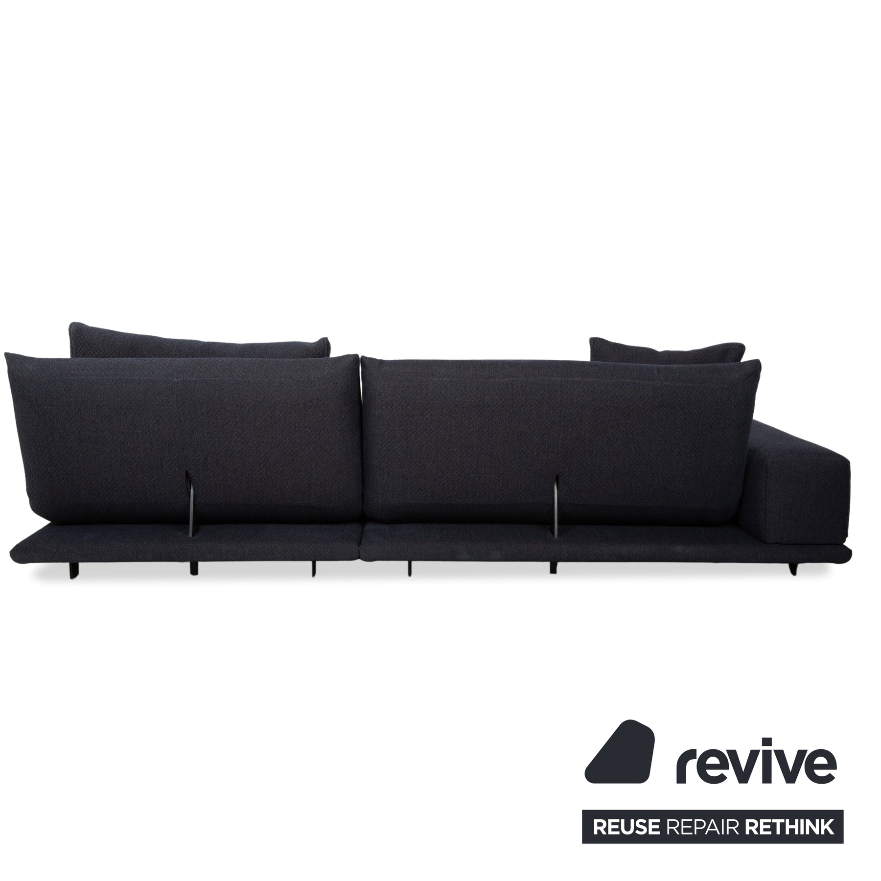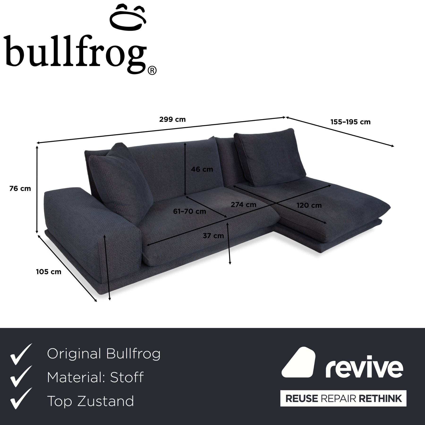 Das Bullfrog Zaza Ecksofa ist ein extrem vielseitig verstellbares Sofa. Mithilfe der Fernbedienungen lassen sich die Rückenlehnen verstellen und das Sofa bspw. zu einer großen Liegefläche verwandeln. Es ist geprägt von dunkelblauem Stoff und dezenten, schwarzen Füßen. Insgesamt hinterlässt es einen edlen und stilvollen Eindruck, der sich aufgrund der Hochwertigkeit auch lange hält.