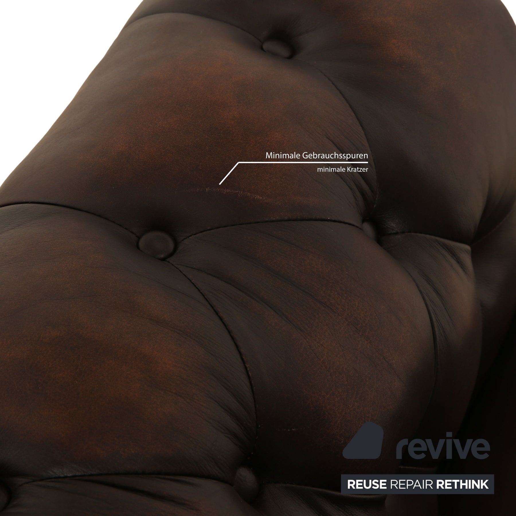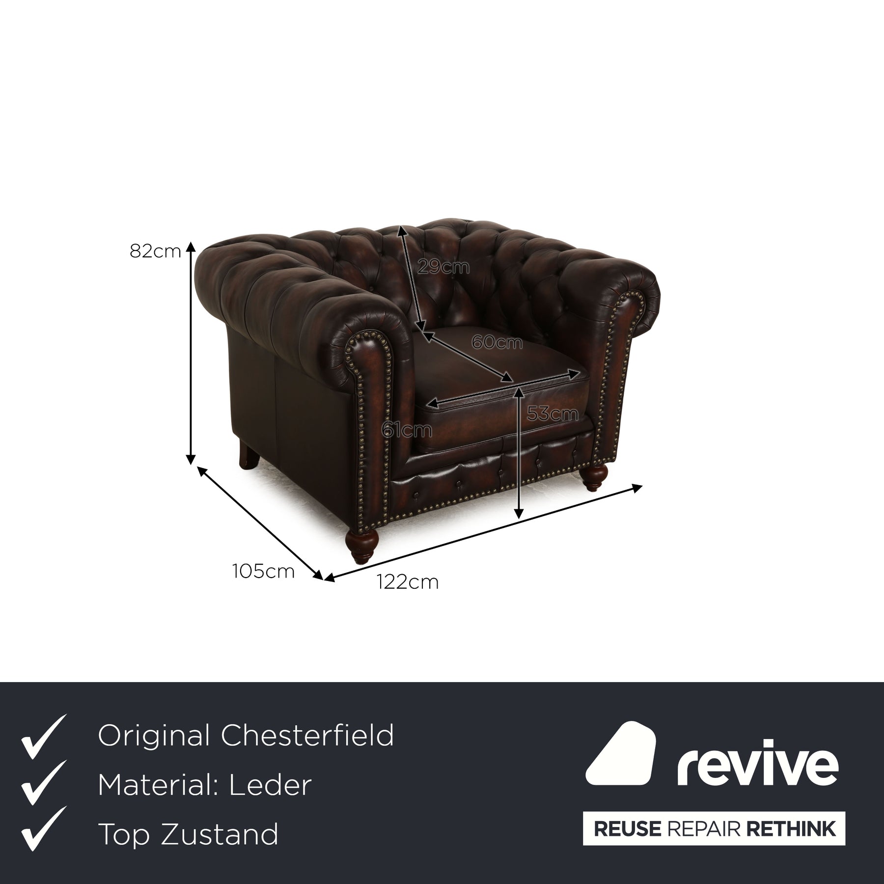 Der Chesterfield Sessel ist mit einem braunen Echtleder bezogen und steht auf braunen Füßen. Der angesagte Retrolook und die abgerundeten Kanten zeichnen ihn aus.