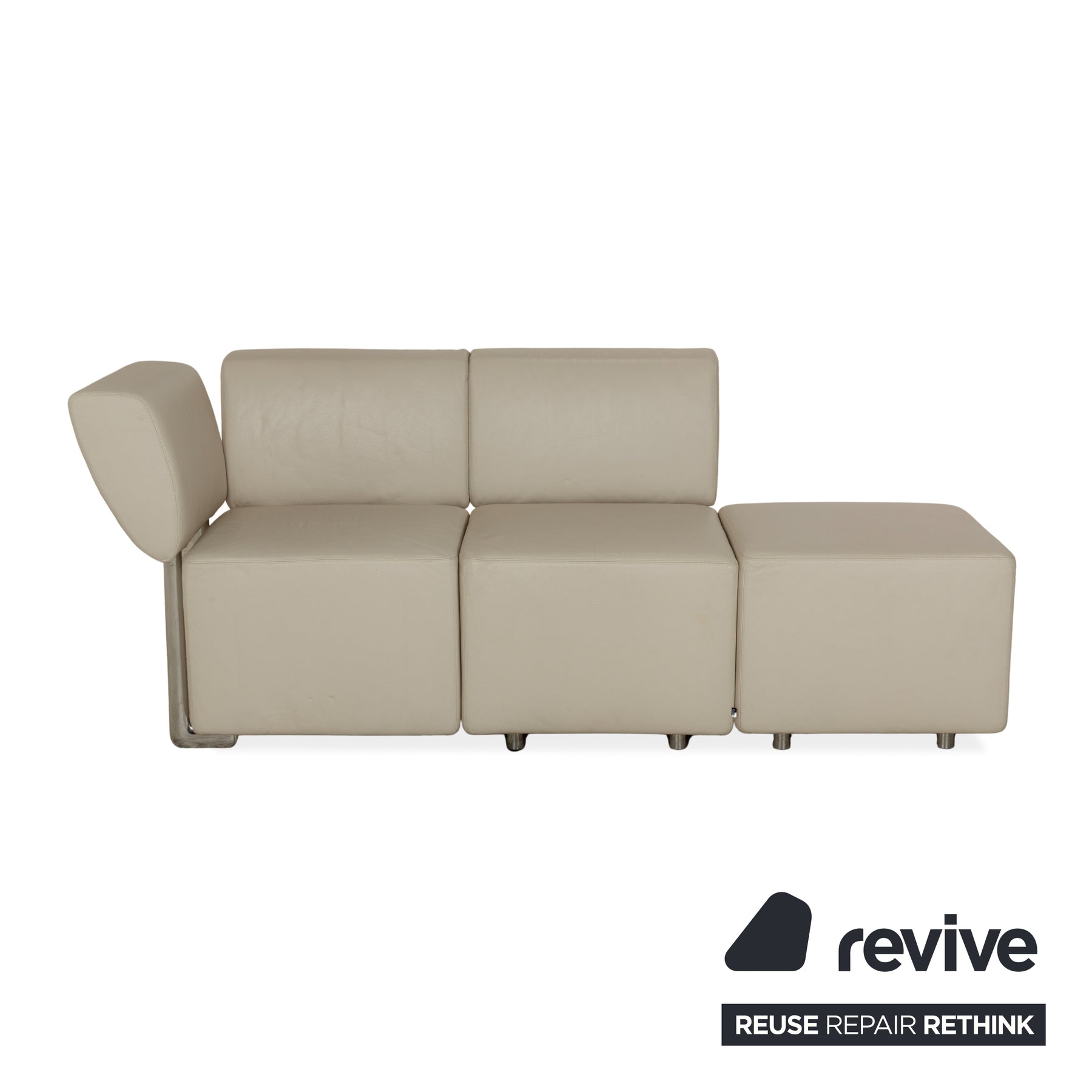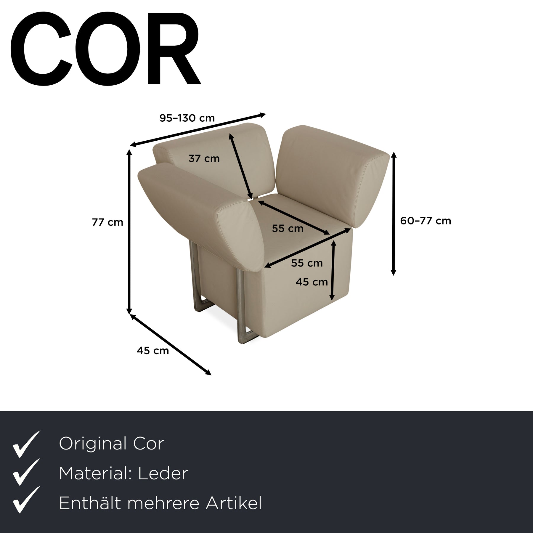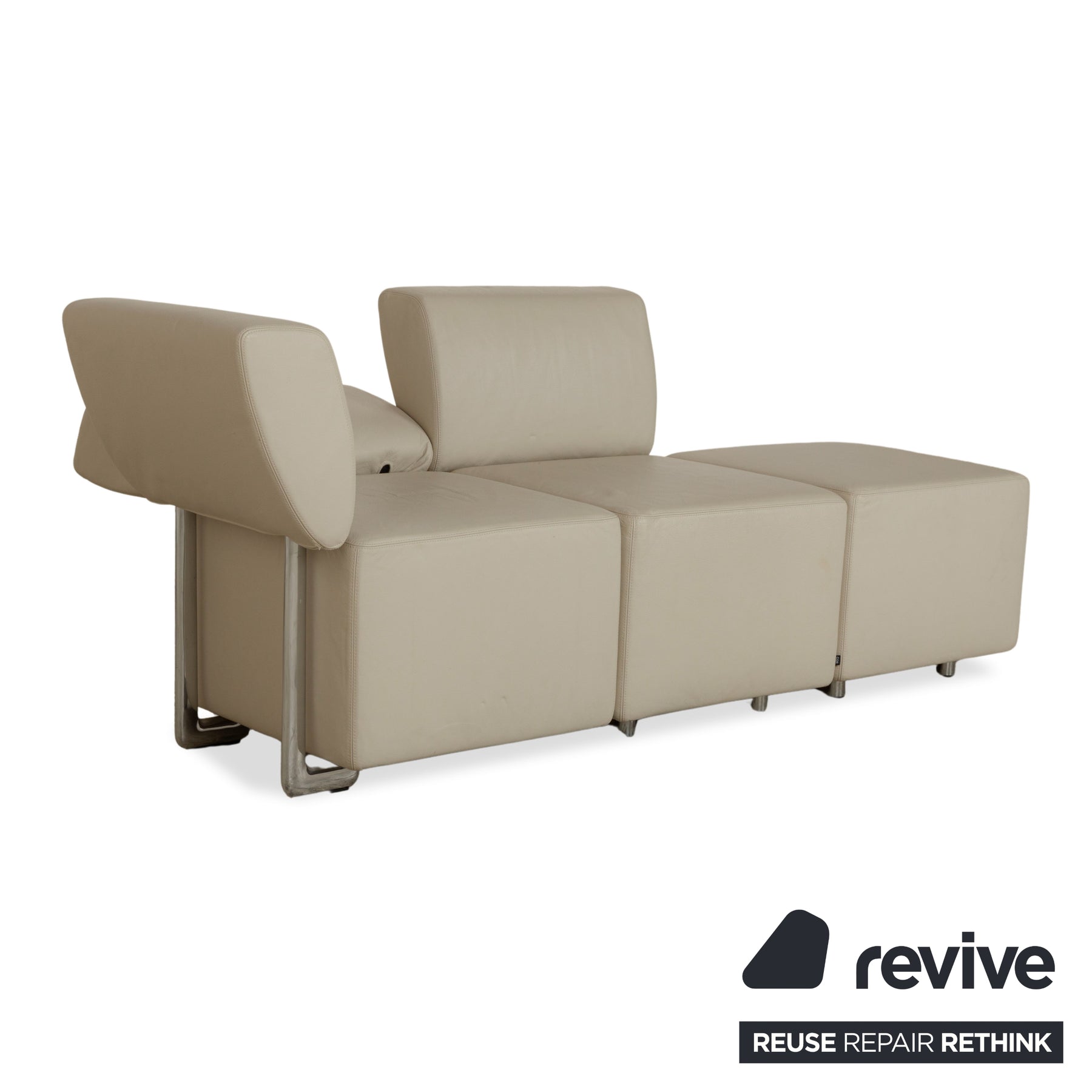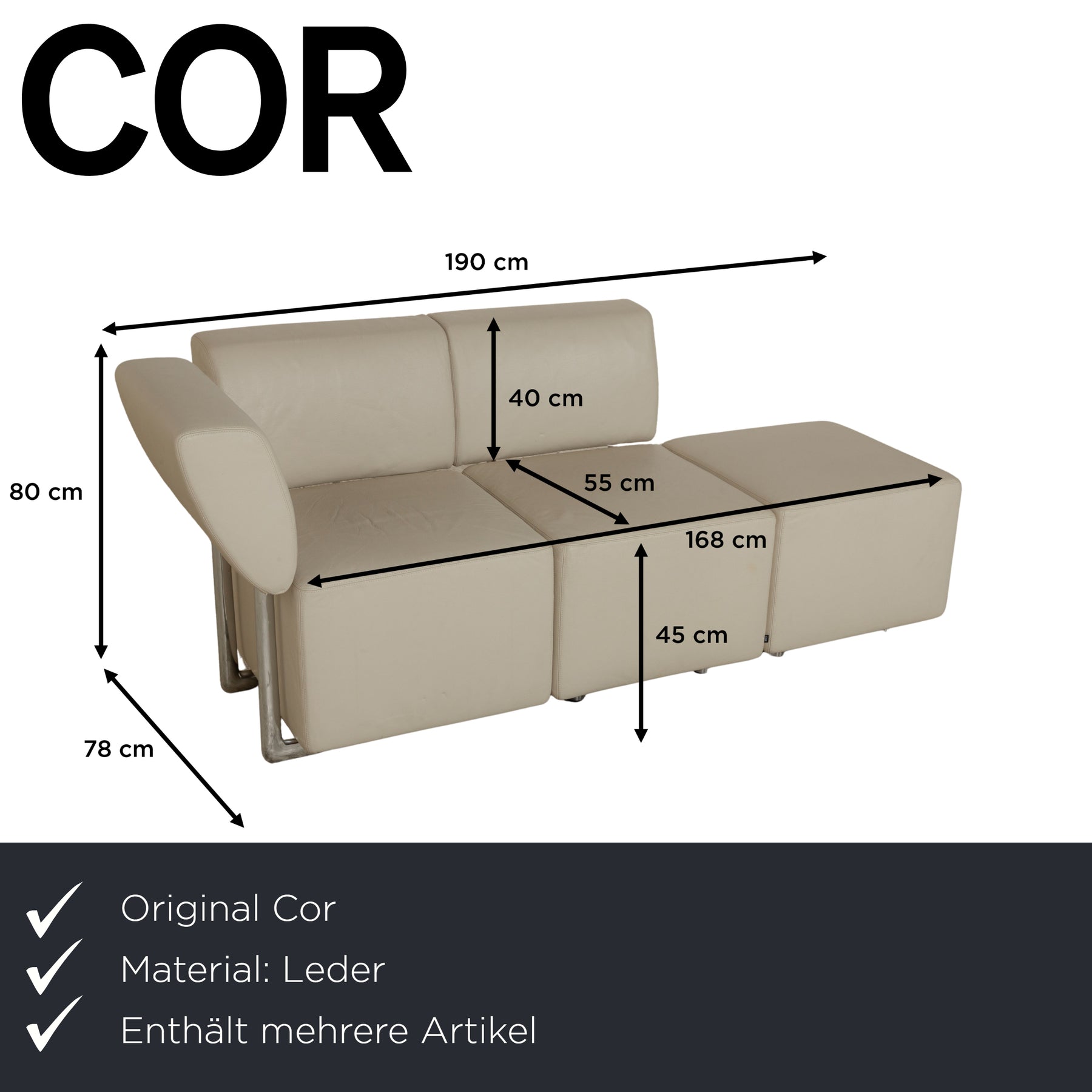 Der Dreisitzer Clou mit dem dazu passenden Sessel von Cor sind mit einem cremefarbenen Echtleder bezogen und zeichnen sich durch ihr außergewöhnliches, kubisches Design aus. Die Rückenlehne und die Armlehnen können verstellt werden.