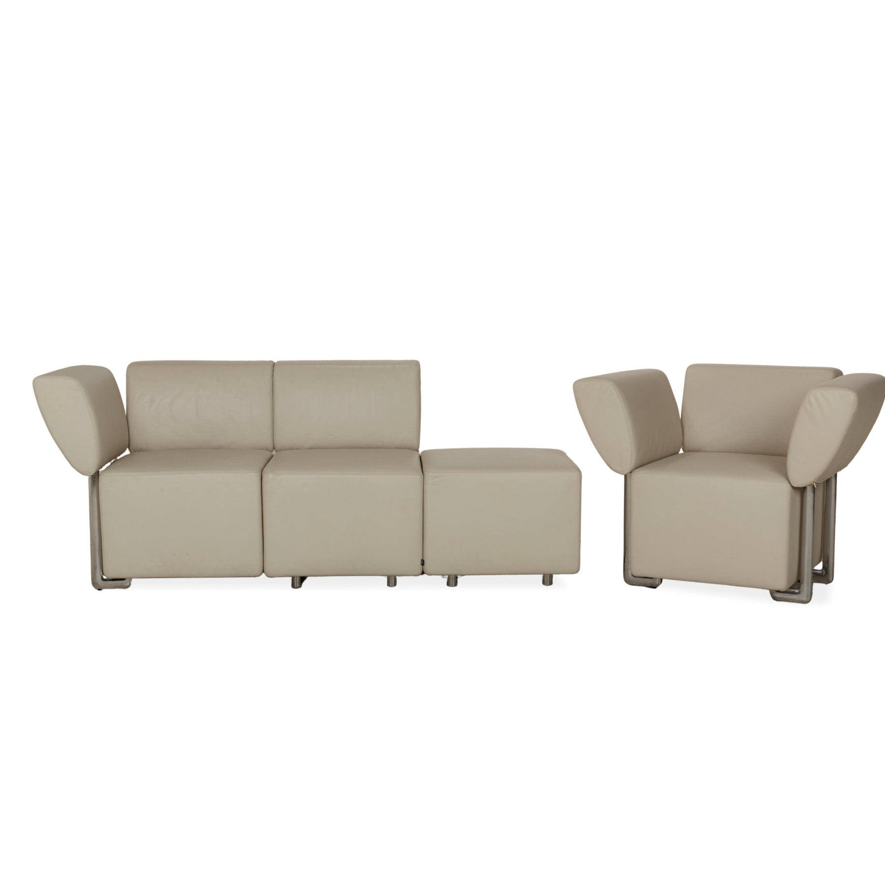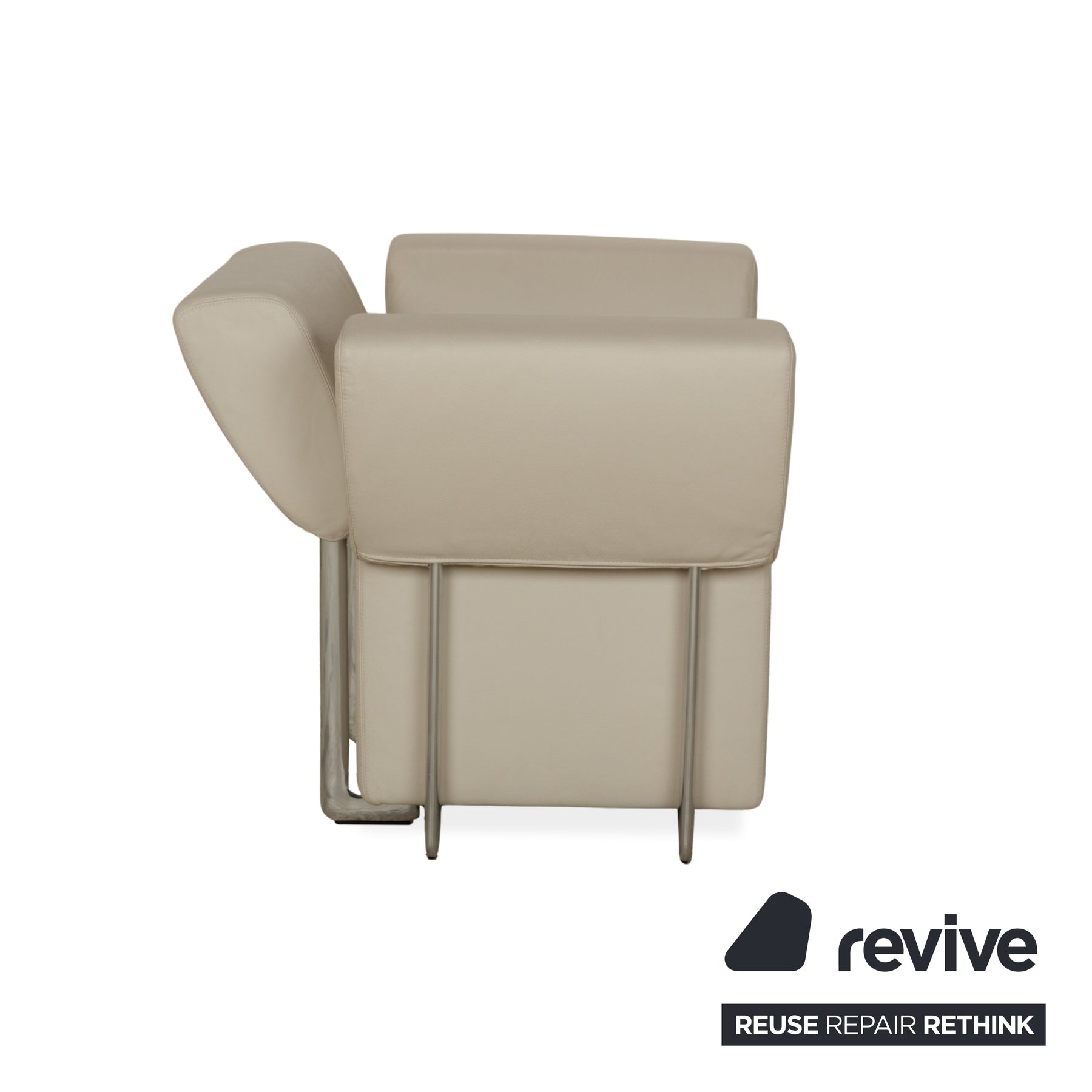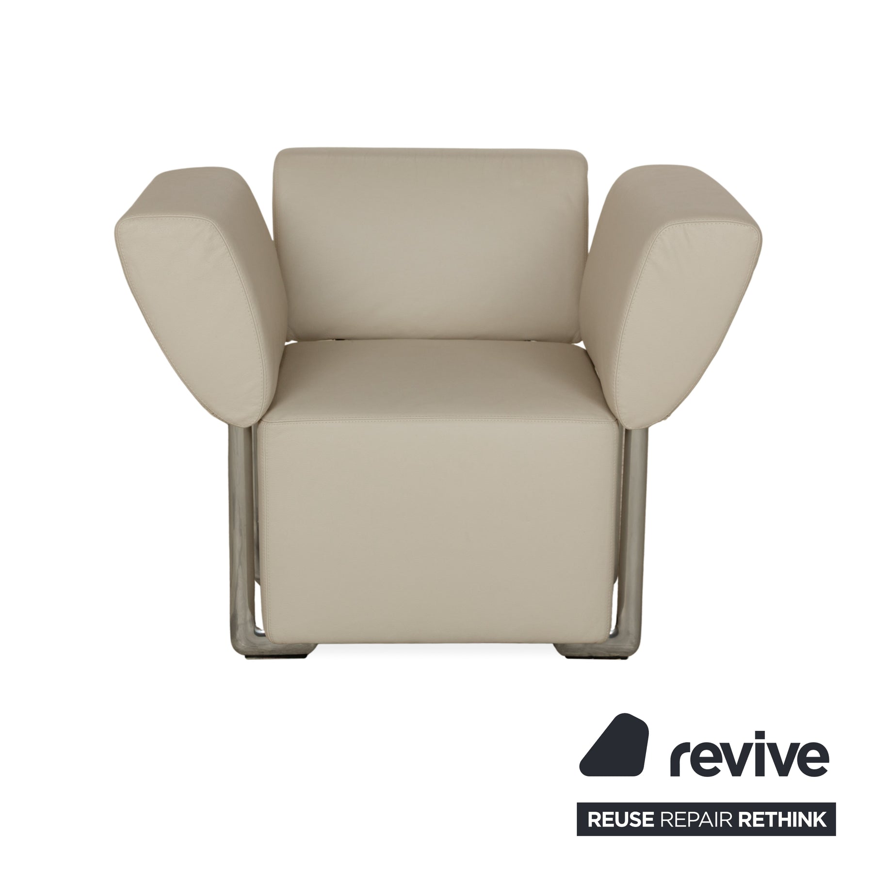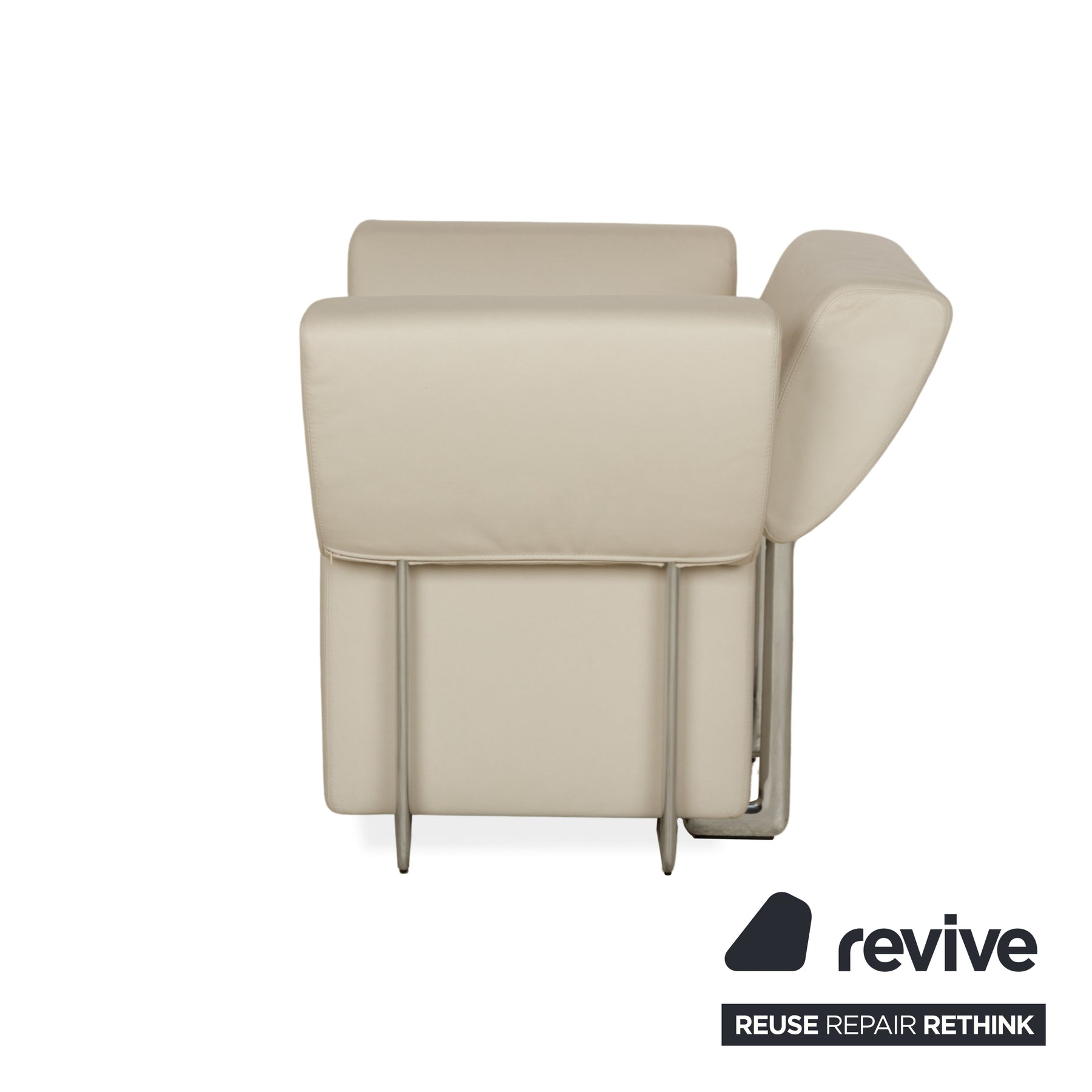Der Dreisitzer Clou mit dem dazu passenden Sessel von Cor sind mit einem cremefarbenen Echtleder bezogen und zeichnen sich durch ihr außergewöhnliches, kubisches Design aus. Die Rückenlehne und die Armlehnen können verstellt werden.
