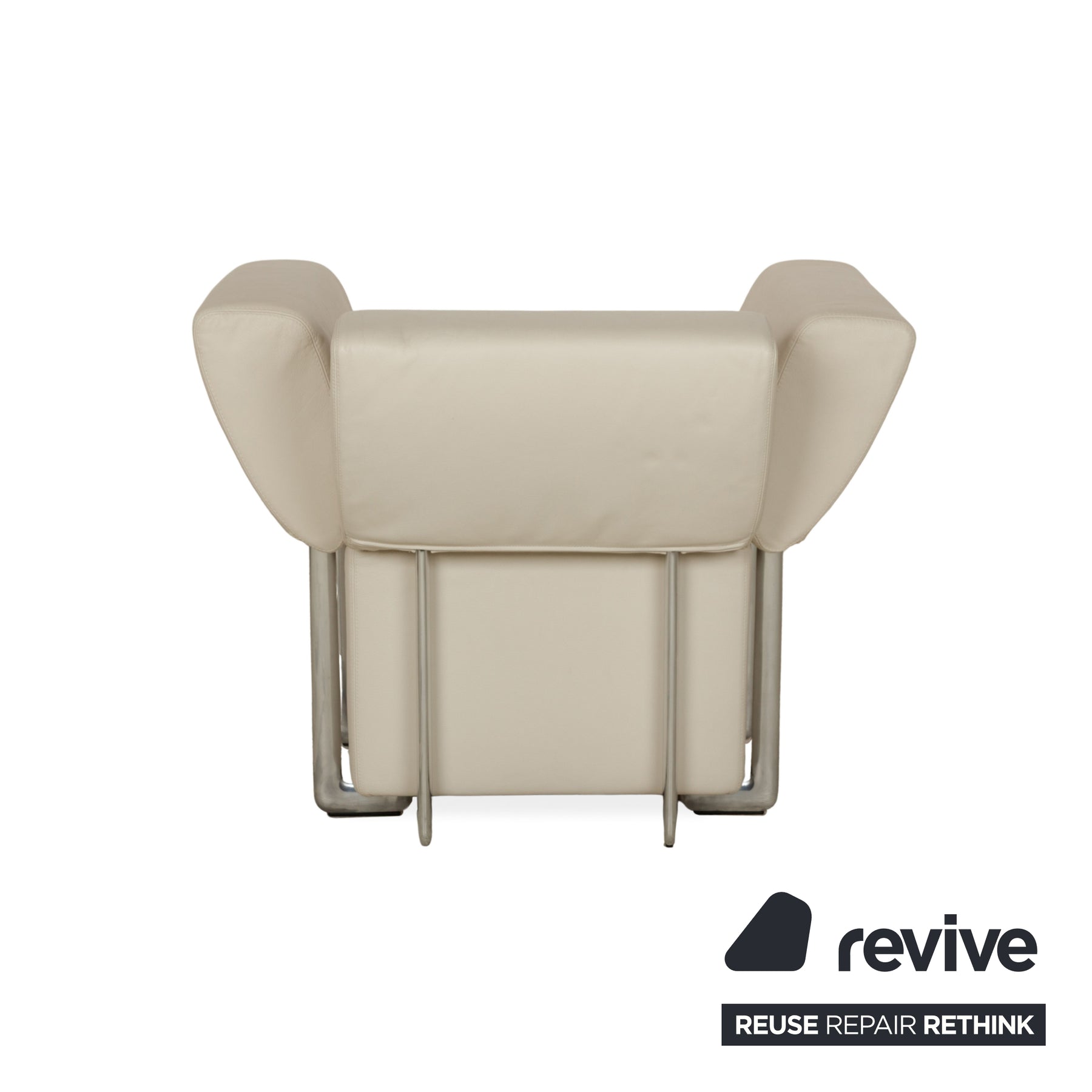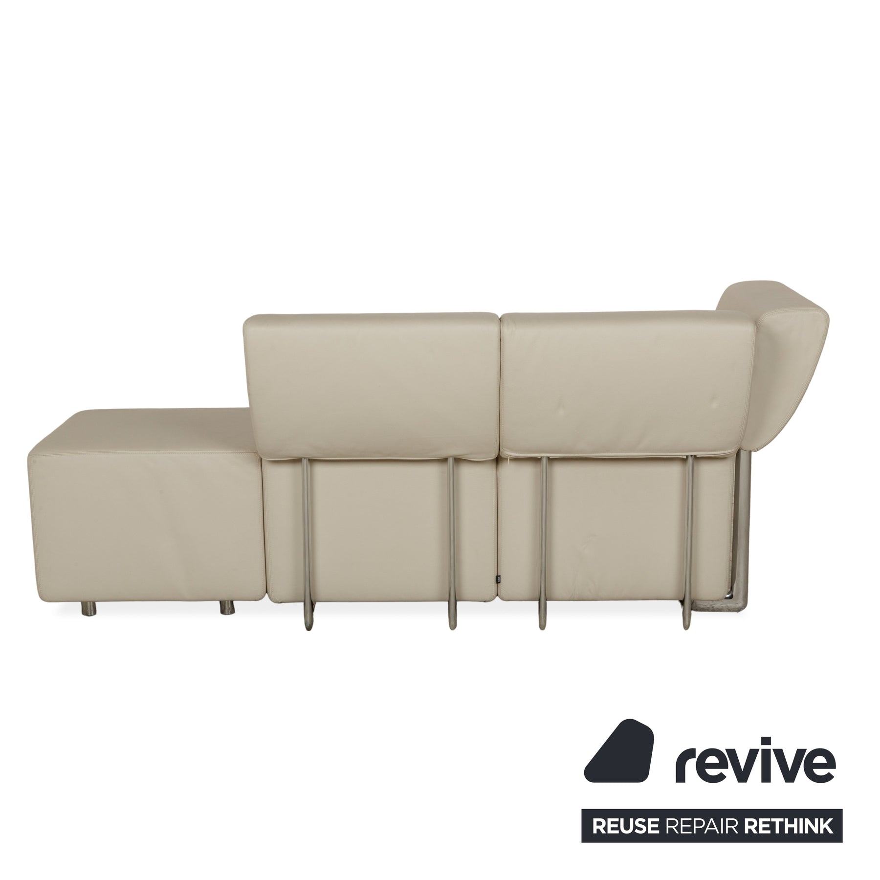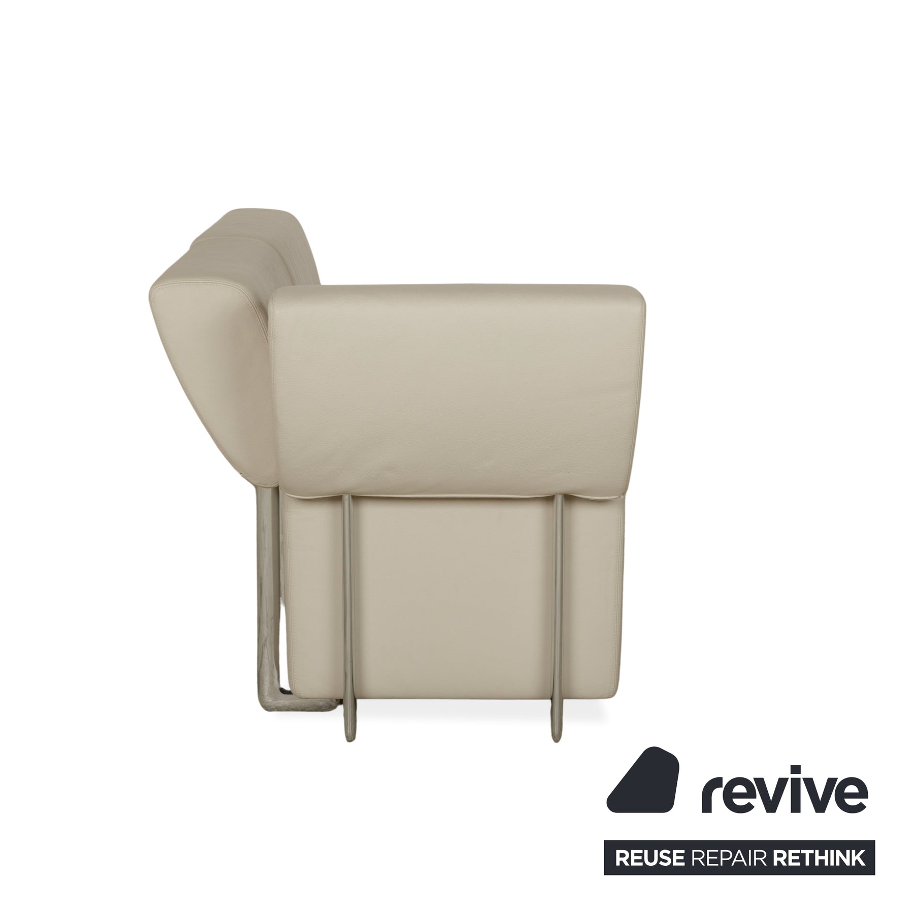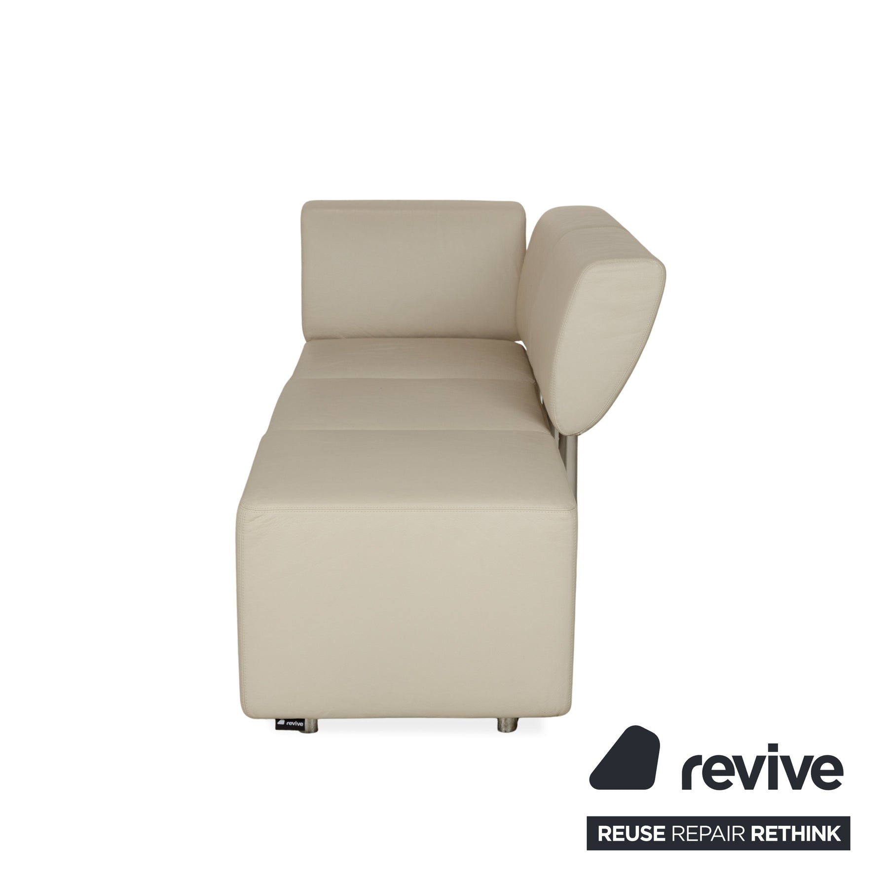 Der Dreisitzer Clou mit dem dazu passenden Sessel von Cor sind mit einem cremefarbenen Echtleder bezogen und zeichnen sich durch ihr außergewöhnliches, kubisches Design aus. Die Rückenlehne und die Armlehnen können verstellt werden.