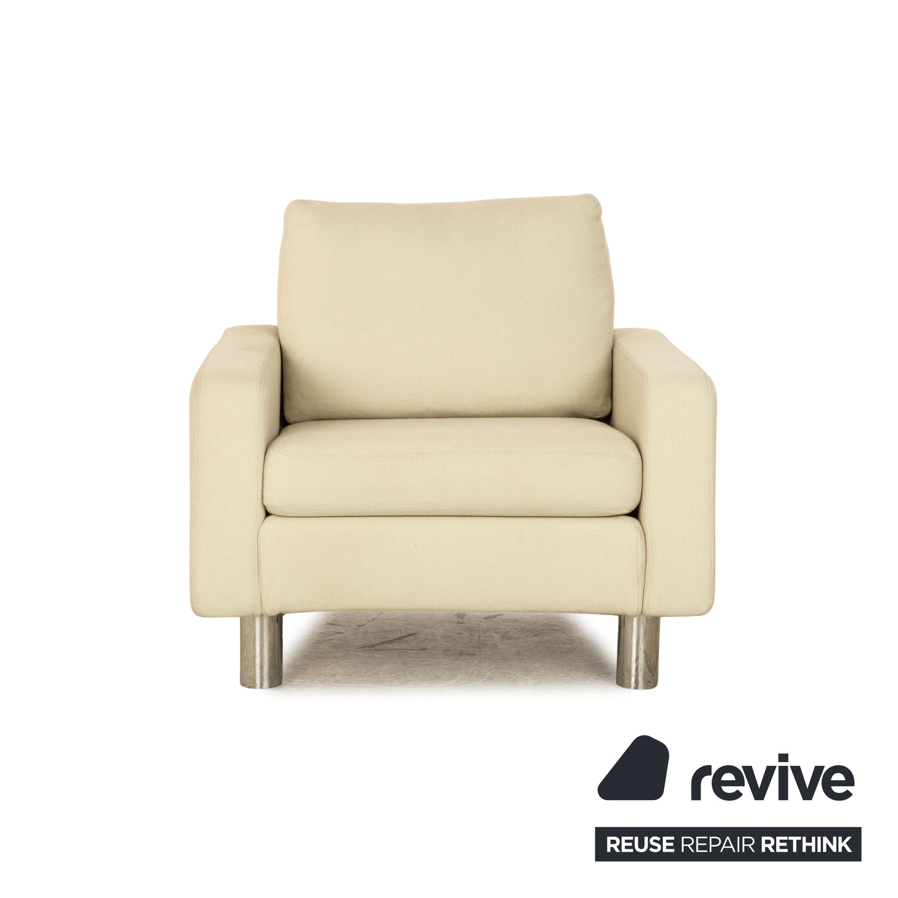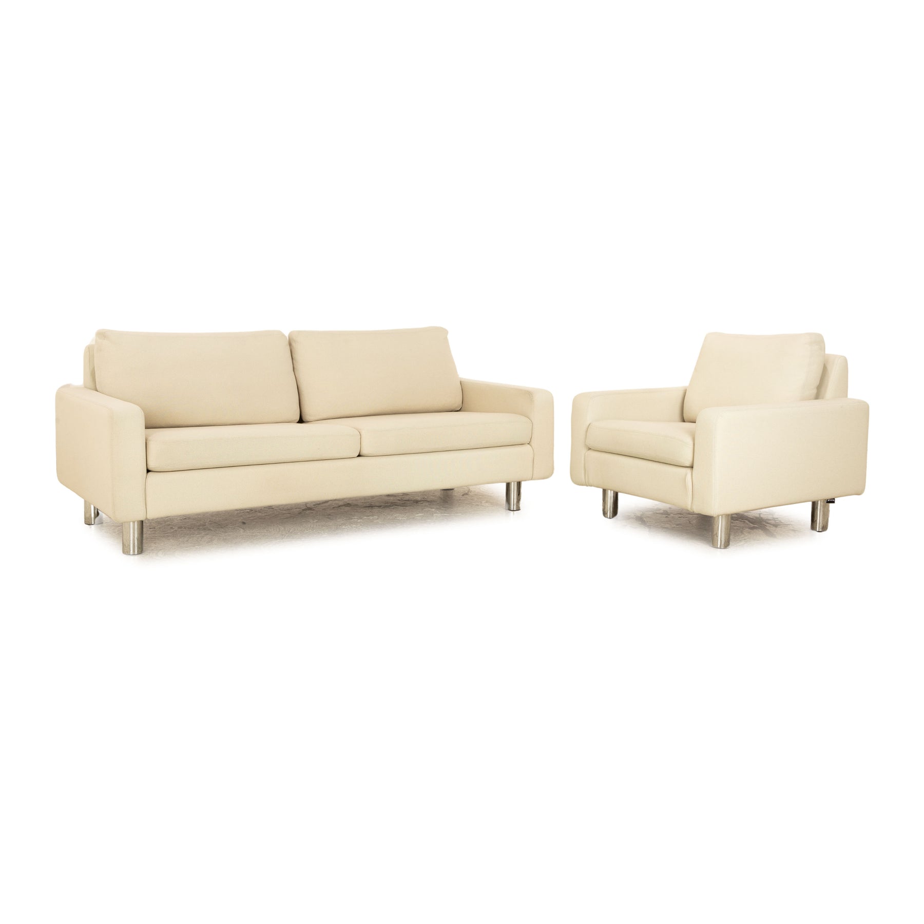 Die Sofa Garnitur Cor von Conseta ist mit einem beigen Stoff bezogen und steht auf silbernen Metallfüßen. Sie zeichnet sich durch das klassische Design und die schlichte, zeitlose Optik aus. Die Garnitur besteht aus einem Dreisitzer und einem Sessel.