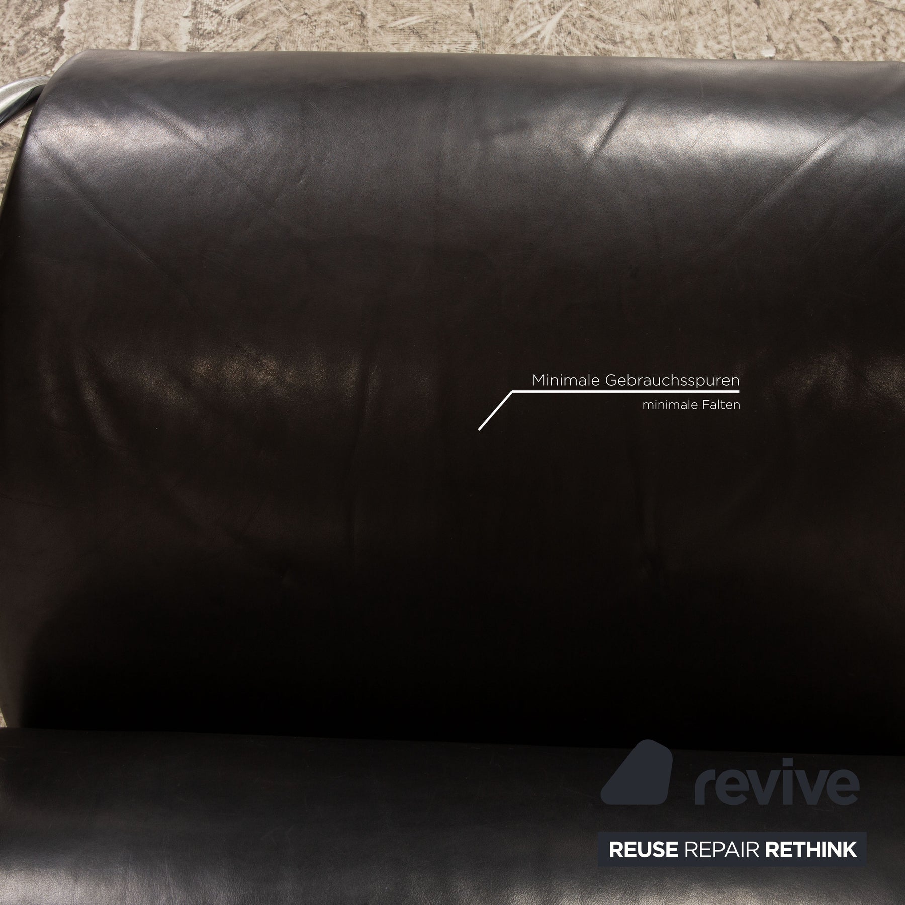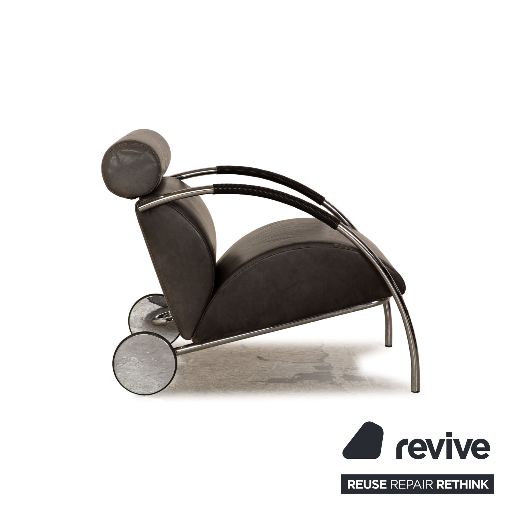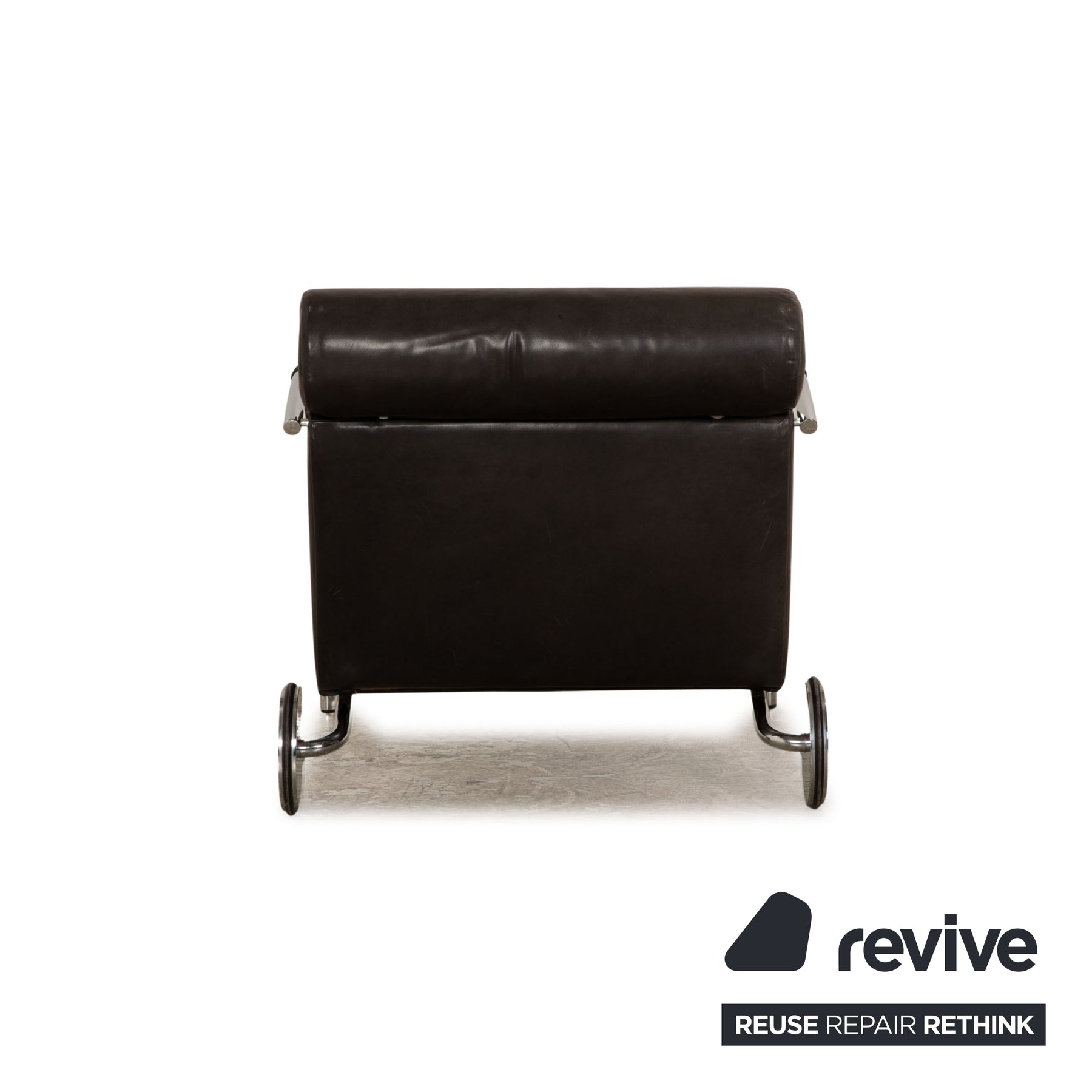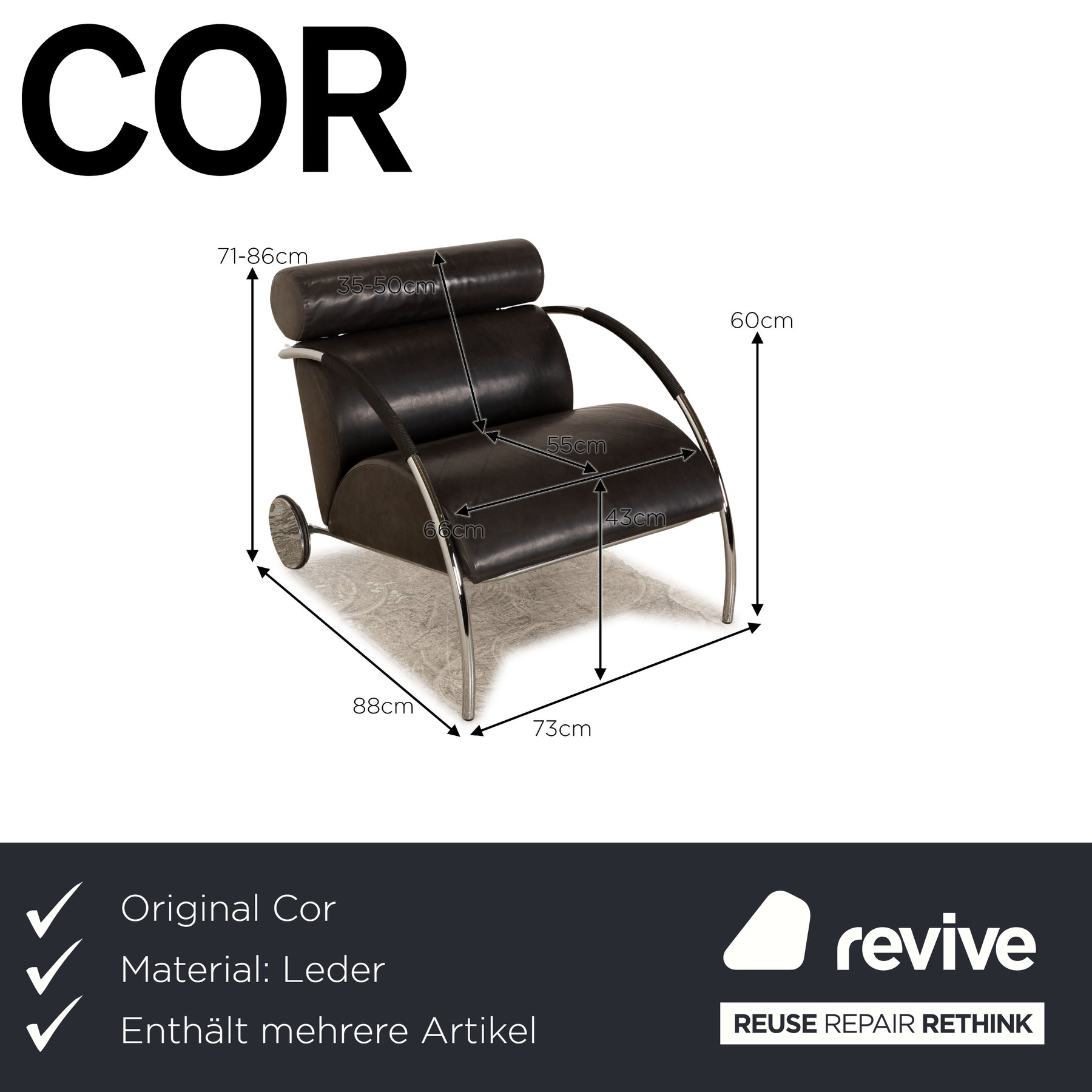 Die Zyklus Sessel Garnitur von Cor ist mit einem anthrazitfarbenen Echtleder bezogen und steht auf zwei Rollen. Das kurvige Design und die praktischen Armlehnen zeichnen sie aus.