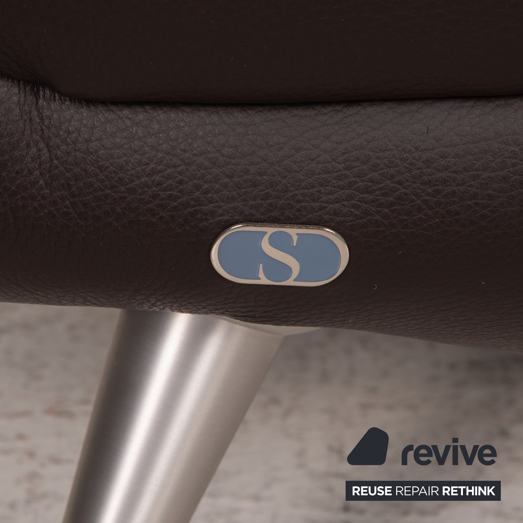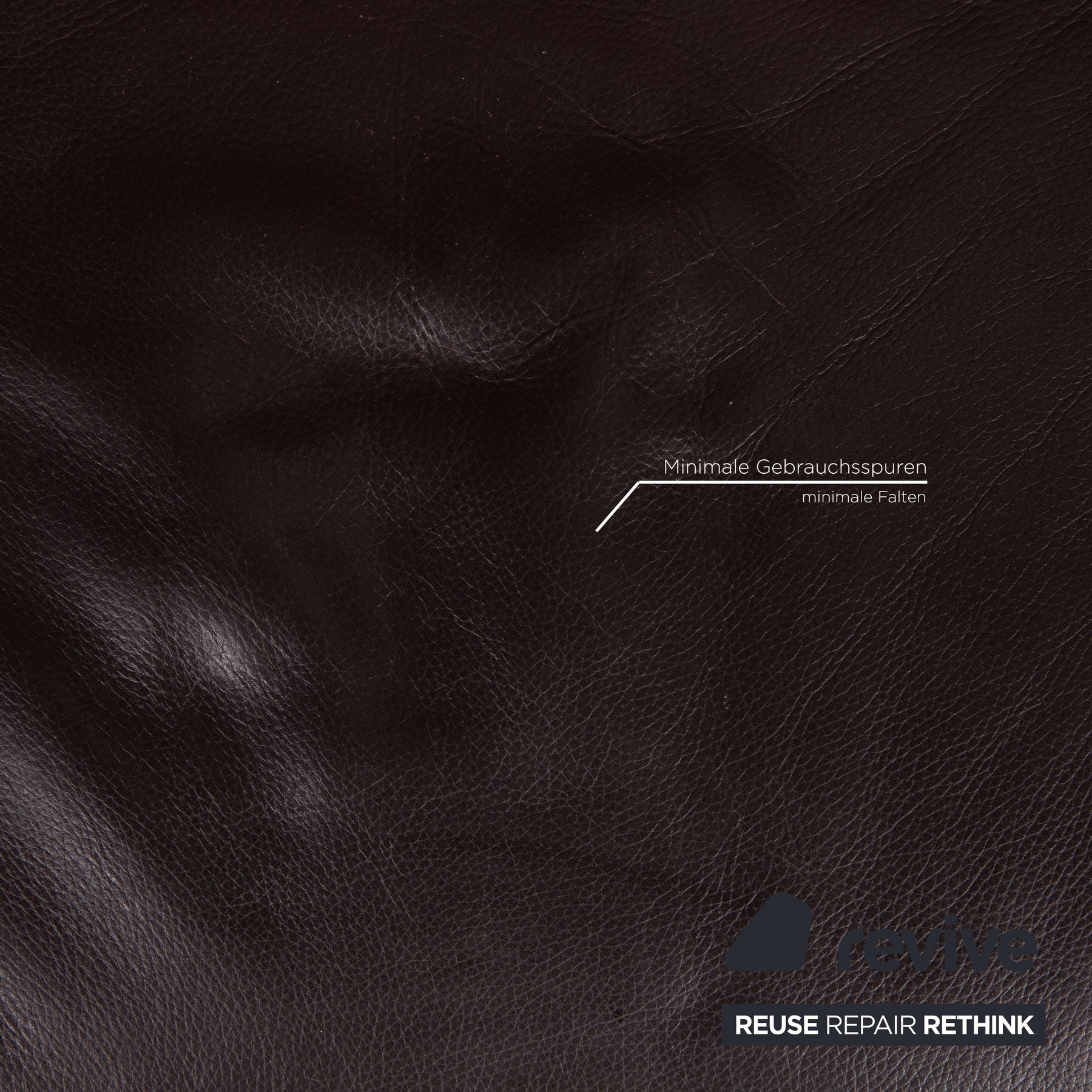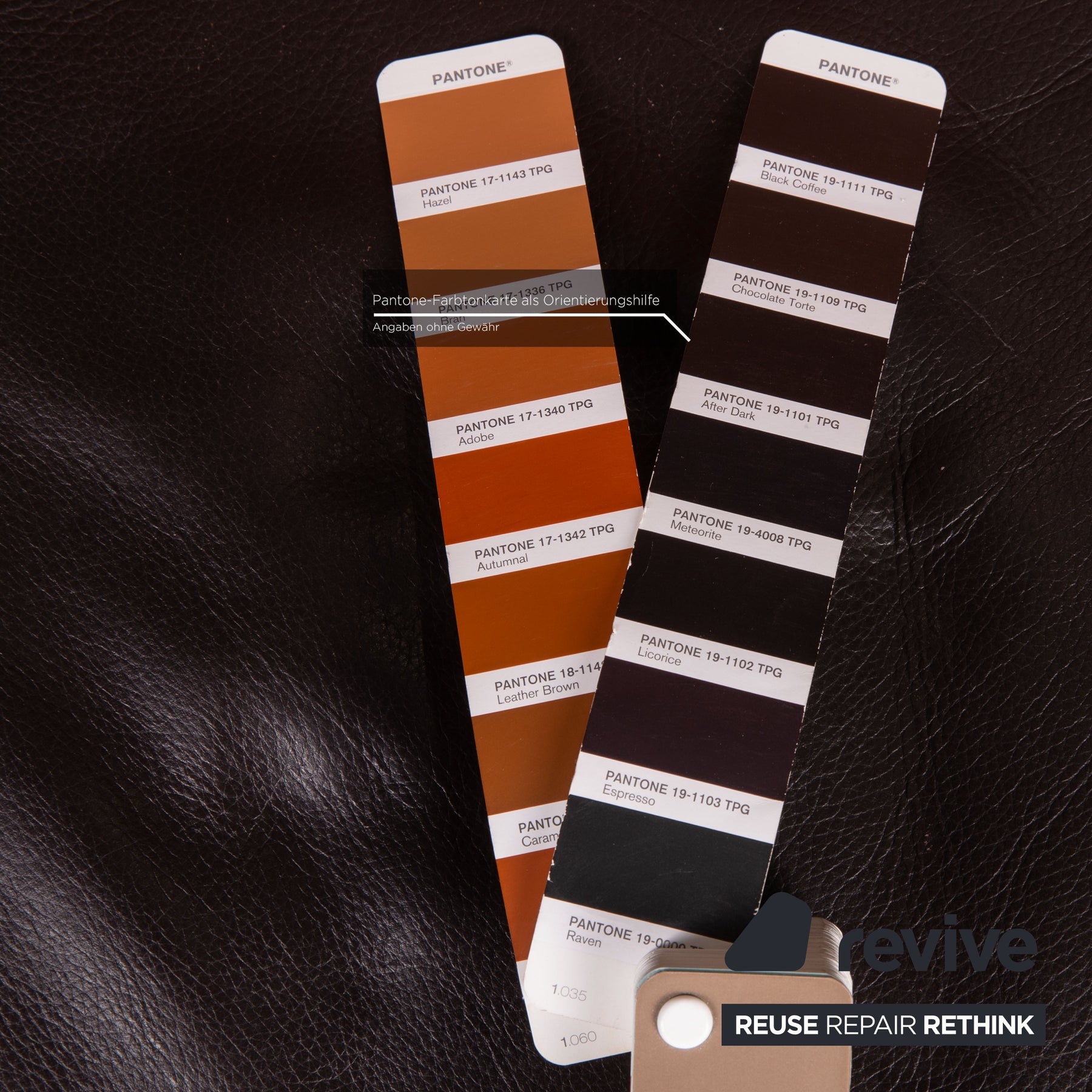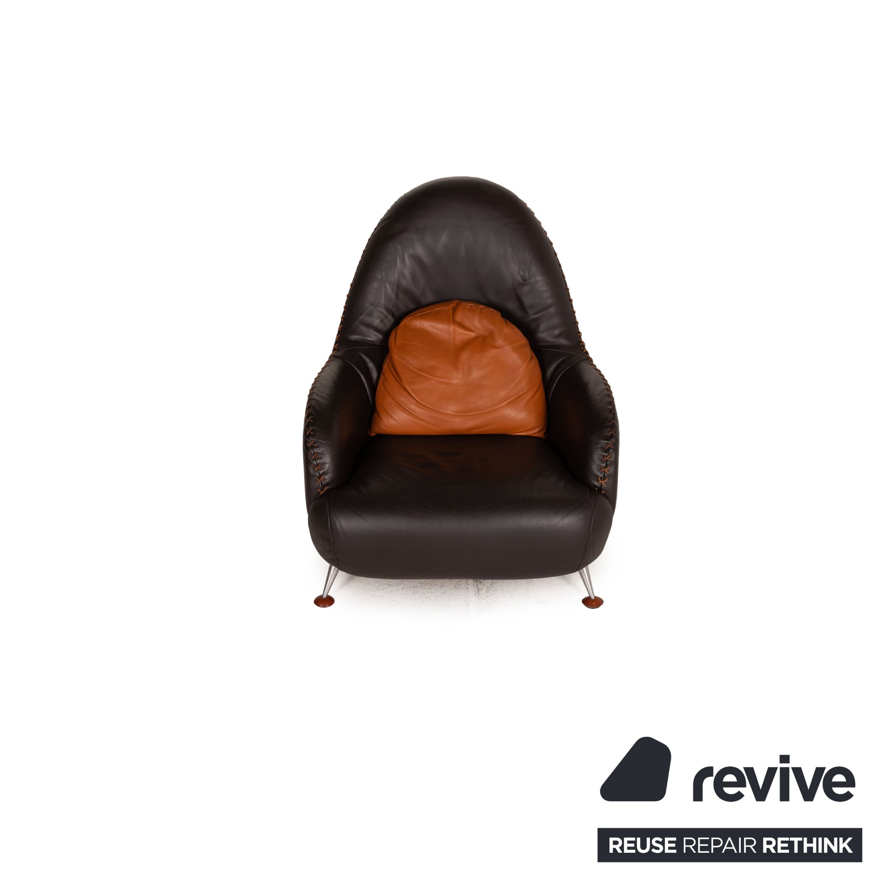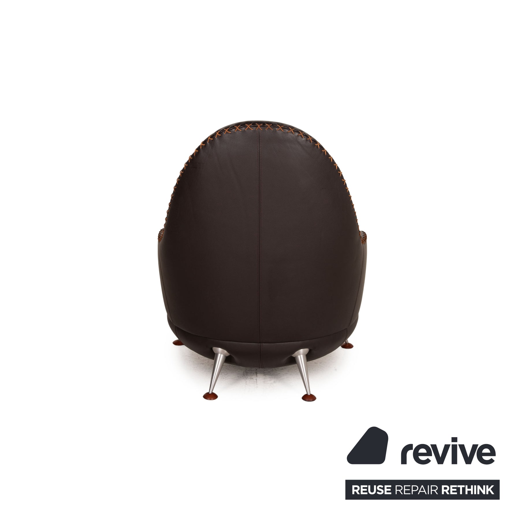 Der Sessel DS 102 von de Sede ist mit braunem Echtleder bezogen und steht auf vier Metallfüßen. Er zeichnet sich durch seine ovale Form und die Farbkombination verschiedener Brauntöne aus. An der Lehne, den Nähten und an den Füßen sind hellbraune Detail verarbeitet.