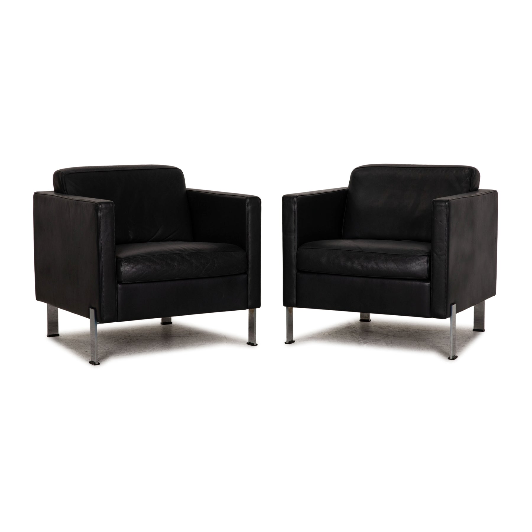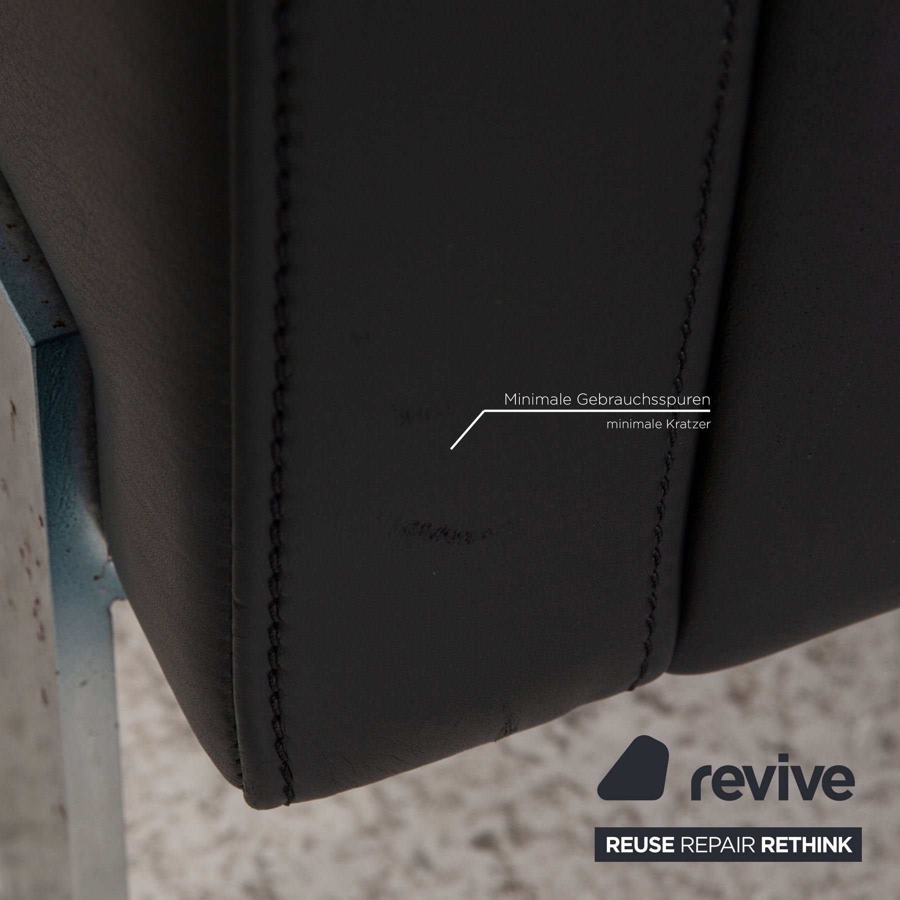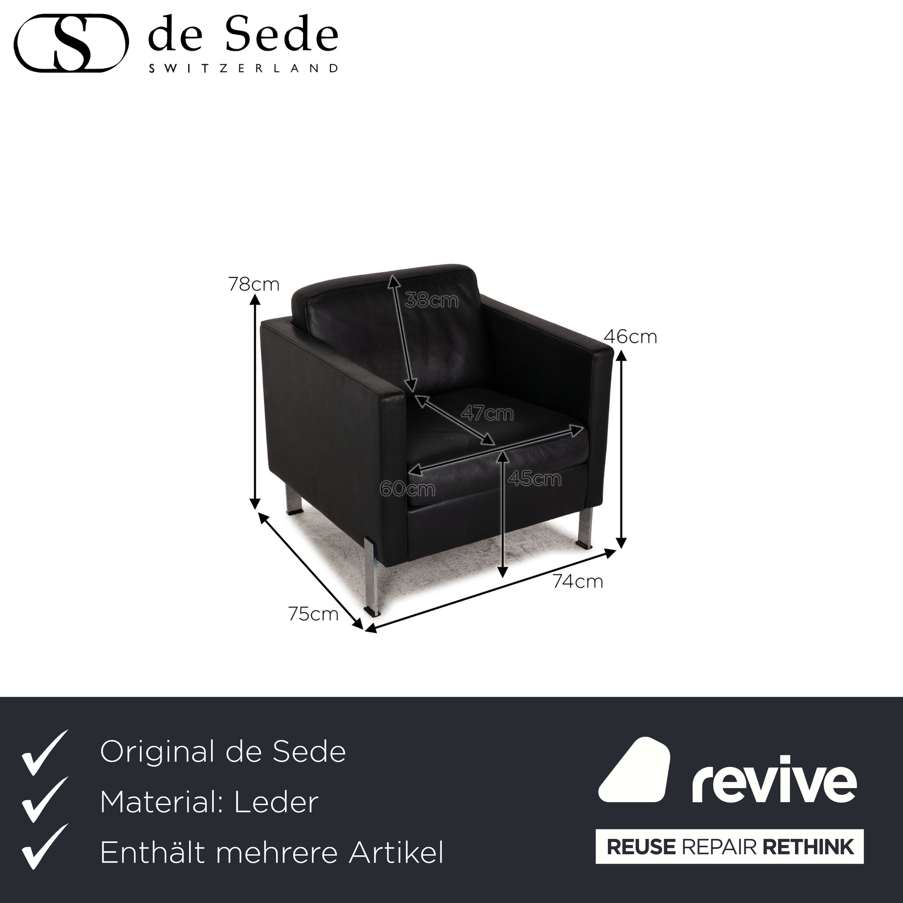 Die ds 118 Sessel Garnitur von de Sede ist mit einem schwarzen Echtleder bezogen und steht auf silbernen Metallfüßen. Das schlichte, minimalistische Design und die abgerundete Sitzfläche zeichnen sie aus.