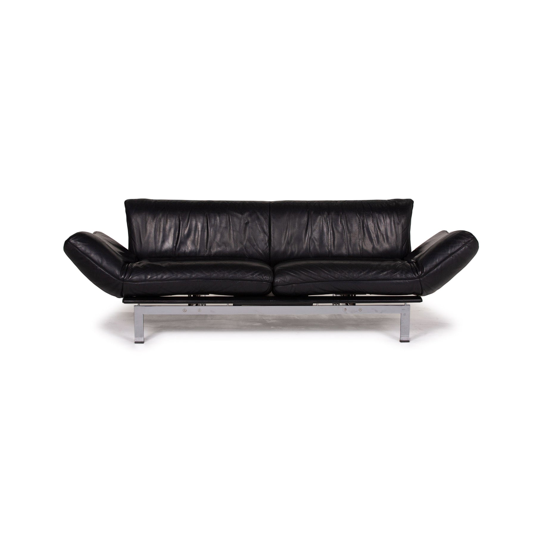 Das DS 140 Sofa von de Sede ist mit einem schwarzen Echtleder bezogen und steht auf einem modernen Metallgestell. Die Sitzflächen und Armlehnen können nach vorne gedreht werden, sodass der Dreisitzer in eine Relaxposition gebracht werden kann.