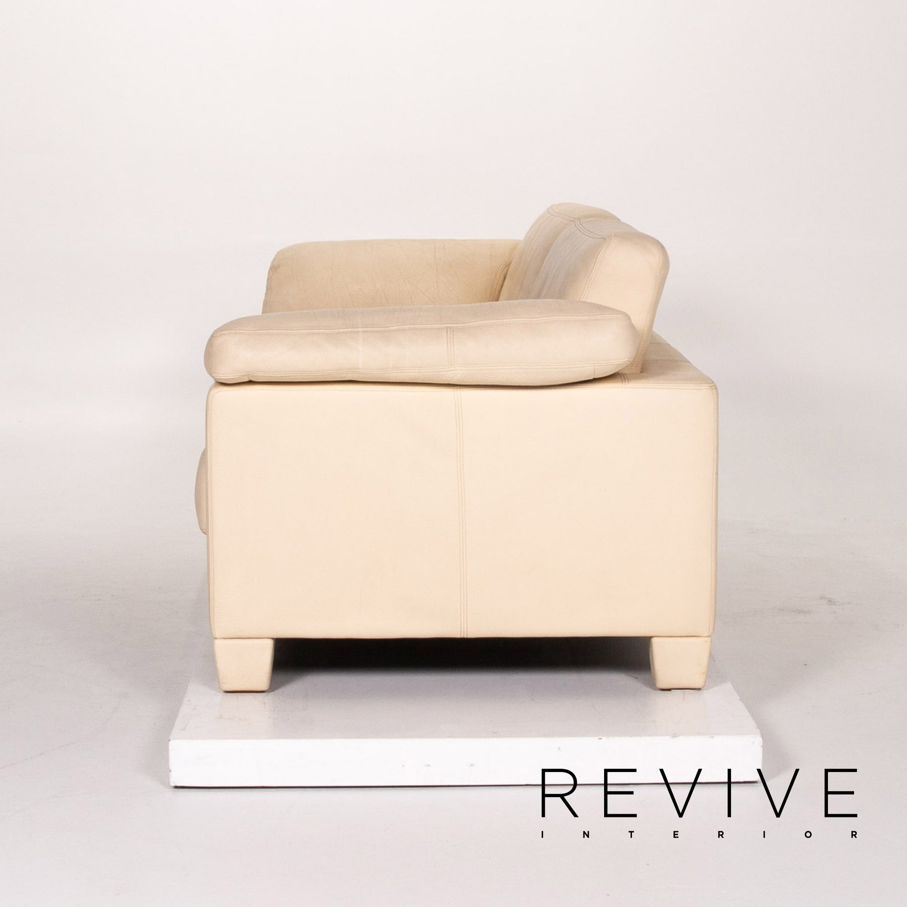 Der DS 17 Dreisitzer ist mit einem cremefarbenen Glattleder bezogen und zeichnet sich durch ein zeitloses, kubisches Design aus.