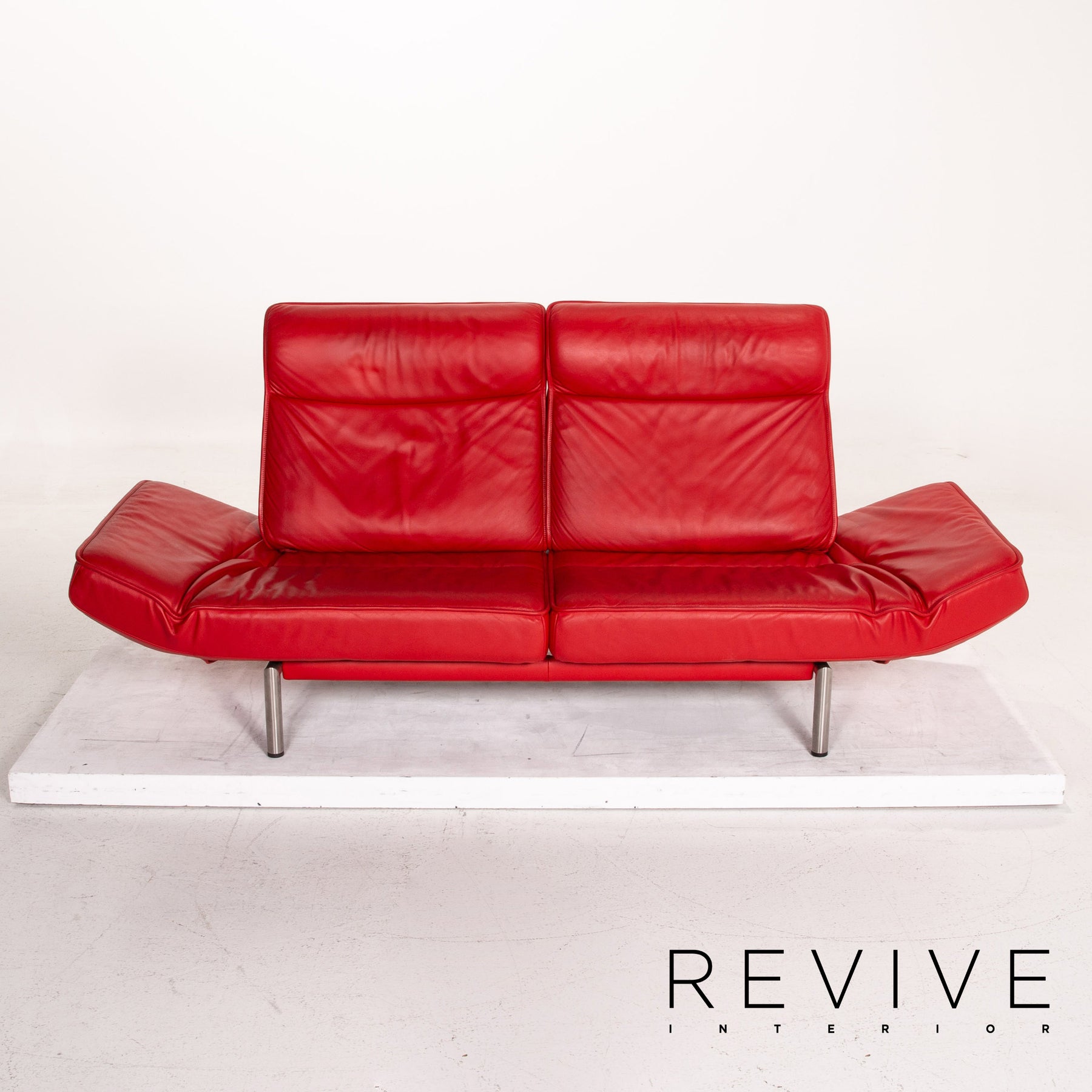 Der de Sede Klassiker DS 450 ist mit einem roten Echtleder bezogen und kann in eine Relaxposition gebracht werden. Die zeitlose, edle Form und die schmalen, hohen Aluminiumfüße lassen den Zweisitzer modern und schlank erscheinen.